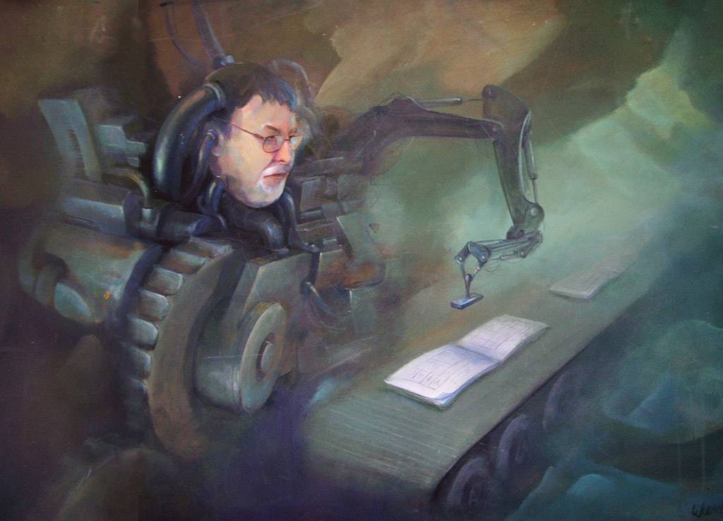 Obraz przedstawia futurystyczną scenę, gdzie dominują chłodne, metaliczne kolory – zgaszone zielenie i stalowe odcienie szarości. Centralnym elementem jest twarz mężczyzny z inteligentnym spojrzeniem, wbudowana w maszynę przypominającą jakieś dziwne połączenie człowieka z technologią. Wielkie, stalowe koła i ramię robota przywodzą na myśl science fiction. Kompozycja jest dynamiczna, jakby coś właśnie miało się wydarzyć, a delikatne światłocienie dodają głębi i tajemniczości. Atmosfera jest jednocześnie chłodna i fascynująca. Czujesz się jak w innej rzeczywistości, gdzie ludzie i maszyny współegzystują w symbiotycznym związku. Artysta posługuje się techniką realistyczną z nutką surrealizmu, dodając subtelne szczegóły, które pozwalają widzowi na chwilę się zatrzymać i zastanowić nad przyszłością. Obraz może wywoływać różnorodne emocje – od zdumienia po niepokój. Czy technologia przejmie kontrolę nad człowiekiem? To pytanie może niewidocznie się kołacze w głowie oglądającego. Look, jest tu coś intrygującego, co zmusza do refleksji nad naszą przyszłością. "Wow, to jest super - jak roboty!" mogłoby powiedzieć dziecko. Osobiście czuję się zafascynowany i lekko onieśmielony wizją artysty. To jedno z tych dzieł, które zostaje w pamięci na długo.