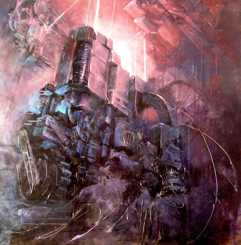 Obraz emanuje futurystycznym klimatem, pełnym intensywnych odcieni purpury i niebieskiego. Centralnym punktem jest masywny, geometryczny kształt, który przypomina skomplikowaną maszynerię unoszącą się w przestrzeni. Kompozycja jest chaotyczna, ale jednocześnie wskazuje na pewien porządek wśród chaosu. Ciepłe, różowe światło, które przebija się przez górną część obrazu, dodaje tajemniczości i głębi, podkreślając niektóre detale konstrukcji. Artystyczna technika przypomina nieco impresjonizm skrzyżowany z elementami science fiction. Pociągnięcia pędzla są dynamiczne, co nadaje dziełu ruchu, a zarazem nieuchronności. Obraz wywołuje ciekawość i niepokój, jakbyśmy stali przed monumentalnym odkryciem, którego znaczenia jeszcze nie rozumiemy. Patrząc na to dzieło, można odczuć, jakbyśmy przenosili się do świata, w którym technologia i sztuka łączą się w niespotykany sposób. To takie trochę "amazing", jakby powiedzieli ludzie na Zachodzie. Dziecko mogłoby powiedzieć: "To wygląda jak wielki robot z kosmosu!". Cały obraz jest jak sen na jawie, pełen niepewności, ale i fascynacji. Może skłonić odbiorcę do refleksji nad przyszłością, w której granice między naturą a technologią zacierają się, tworząc nową rzeczywistość. Naprawdę, patrząc na to, można się zagubić w marzeniach.