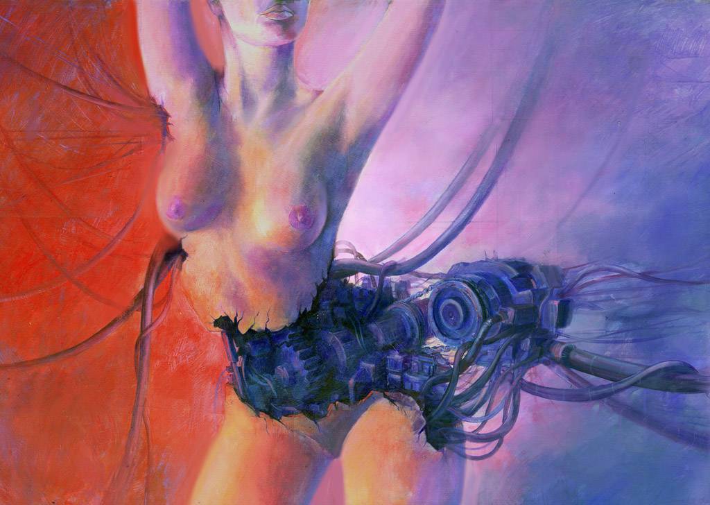 Obraz zaskakuje mocnym kontrastem między ciepłymi odcieniami pomarańczu a chłodnymi fioletemi, które przenikają przez całą kompozycję. Na pierwszym planie jest postać, prawdopodobnie android, z częściowo odkrytą maszynerią. Kształty są gładkie, a linie przepływają płynnie. Wow, jak robot! Atmosfera jest surrealistyczna, z nutą futurystycznej tajemnicy. Styl artystyczny przypomina nieco science fiction z odrobiną ekspresjonizmu, gdzie artysta wykorzystuje smugi kolorów i oświetlenia, żeby podkreślić granice między człowiekiem a maszyną. Można poczuć pewne napięcie, a może nawet zakłopotanie tym, jak krucha jest linia między tymi światami. To dzieło zmusza do refleksji nad naturą człowieczeństwa i technologią. Widz patrzy na tę mieszankę z fascynacją, ale i niepokojem. Czy to nasza przyszłość, czy może koszmar artysty? Ten obraz to trochę jak sen, który zaciera granice między rzeczywistością a fantasy. Dla mnie osobiście jest jak ziarenko ciekawości, które kiełkuje w głowie, kwestionując naszą zależność od technologii. To rollercoaster emocji, bo każdy znajdzie tutaj coś dla siebie. Może nawet lekki strach przed tym, co nas czeka w digital age.