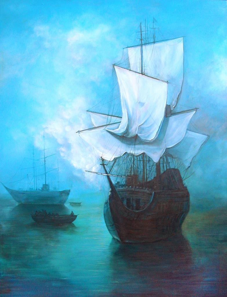 Obraz przedstawia majestatyczny żaglowiec unoszący się na spokojnych wodach. Dominuje tu głęboki błękit, który w połączeniu z bielą żagli nadaje całości chłodny, spokojny klimat. Żagle falują w lekkim wietrze, zdające się niemal dotykać nieba. Kompozycja jest harmonijna, statki poukładane jak w spokojnym śnie. Artysta użył delikatnych pociągnięć pędzla, aby oddać ulotność chwili i aurę tajemniczości. Czasem marzymy, patrząc na takie obrazy! Technika impresjonistyczna przejawia się tutaj w miękkich konturach i rozmytych kształtach. Obraz niesie ze sobą spokój, ale i nutkę tęsknoty za przygodą. Dzieciak powiedziałby: to statek piratów! Choć niebo jest pogodne, to niewidoczna moc mórz zdaje się czekać na swoją kolej. Część mnie wspomina długie, letnie dni spędzone na plaży. Patrzenie na to dzieło to jak podróż w czasie, back to childhood. Zobaczenie takiego widoku może budzić chęć zanurzenia się w przeszłości. Atmosfera jest jak sen, z którego nie chcesz się budzić.