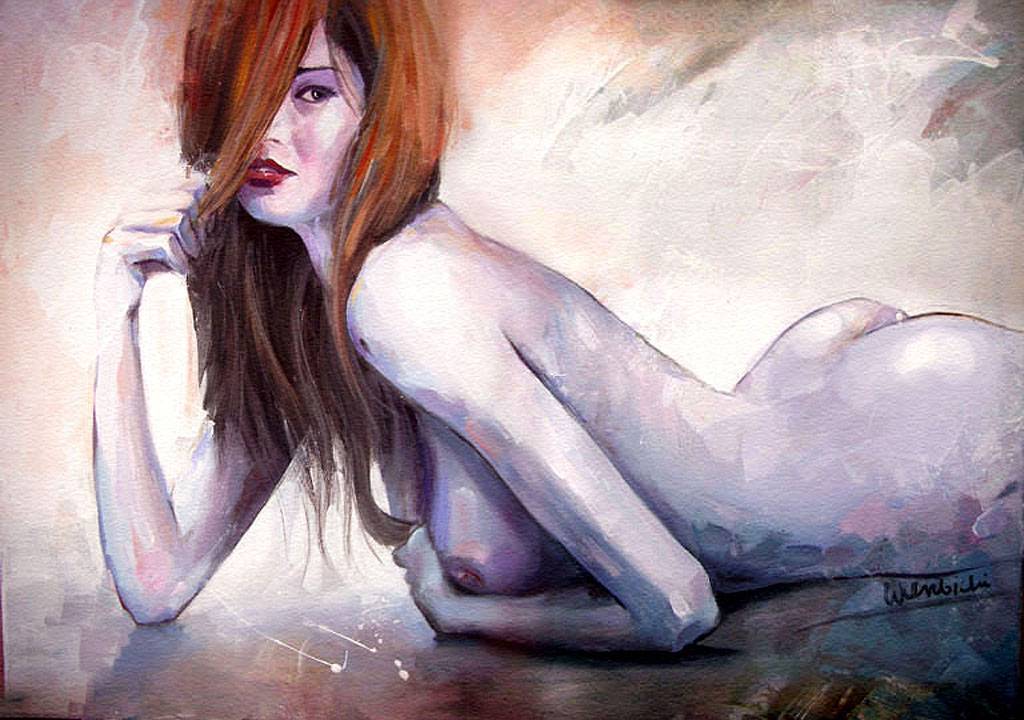 Obraz ukazuje subtelnie wykreowaną postać leżącej kobiety, na tle pastelowych tonów. Dominują odcienie bieli, fioletu i delikatne brązy, co tworzy swoistą mgiełkę tajemnicy. Długie, rude włosy opadają z gracją na twarz postaci, dodając jej nutę zmysłowości i zawadiackiej elegancji. Kompozycja jest wyważona, a wzrok odbiorcy naturalnie skupia się na wyrazistym spojrzeniu kobiety. Atmosfera obrazu jest melancholijna, lecz niepozbawiona ciepła. Emocje, które wywołuje to dzieło, wahają się od zachwytu po nostalgię. Styl artystyczny to połączenie finezyjnego realizmu z nutką impresjonizmu. Malarz z dużym wyczuciem użył pociągnięć pędzla, aby uchwycić grę światła i cienia, co nadaje scenie trójwymiarowości. Niby na płótnie, a jakby na żywo. Wow, to wygląda jak prawdziwa pani! Obraz może budzić różne uczucia – od melancholii po fascynację. Skłania do refleksji nad ulotnością chwili. Może zainspirować do zadumy, jakby artysta mówił: "take a moment to breathe". Ten obraz to jak rozmowa szeptem, pełna niewypowiedzianych emocji. Z każdym spojrzeniem można dostrzec coś nowego. Dzieło jest tak realistyczne, że niemal słychać oddech modelki. W sumie, piękne połączenie emocji z techniką.