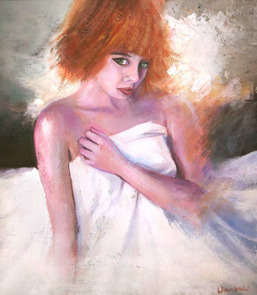 Na obrazie widzimy kobietę z rudymi włosami, które stoją w kontrastach z jej jasną cerą i białą tkaniną, którą przytrzymuje przy sobie. Jej zielone oczy patrzą wprost na widza, co daje poczucie, że chce coś powiedzieć, ale pozostaje milcząca. Tło obrazu jest delikatnie rozmyte, z mieszanką szarości i bieli, co dodaje scenie subtelności i delikatnego cienia. Styl malarski jest luźny i pełen ekspresji, z pociągnięciami pędzla widocznymi na powierzchni, co nadaje obrazowi teksturę i głębię. Na pierwszy rzut oka, atmosferę obrazu można określić jako intymną i refleksyjną. Jest w tym coś nieuchwytnego, jakby chwila zatrzymania w czasie. Techniki artystyczne użyte w tym dziele, takie jak gra świateł i cieni oraz zastosowanie pastelowych barw, skutkują obrazem, który jest jednocześnie prosty i złożony. Siedmiolatek mógłby powiedzieć: "Ona wygląda jak wróżka z bajki!". Obraz może wywołać w odbiorcy całą gamę emocji - od nostalgii, przez zadumę, po ciekawość. Podziwiając ten obraz, czujemy tę specyficzną więź z postacią, jej tajemnicę. Może ona jest głęboko zamyślona, a może po prostu zasłuchana w jakąś magiczną melodię. W oczach widzę coś więcej niż tylko kolory - jest tam cała opowieść. Ten "piece of art" potrafi zatrzymać uwagę na długo, prowokując do refleksji nad nieuchwytnością emocji zapisanych w spojrzeniu.