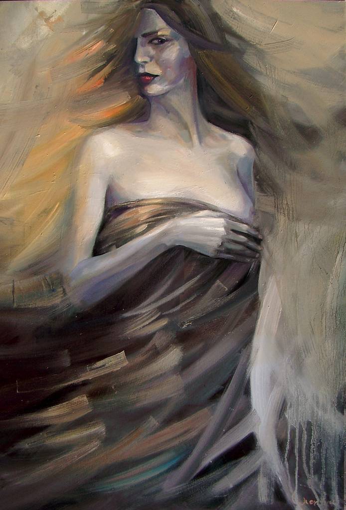 Obraz emanuje niezwykłą aurą tajemniczości. Dominują na nim spokojne, stonowane barwy: ciepłe brązy, chłodne szarości i ożywcze odcienie skóry. Kompozycja jest dynamiczna, jakby postać wychodziła z mgły, z włosami rozwianymi delikatnym wiatrem. Wygląda jak postać z baśni, jej spojrzenie jest przenikliwe i pełne czegoś nieuchwytnego. To jest takie magiczne! Artystyczny styl zdradza wpływy impresjonizmu z lekkością pociągnięć pędzla i niewyraźnym konturem. Faktury są miękkie, a całość wydaje się płynna, niemal jakby patrzeć przez zamglone okno. Kurcze, coś pięknego! Czuję lekki niepokój, jakby bohaterka obrazu miała zaraz opowiedzieć ciekawą historię – whispered tales of the past. To mieszanka nostalgii i niedopowiedzenia. Czy to smutek, zaduma, a może spokój? Mimo prostoty, obraz pozostawia duże pole do interpreacji. Nie mogę przestać się zastanawiać: kim ona jest i co myśli?