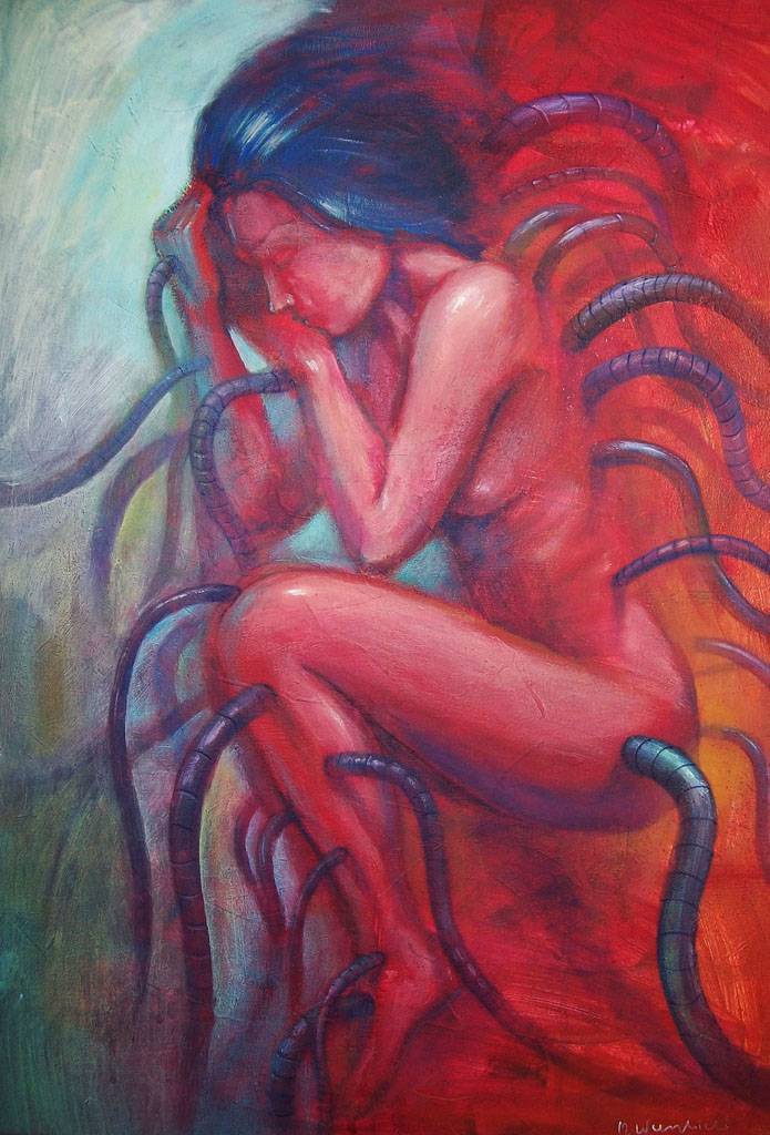 Na obrazie widzimy postać kobiecą owiniętą ciemnymi mackami, które wiją się wokół niej niczym wąż. Dominującą kolorystyką są intensywne odcienie czerwieni i chłodne błękity. Te kolory tworzą dynamiczny kontrast, który przyciąga uwagę i dodaje dramatyzmu kompozycji. Tło rozmywa się w zlepkach barw, a całość sprawia wrażenie zanurzenia w surrealistycznym świecie. Atmosfera dzieła jest pełna napięcia i tajemniczości. Wydaje się, że postać znajduje się w stanie introspekcji lub osobistego konfliktu. Styl artystyczny to mieszanka ekspresjonizmu i surrealizmu. Technika użyta przez artystę zachwyca swobodą pociągnięć pędzla i dbałością o detale. Obraz może wywoływać różnorodne emocje. Czy to strach, czy fascynację? Bo ja nie wiem! To zmusza do refleksji nad własnymi zmaganiami wewnętrznymi. "Wow!" mówiłoby dziecko. Tempo narracji zmienia się, przez co obraz nabiera życia i charakteru. Osobiście, widząc ten obraz, czuję wewnętrzny niepokój, ale także dziwną ulgę – jakbym mógł się zgubić w tych kolorach. Jej zamyślone spojrzenie mnie hipnotyzuje... To jest właśnie "power" sztuki.