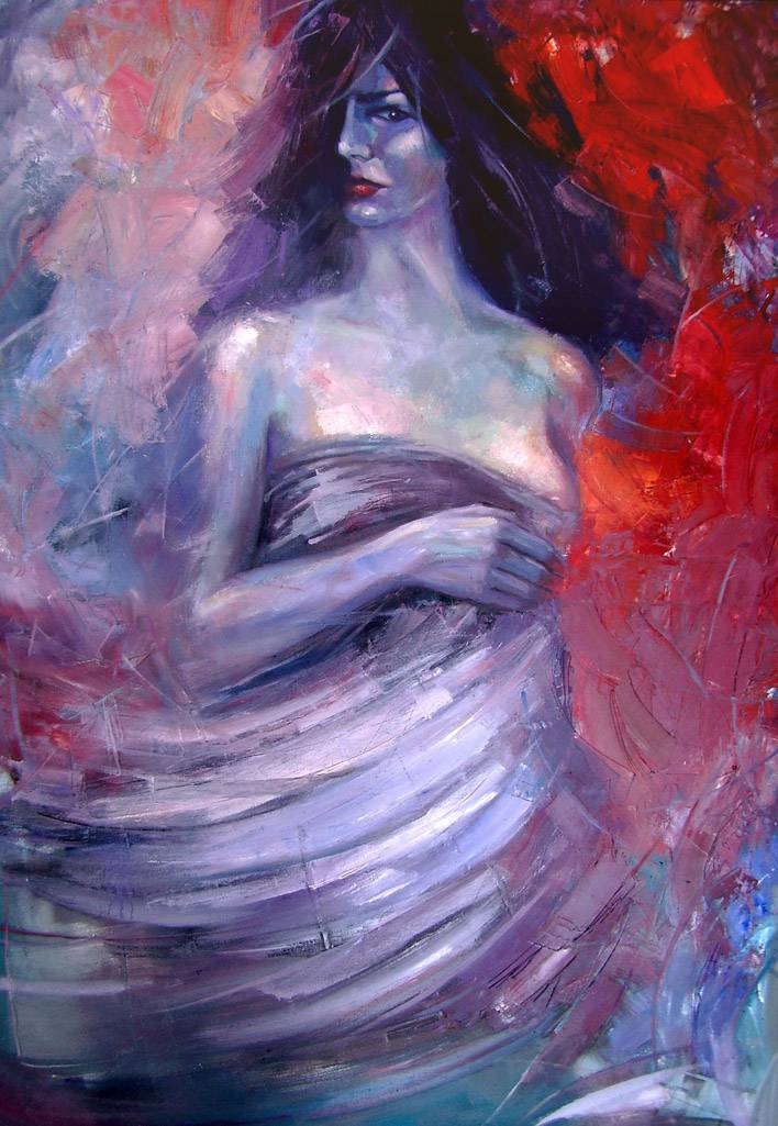 Na obrazie dominuje paleta barw pełna intensywnego czerwieni i chłodnego fioletu, które zdają się przenikać i tańczyć wokół postaci. Ta centralna postać, otulona wiatrakowym splotem tkaniny, emanuje zarówno siłą, jak i delikatnością. Kompozycja obrazu jest dynamiczna, z ostrymi pociągnięciami pędzla, które dodają całości ruchu. Artysta skorzystał z techniki impasto, która dodaje fakturze głębi, dając wrażenie trójwymiarowości. Atmosfera jest pełna tajemnicy i napięcia, niczym mgła unosząca się nad nocnym miastem. Czuć tu zawirowanie uczuć, może nostalgia... może coś więcej. Patrząc, czuję, że obraz mówi coś o splątanych ludzkich emocjach. To trochę jak patrzenie na burzę, która zaraz ucichnie. Moje serce porusza sposób, w jaki ciemna paleta kontrastuje z jasnością postaci—jedną refleksją światła w chaosie. Może, just maybe, mówi to o kontraście między wewnętrznym a zewnętrznym światem. Dziecko powiedziałoby: "Pani wygląda jak księżniczka z bajki". W tym obrazie coś mnie przyciąga, jakby było w nim coś znajomego yet innego za każdym razem, gdy patrzę.