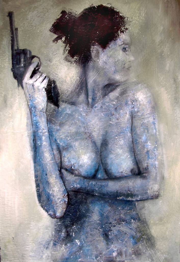 Na obrazie widzimy kobietę, której skóra zdaje się być pokryta błękitnym blaskiem. To jakby artysta zaprosił śnieg na płótno. Dominują zimne odcienie błękitu i bieli, które kontrastują z brunatnymi włosami splecionymi w niedbały kok. Kompozycja jest dość prosta, ale zwraca uwagę – kobieta trzyma pistolet, spoglądając tajemniczo w bok. Atmosfera dzieła jest pełna napięcia, jakby zaraz miało się coś wydarzyć. Czuć w tym obrazku echo thrillera. Styl, który artysta wybrał, to połączenie impresjonizmu i ekspresjonizmu. Ślady pędzla wydają się chaotyczne, dynamiczne, ale nadają pracy głęboko emocjonalny ton. Ta faktura, rough i chropowata, dodaje intensywności. Widz patrzy i zastanawia się: o co tu chodzi? Może to wspomnienie, może nadzieja na lepsze jutro. Obraz wzbudza wiele pytań. Kiedy patrzę na obraz, czuję się zaintrygowany, trochę jakbym oglądał fragment filmu akcji. Trochę stracha mam. Coś jak w dowolnym „action movie”, kiedy wiesz, że za chwilę będzie się działo. Może ona kogoś szuka? Może przed kimś ucieka? A może to w ogóle sen dziecka – wiesz, taki nie do końca zrozumiały jak sen o lataniu. Pewne jest jedno – obraz pozostaje w głowie na długo, zostawiając widza z mnóstwem emocji.