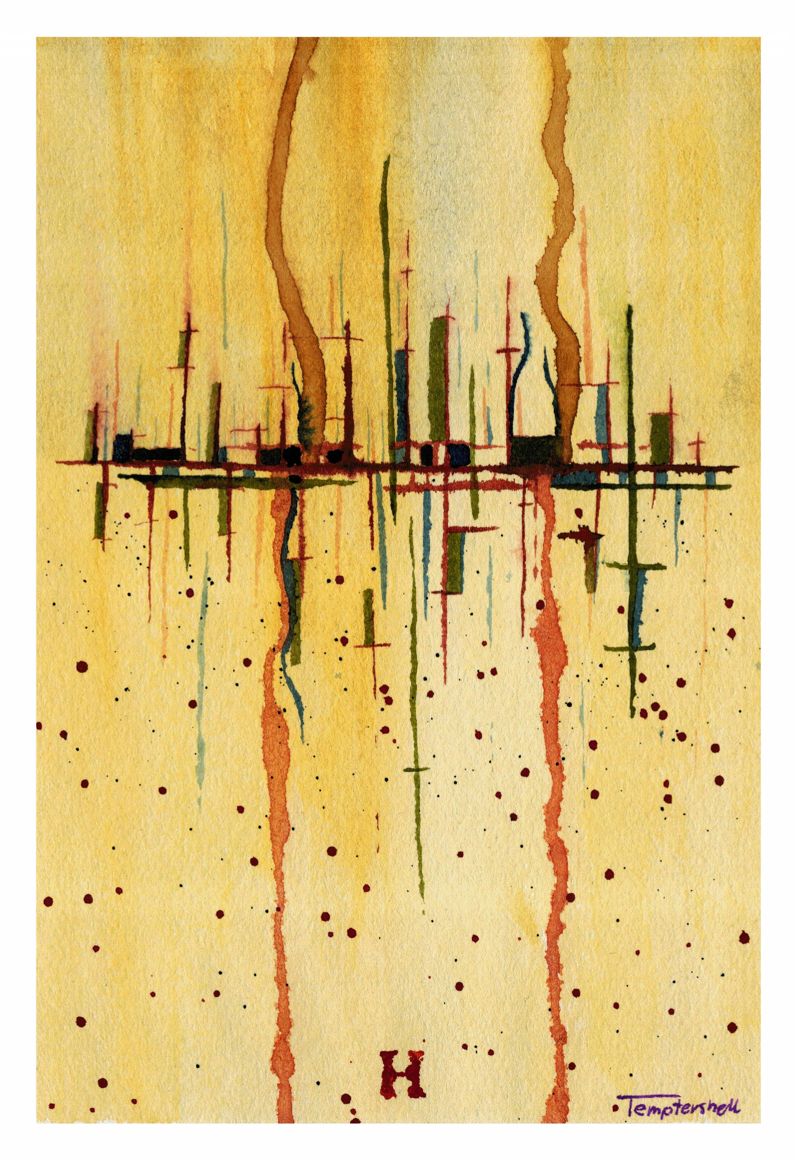 Obraz to prawdziwa eksplozja kolorów i form. Dominują odcienie żółci i brązu, przetykane czerwonawymi pionowymi liniami niczym pnącza zygzakiem na ścianie. Kompozycja jest dynamiczna, z liniami przecinającymi się na tle przypominającym akwarelową mgłę. Wszystko to tworzy atmosferę tajemnicy, jakbyśmy patrzyli na miasto we mgle. Czuję tu jakąś magiczność, jakby ten obraz oddychał sam. Artysta użył techniki watercolor, co dodaje dziełu lekkości i fluidności. Czułem, że mogę w tym obrazie utonąć! Emocje, które wzbudza, są mieszane. Z jednej strony spokój i harmonia, z drugiej chaos i niepewność. To tak, jakby świat równoległy ukryty za firanką mgły. Wyobraź sobie, że to jest skyline jakiegoś magic city. Technika jest surowa, nieco ekspresyjna, bez dbałości o perfekcję formy. Może to nie jest dla wszystkich, ale ja to lubię. 7-letnie dziecko powiedziałoby: To wygląda jak plama, ale fajna! Ja tak myślę. Obraz pozwala zanurzyć się w innej rzeczywistości i działa jak "portal". Ma w sobie coś, co każe mi się zatrzymać i pomyśleć.