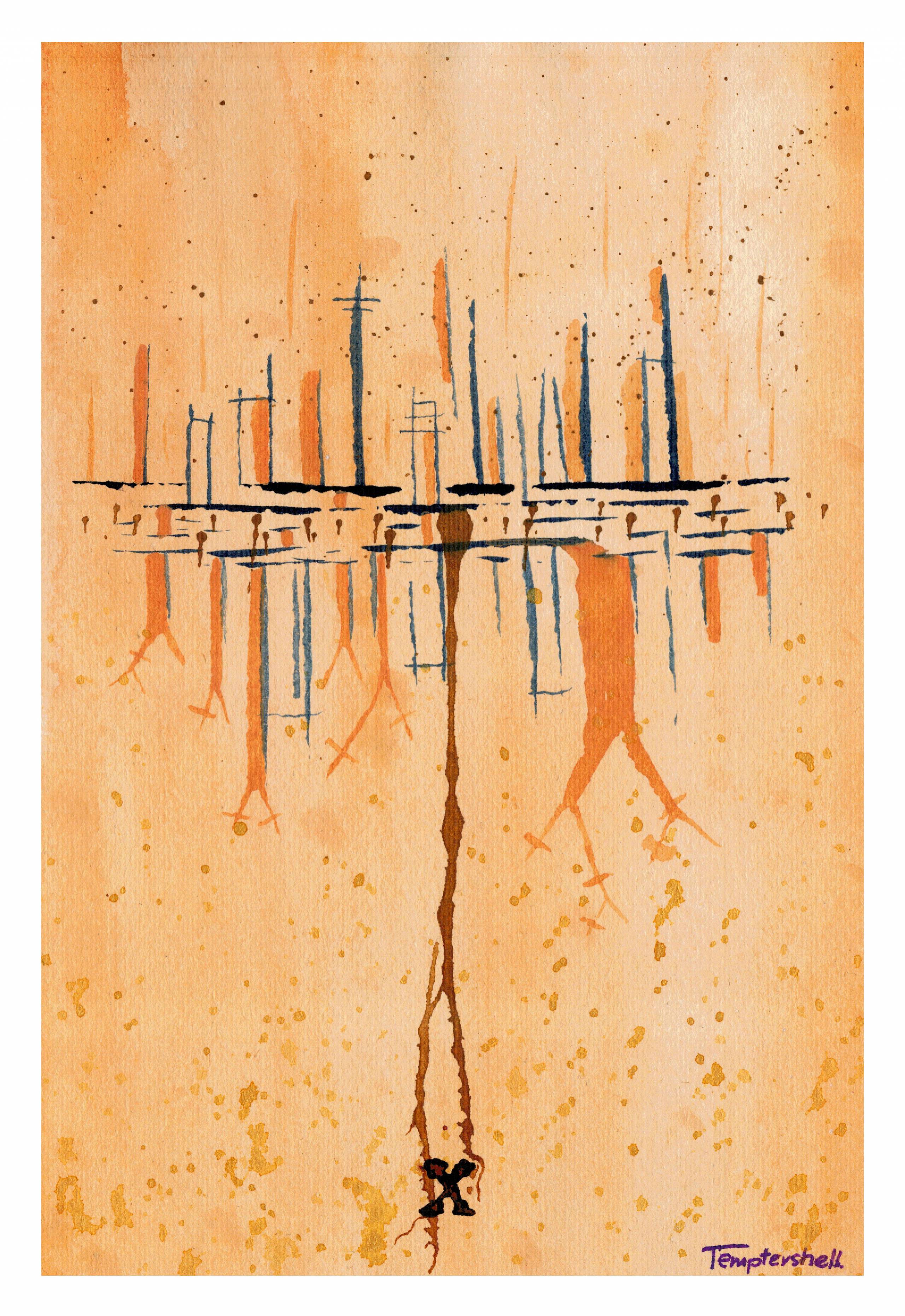 Obraz jest fascynującym połączeniem prostych kształtów i subtelnych kolorów. Na pierwszy rzut oka widać ciepłe tony pomarańczowego tła, przypominające zachodzące słońce na pustyni. Na tym tle widnieją delikatne liniowe formy w odcieniach czerni i niebieskiego. Wyglądają jak abstrakcyjne wieże czy drzewka, odbijające się tajemniczo jakby w kałuży lub lustrze. Tworzą one intrygujący rhythm. Atmosfera jest spokojna, niemalże medytacyjna, ale wprowadza również pewien niepokój poprzez swoją surrealistyczną kompozycję. Artysta zastosował technikę akwareli, co nadaje dziełu lekkości i przejrzystości. Rozmyte krawędzie, drobne plamki, wszystkie te elementy są jakby przemyślane chaotycznie. To taki controlled chaos. Emocje jakie może wywoływać ten obraz to spokój pomieszany z nutą refleksji nad życiem i jego odbiciem. Dziecko powiedziałoby: "Drzewa w wodzie lubią tańczyć". I w tym jest coś niezwykle prawdziwego. Każdy element zdaje się być na swoim miejscu, choć jednocześnie w nieustannym, delikatnym ruchu. Patrząc na to dzieło można poczuć się jakby było się częścią jakiejś surrealistycznej opowieści, w której wszystko jest możliwe.