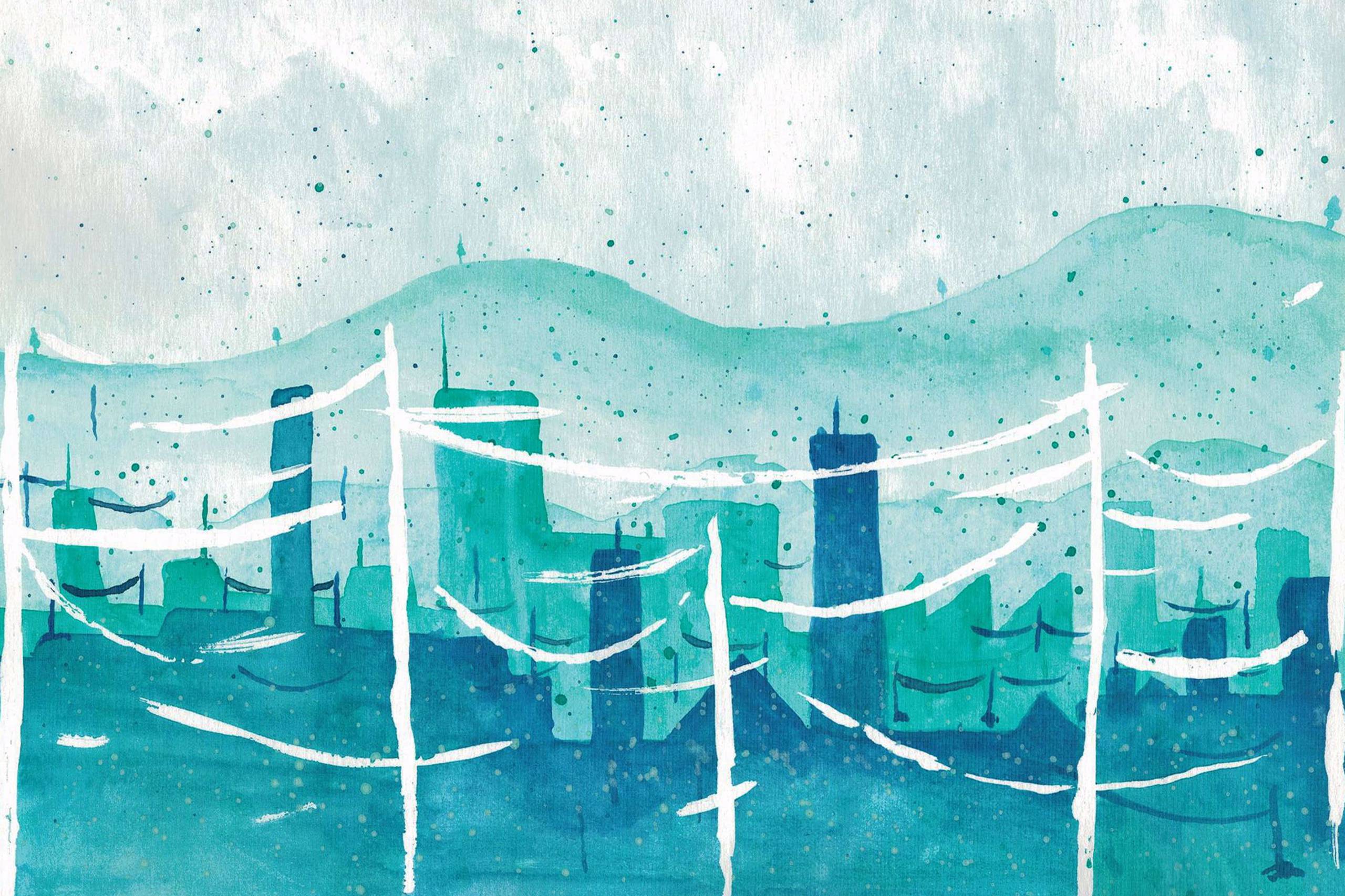 Na obrazie dominuje chłodna paleta błękitów i turkusów, które tworzą senną, niemalże uspokajającą atmosferę. Kompozycja wydaje się być zamglona, jakby widziane przez zasłonę deszczu, z białymi liniami przypominającymi kable telefoniczne wijącymi się na pierwszym planie. Kształty budynków w tle są ledwie zarysowane, nadając miastu tajemniczości. Przez te delikatne pociągnięcia pędzla, artysta osiągnął efekt mgławicy, łącząc delikatność akwareli z prostotą minimalizmu. Obraz emanuje spokojem, ale i nutą nostalgi. Można zauważyć technikę rozmywania kolorów, co nadaje całości dreamlike feel. Człowiek patrzy na to i czuje, jak jego myśli unoszą się gdzieś daleko, nieosiągalne. Mały Tomek by powiedział: „To wygląda jak bajkowe miasto za chmurką!”. Odbiorca może poczuć lekkość, może też zatęsknić za ciszą wielkich przestrzeni. Dla jednych to pustka, dla innych ucieczka od zgiełku dnia codziennego. Taki kawałek sztuki, co skłania do zastanowienia.