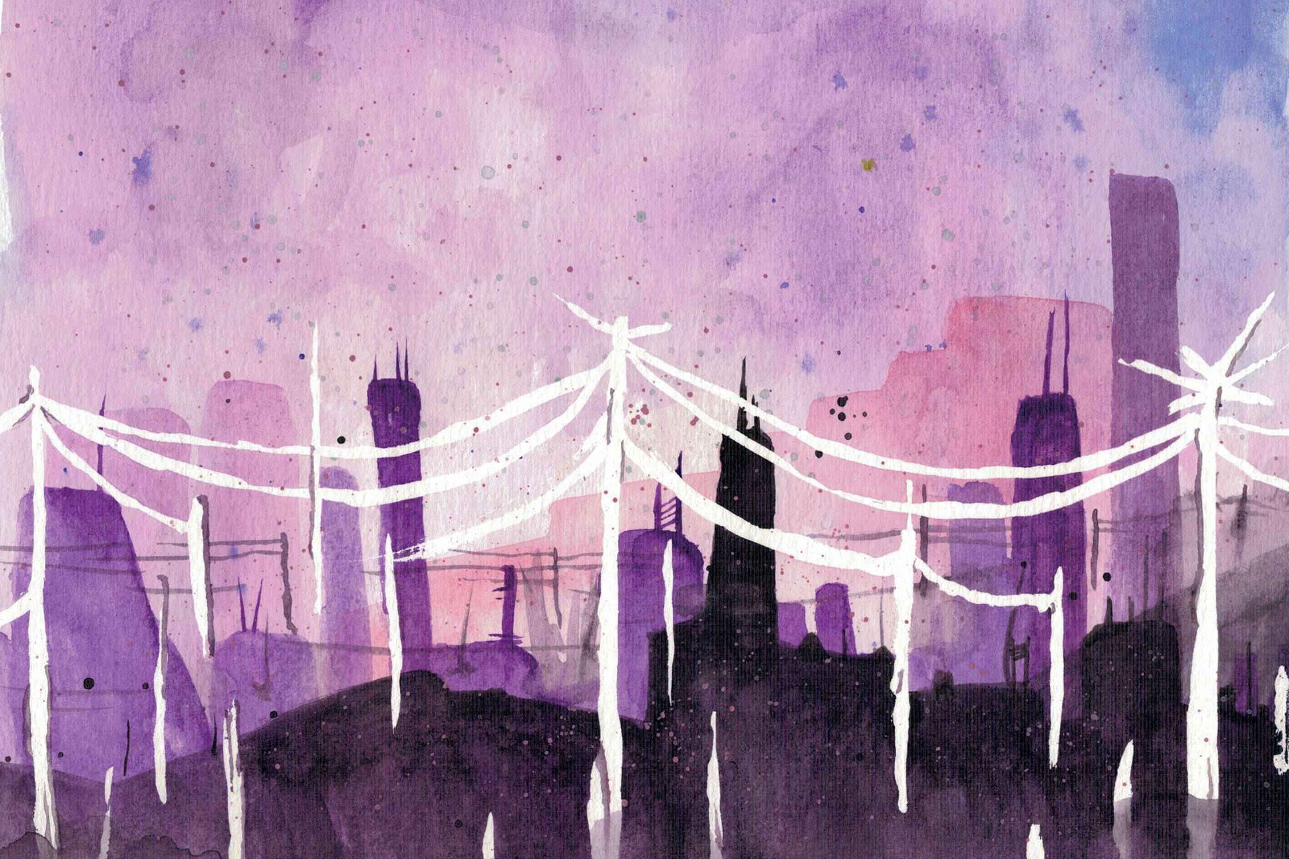 Na obrazie dominują delikatne odcienie fioletu i różu, które płynnie przenikają się w malowniczy krajobraz miasta. Sylwetki budynków zarysowane są czarną barwą, przywodząc na myśl tajemniczy mrok nocy. Białe linie przypominające druty elektryczne przecinają obraz, nadając mu nowoczesnego sznytu. Całość tworzy swoistą kompozycję, w której chaos i harmonia tańczą wspólnego walca. Atmosfera dzieła jest nieco oniryczna, jakbyśmy patrzyli na miasto przez różowe okulary. Nastrój emanuje spokojem, ale i intrygą. Styl artysty jest raczej abstrakcyjny, wykorzystujący akwarelowe rozmycia i subtelne plamy. Technika ta pozwala na stworzenie efektu dreamlike, który przyciąga wzrok. Obraz może wywoływać u widza poczucie nostalgii za przyszłością lub odległą przeszłością. Myśli błądzą, zastanawiając się, jakie tajemnice kryją się za tymi wieżowcami. Dziecko mogłoby powiedzieć "Czy to miasto jest zaczarowane?" Osobiście, gdy patrzę na to dzieło, czuję się jakbym przechadzał się ulicami cyberpunkowego świata z książki science fiction. Jest w tym coś romantycznego i nieuchwytnego, almost magical.