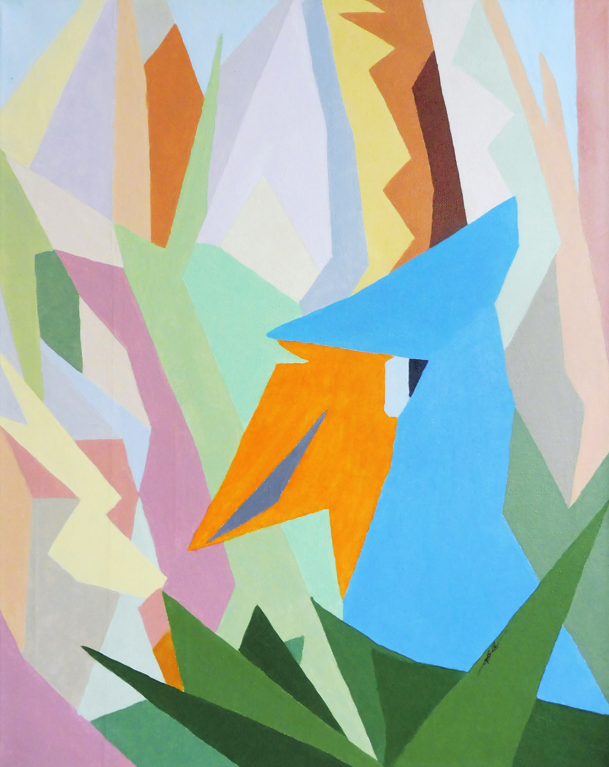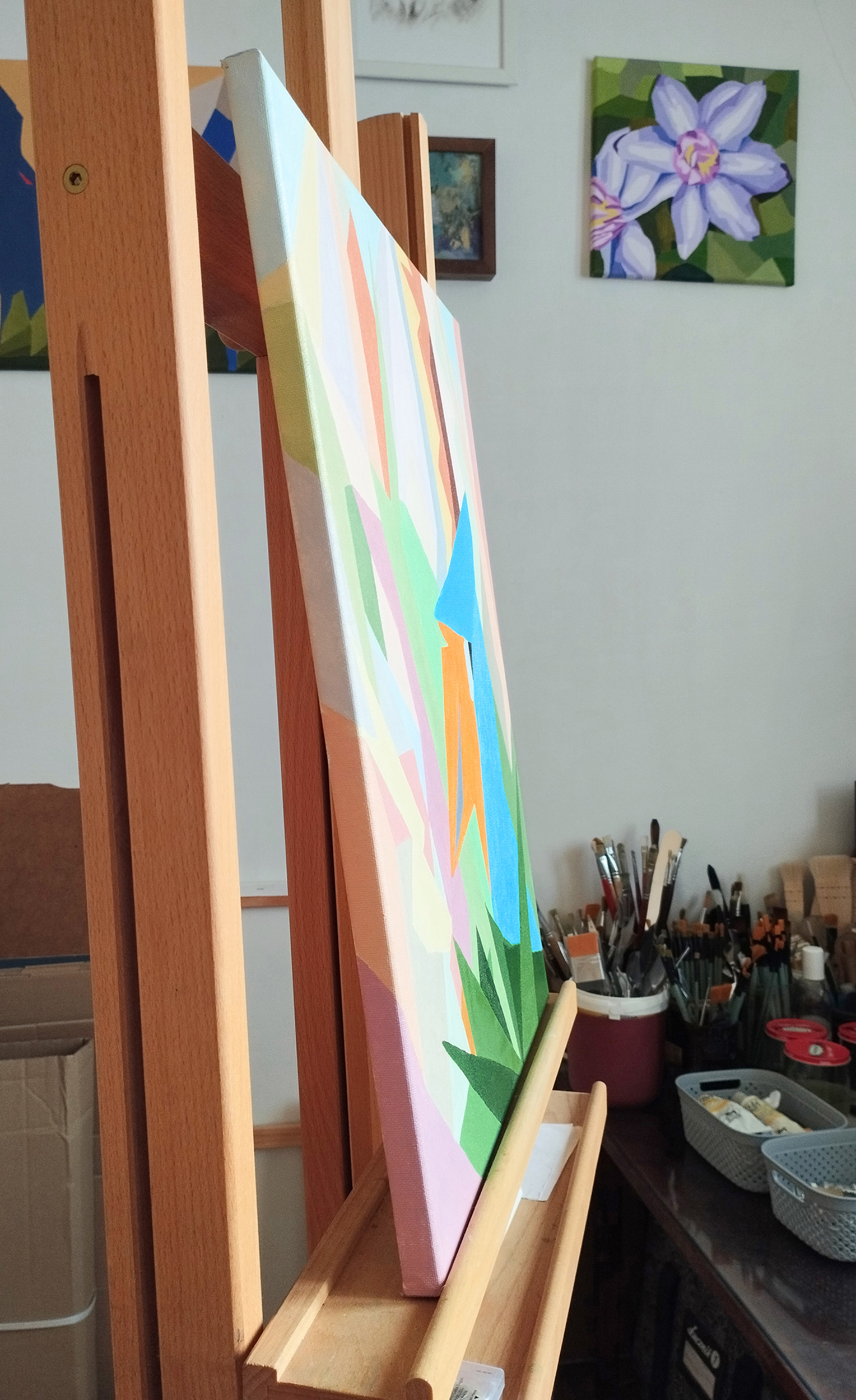 Obraz przywodzi na myśl letni poranek pełen energii i życia. Dominują tu intensywne kolory: turkusowy, pomarańczowy i zieleń, które przeplatają się ze sobą w dynamicznej kompozycji geometrycznych kształtów. Wygląda to trochę jak fragment układanki, gdzie każdy element pasuje idealnie na swoje miejsce, ale zarazem wywołuje poczucie chaosu. Artysta, zdaje się, wykorzystał technikę kolażu, tworząc iluzję trzeciowymiarowości poprzez kontrastujące ze sobą tony. Atmosfera jest pełna optymizmu, ale czy nie czujesz lekkiego niepokoju? Może to przez te ostre linie, które jakby cię atakują. Patrząc na ten obraz, zastanawiam się, czy tło symbolizuje coś głębszego. Może to metafora życiowych wyzwań, a może po prostu, "bo tak." Ale wiesz co, moja siostra powiedziała, że to wygląda jak duży ptak. Obraz wręcz krzyczy "freedom" i zachęca do swobodnej interpretacji. Można poczuć, jakby te kolory chciały wyskoczyć z płótna. Czuję radość, ale i zaskoczenie. Interesujące jest to, jak z takich prostych form i kolorów można wyciągnąć tak wiele emocji. To dzieło, które mówi do nas, nakłania do zastanowienia się, co naprawdę widzimy.
