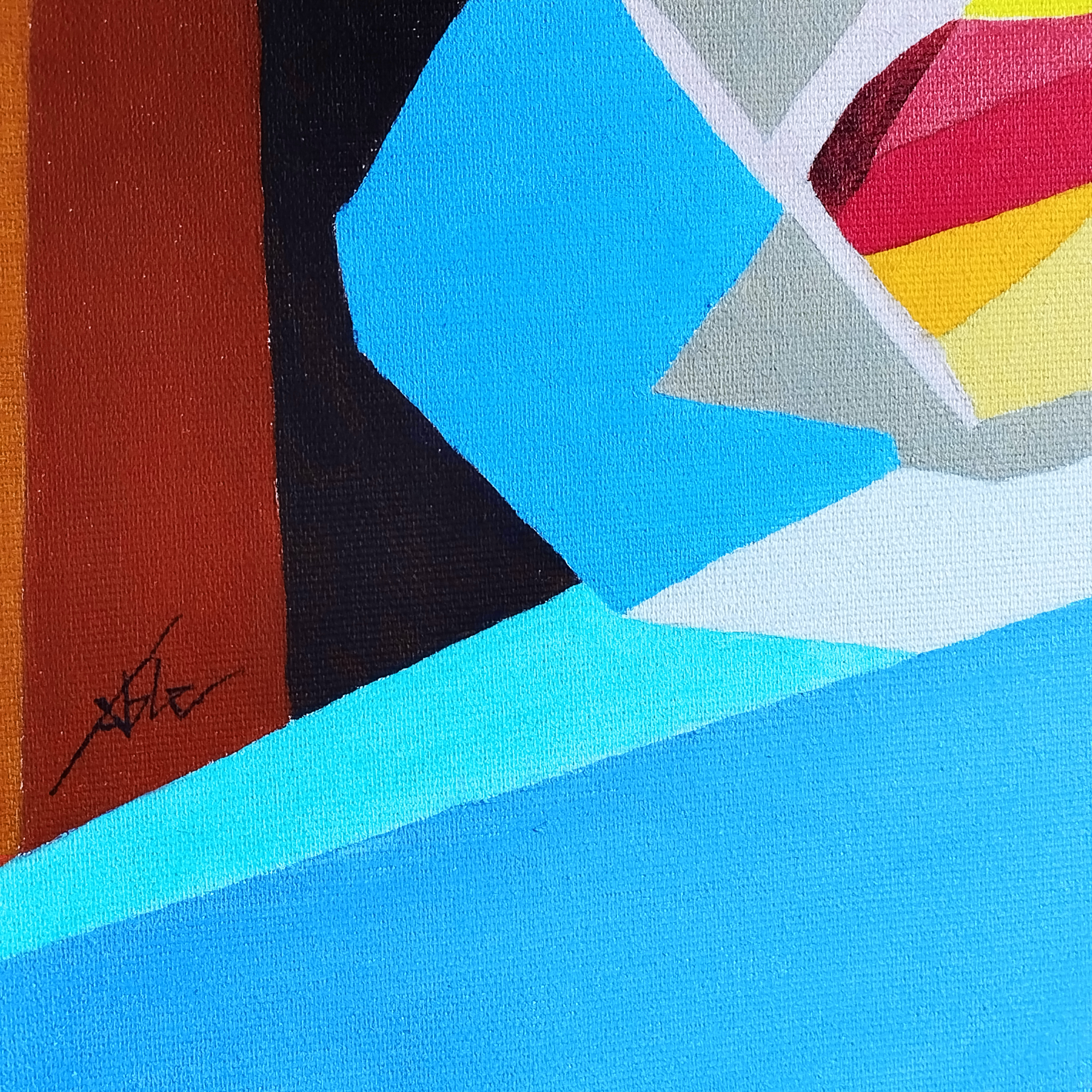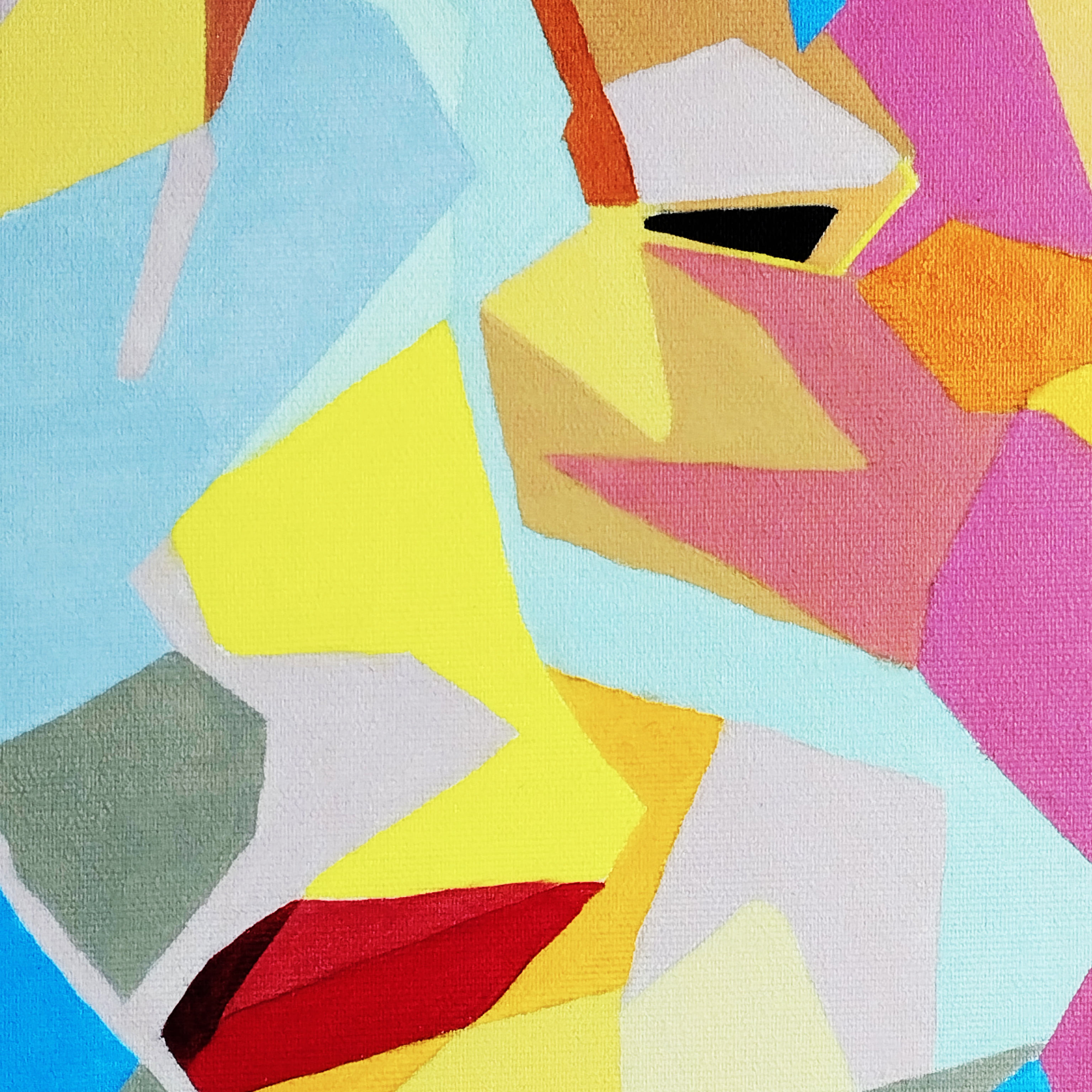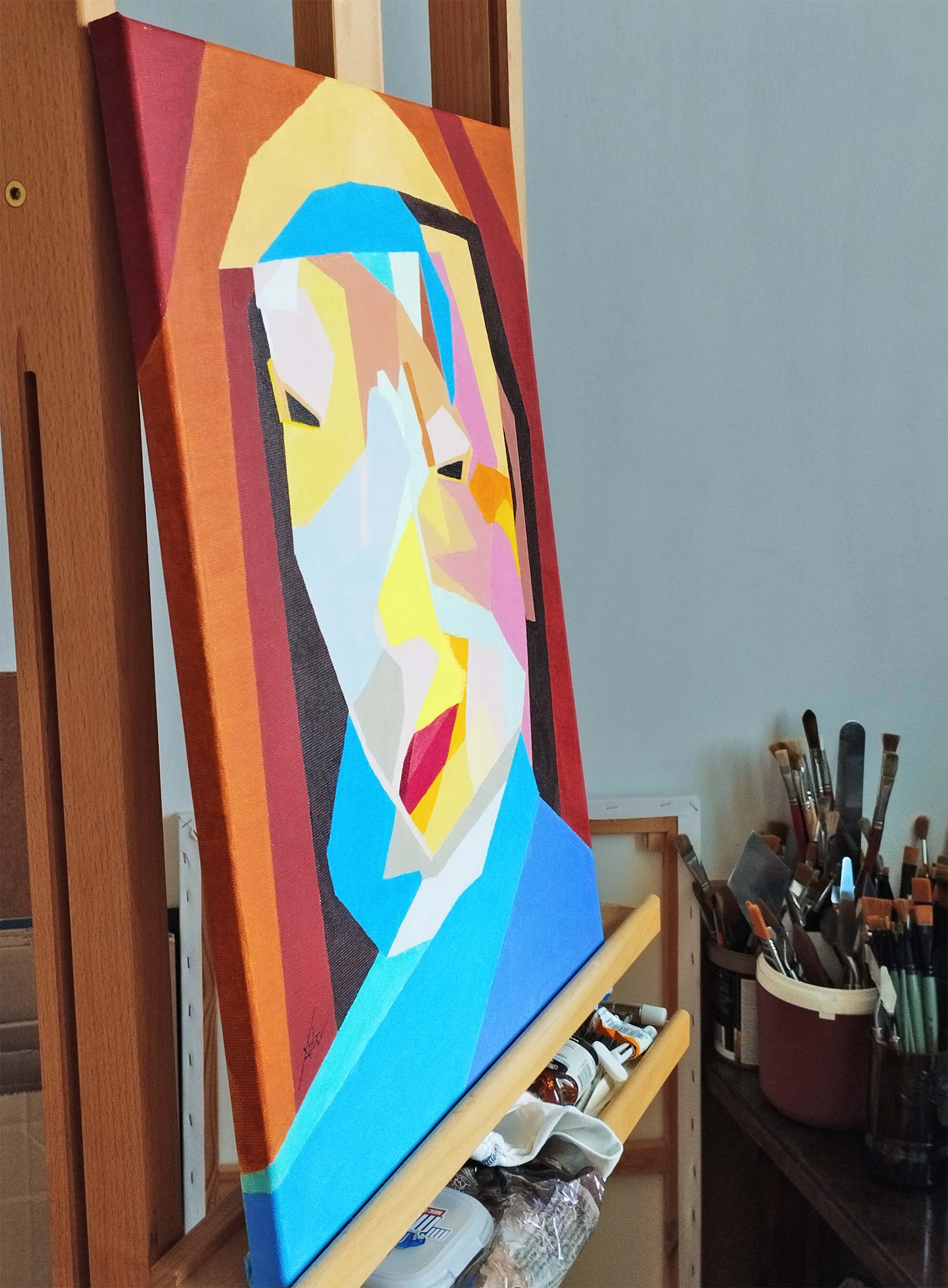 Obraz tętni kolorami, które przyciągają wzrok jak cukierki w sklepie. Dominują tu geometryczne kształty, które układają się w abstrakcyjny portret. Na pierwszy rzut oka widać intensywne błękity, róże, żółcie i brązy. Kompozycja jest niemal kalejdoskopowa, niczym rozbite witraże. Artysta zastosował technikę kubistyczną, co nadaje dziełu dynamiczny i nowoczesny charakter. Obraz mówi do nas w języku angielskim: "bold". Atmosfera emanująca z pracy jest pełna energii i nieco tajemnicza. Może wzbudzić poczucie ciekawości i fascynacji. Widząc te zawirowania form i barw, czujemy, że to taki artystyczny rollercoaster. Emocje? Na pewno jakieś. Może niepewność, może zaciekawienie. Dzieciak powiedziałby: "Ale fajne kolorki!" To dzieło to taki wizualny quiz, intryguje i zaprasza do rozmyślań. Można by powiedzieć, że jest jak nieuchwytny sen, który nie daje wytchnienia, ale przyciąga raz po raz. Fascynujące, naprawdę.