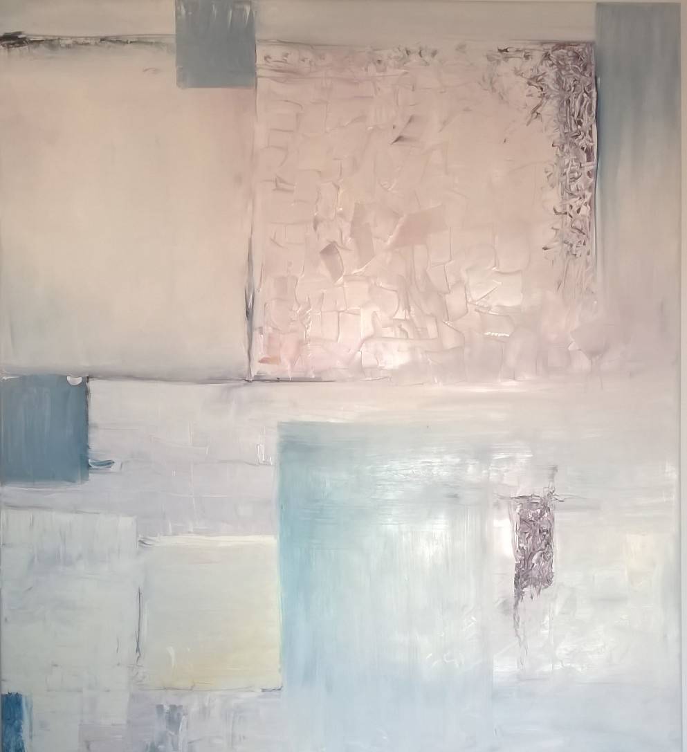 Na obrazie dominuje subtelna paleta kolorów: delikatne odcienie błękitu, szarości i bieli przeplatają się, tworząc spokojną kompozycję. Kształty są geometryczne, ale nie perfekcyjne – prostokąty i kwadraty mieszają się z niewyraźnymi liniami. Ten obraz przypomina trochę zimowy krajobraz, gdzie wszystko jest takie delikatne i spokojne. Atmosfera dzieła przywołuje poczucie harmonii i ciszy. Styl artysty można opisać jako abstrakcyjny, z elementami impasto, co dodaje obrazowi tekstury i głębii. Mazaje są delikatne, jakby malowane pędzlem z dużą czułością. Gdy patrzę na to dzieło, czuję się trochę jakbym nurkował w chmurach – to doświadczenie prawie "dreamlike", jak z bajki. Te łagodne kolory i formy mogą budzić w widzu uczucie spokoju, ale także pewnej nostalgii. Obraz przypomina mi miękki szalik, którym chciałoby się otulić w chłodny dzień. Mój bratanek powiedziałby, że wyglada jak koc z nieba! Dzieło wzbudza refleksje, prowokuje do zatrzymania się na chwilę. Czy to cisza przed burzą, czy może świt po nocy pełnej burzliwych snów?
