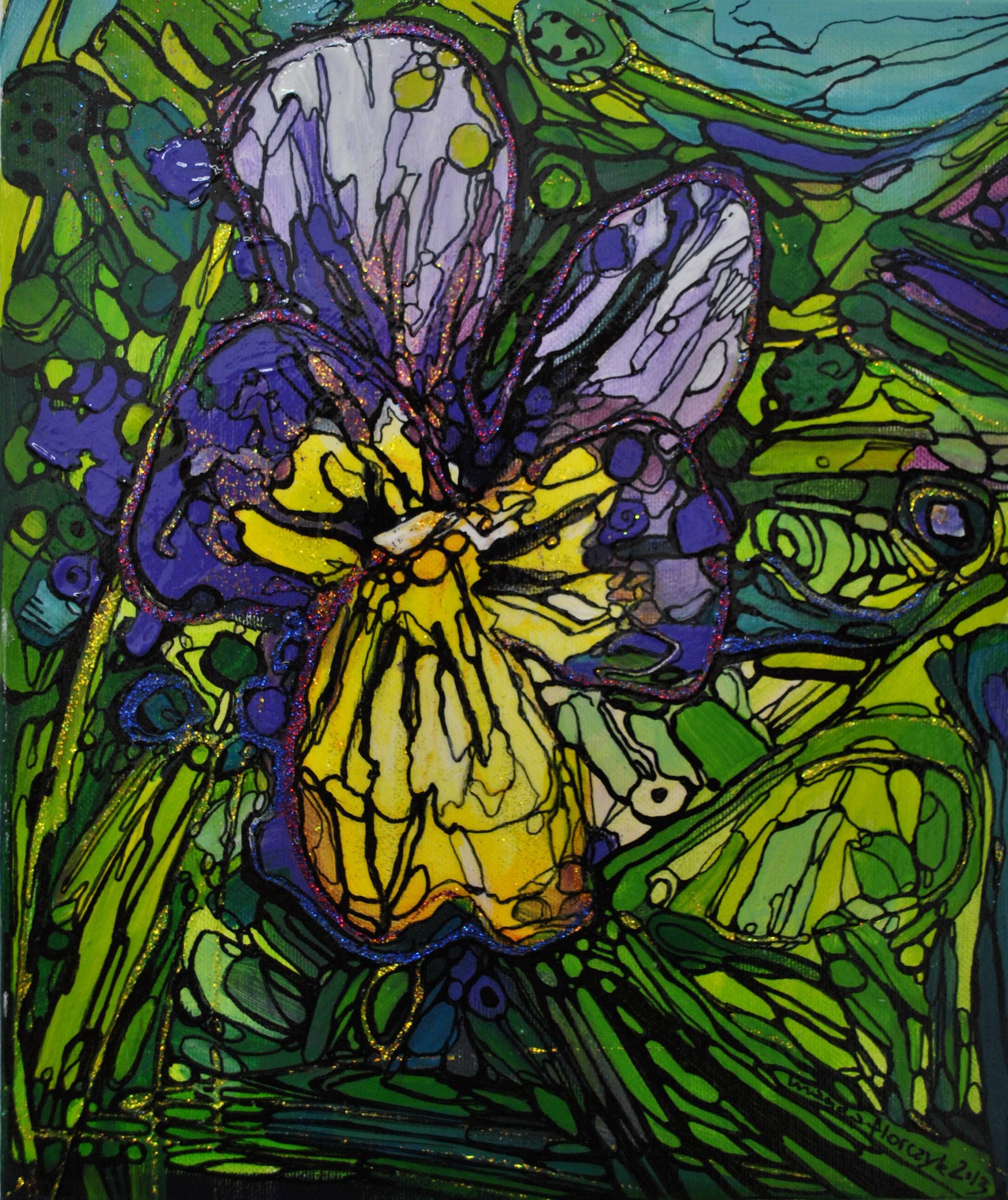 Na obrazie dominują żywe kolory - intensywna zieleń, głęboki fiolet i słoneczny żółty przeplatają się jak niekończący się taniec wiosny. Centralnym punktem jest kwiat, prawdopodobnie fiołek, który zdaje się pulsować energią. Widać tu rozmaite kształty, niemal jak witraż, co dodaje mu nieco magicznego charakteru. Całość sprawia wrażenie chaosu kontrolowanego, gdzie każda linia i plama koloru ma swoje miejsce. Nastrój, jaki bije z tego dzieła, jest radosny, niemal beztroski. Kojarzy się z ciepłym dniem spędzonym na łące, gdzie wszystko jest możliwe - a przynajmniej takie się wydaje. Artysta posługuje się techniką bliską abstrakcji, a jednak pozostawia odbiorcy czytelny motyw do odkrycia. Patrząc na ten obraz, czuje się naturalną chęć uśmiechu, jakby ktoś opowiedział dobry joke. Dzieło to pobudza wyobraźnię i zachęca do wkraczania w świat pełen marzeń. Niemal słychać szelest liści i czuć zapach kwiatów. Siedmiolatek powiedziałby: "To jest bardzo fajny, kolorowy kwiatek!" Całość ma klimat iście wiosenny, dzięki czemu obraz staje się synonimem pozytywnego myślenia. Czyż to nie jest awesome? Sztuka łączy w sobie chaos i harmonię, tworząc przestrzeń na refleksję i dziecięcą radość.