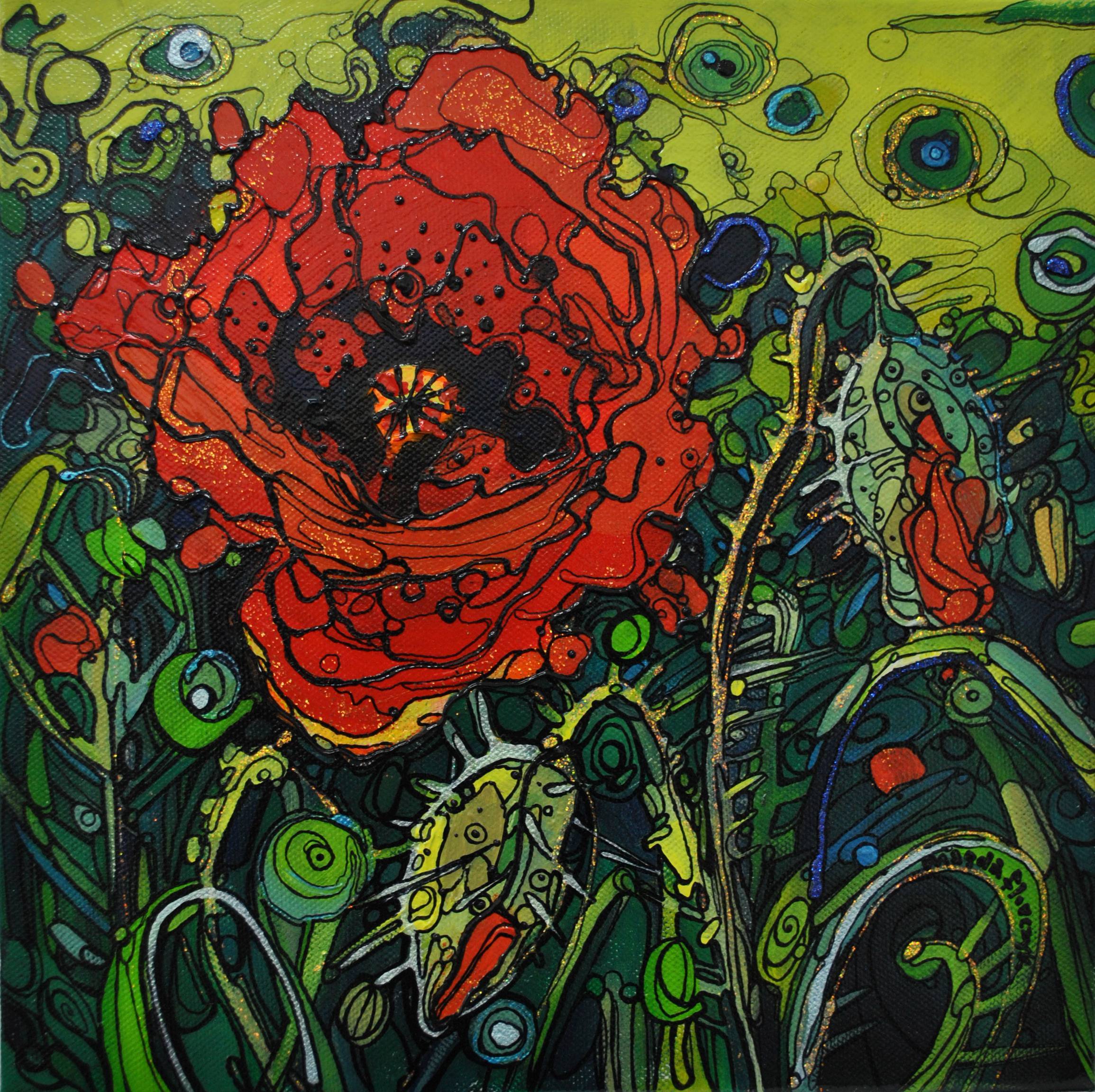 Obraz, który widzimy, to prawdziwa eksplozja kolorów i kształtów. Dominują intensywne odcienie czerwieni i zieleni, co tworzy kontrast niemal hipnotyzujący. Centralnym punktem kompozycji jest czerwony kwiat, przypominający roztańczony mak z wyrazistymi liniami i plamami. Artysta użył technik przypominających stained glass, co daje wrażenie ruchu i żywotności. Elementy tła zdają się snuć swoją własną opowieść, przywołując na myśl bujne łąki. Atmosfera emanuje radością, energią, ale też pewną tajemniczością. Patrząc na obraz, można poczuć się jak w ogrodzie marzeń. Unoszące się uczucie swobody i dzikości sprawia, że widz przemierza w myślach pola pełne kwiatów. Styl artystyczny łączy abstrakcję z elementami surrealizmu, tworząc efekt almost dreamlike. Nie sposób się oprzeć myśli, że każde pociągnięcie pędzla ma tu swój sens, choć początkowo może wydawać się chaotycznye. "Ale te kolory są super!" - powiedziałby mały miłośnik sztuki. Z każdym spojrzeniem odkrywasz coś nowego i zastanawiasz się, co kryje się w zakamarkach tej kolorowej kompozycji.