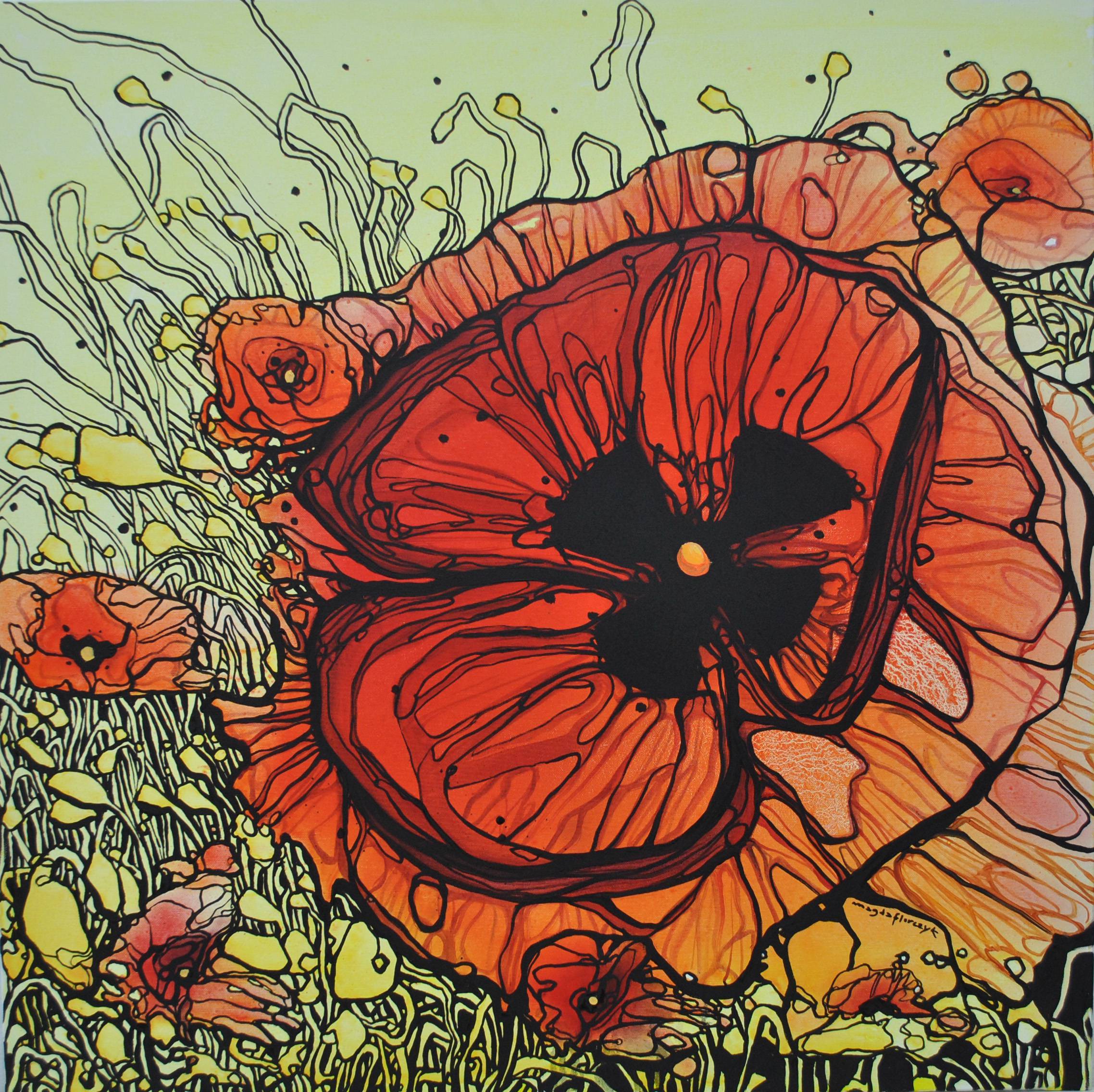 Obraz pełen kolorów i ruchu przyciąga wzrok swoimi intensywnymi czerwieniami i pomarańczami, które dominują nad delikatnym, żółtawo-zielonym tłem. Kompozycja kipi energią, a wielkoformatowe, niemal eksplodujące maki zdają się tańczyć na wietrze. Linie są żywe, niemal chaotyczne, co dodaje całej scenie dynamiczności. Niemal słyszysz, jak szepczą. Nastrój tego dzieła jest pełen radości, ale i tęsknoty. Niektórzy mogą poczuć nostalgia za dzieciństwem, gdzie łąki wydawały się nieskończone. Styl artystyczny, przypominający stained glass, ma w sobie coś nieuchwytnego, jakby artysta bawił się światłem i cieniem. Technika? Może akryl, może atrament – z pewnością coś, co pozwala na swobodne kreski. Każdy liść, każdy płatek jest jakby rysowany z miłością i pasją, a te intensywne kolory, wow! Dziecko powiedziałoby pewnie: „To wygląda jak wielki kwiatowy party!”. Takie immediate skojarzenie. To dzieło mówi do serca – czuje się tam, w środku, pewne uczucie freedom. Obraz jak ten może wywołać w nas zarówno ochotę, by dać się ponieść chwilom, jak i przypomnienie o ulotności piękna. I choć błędy i niedoskonałości tu się pojawiają, nadają mu jakiejś autentyczności – jakby ktoś mówił do ciebie bezpośrednio, bez filtrów.