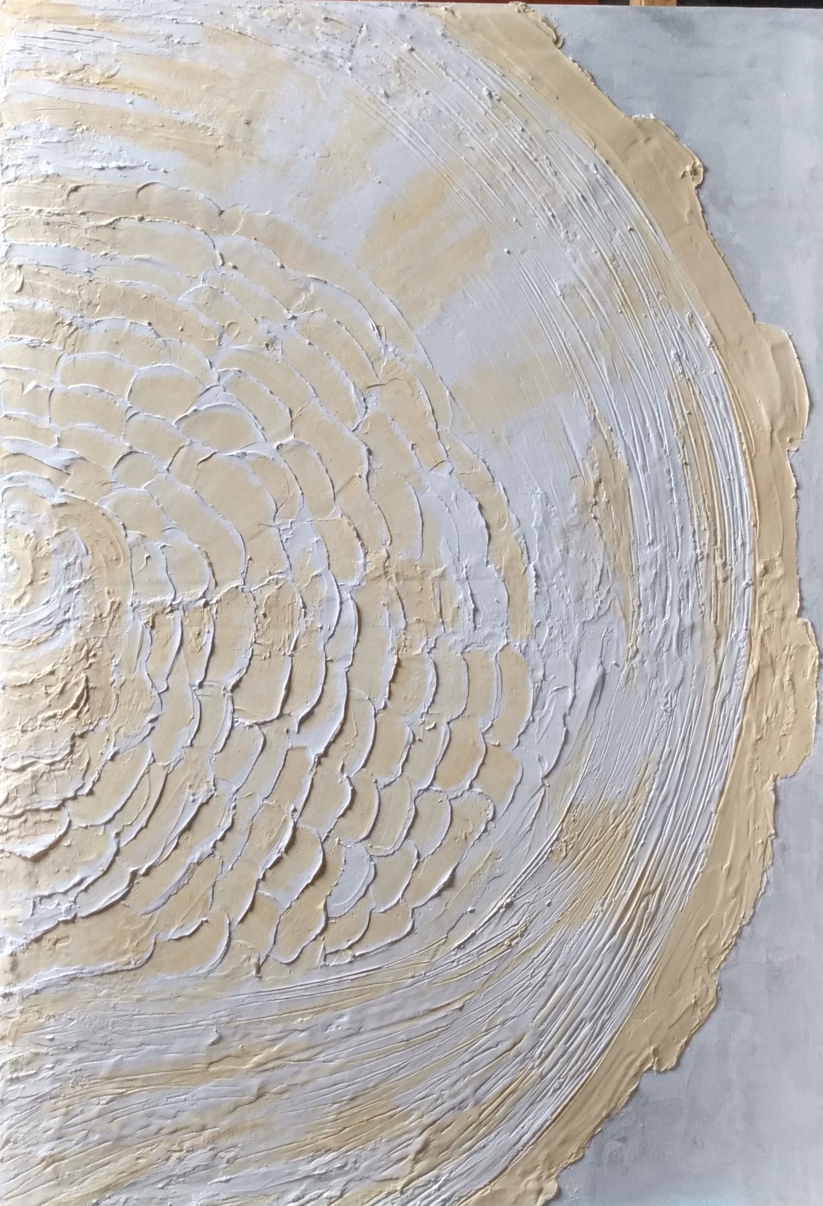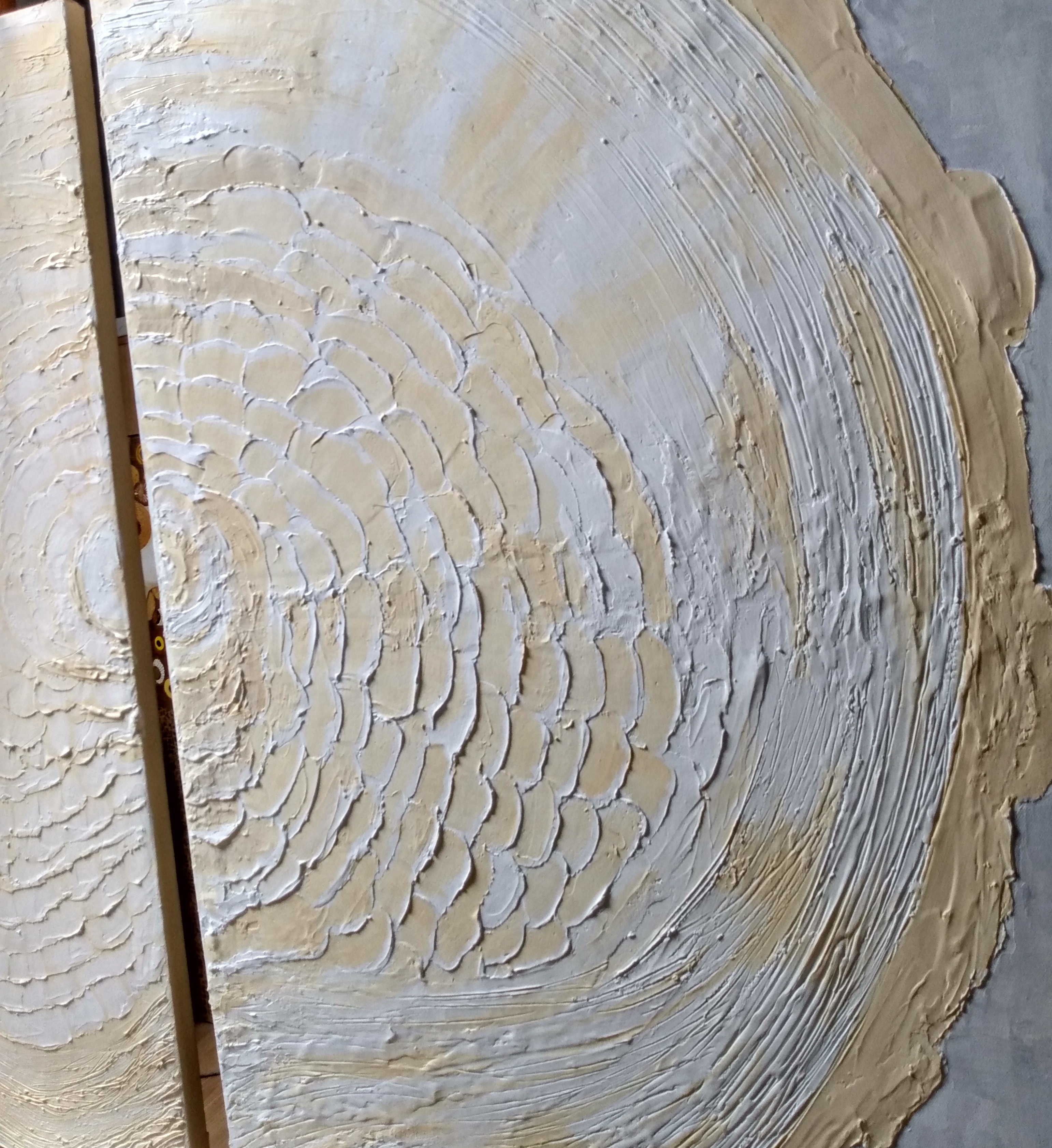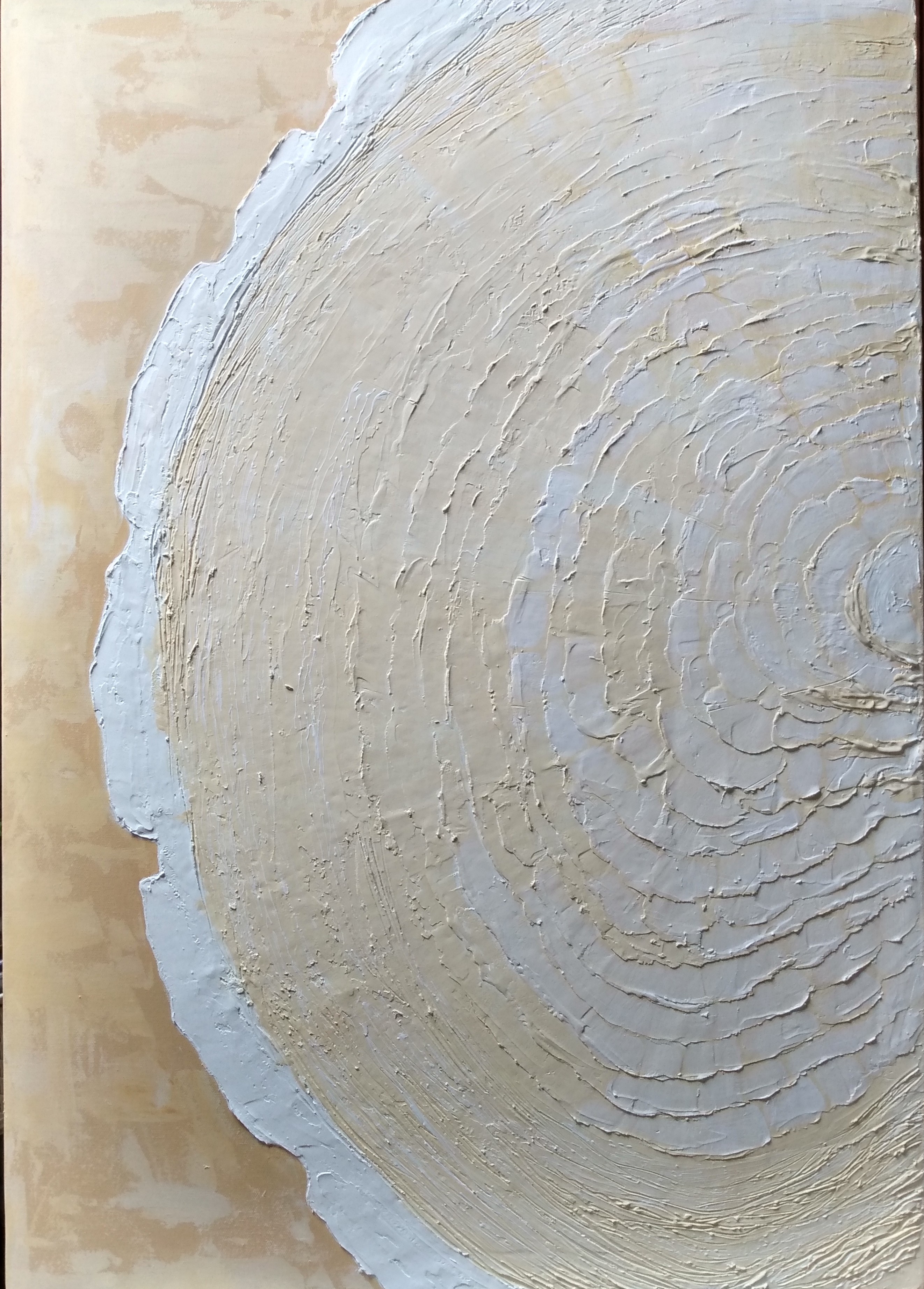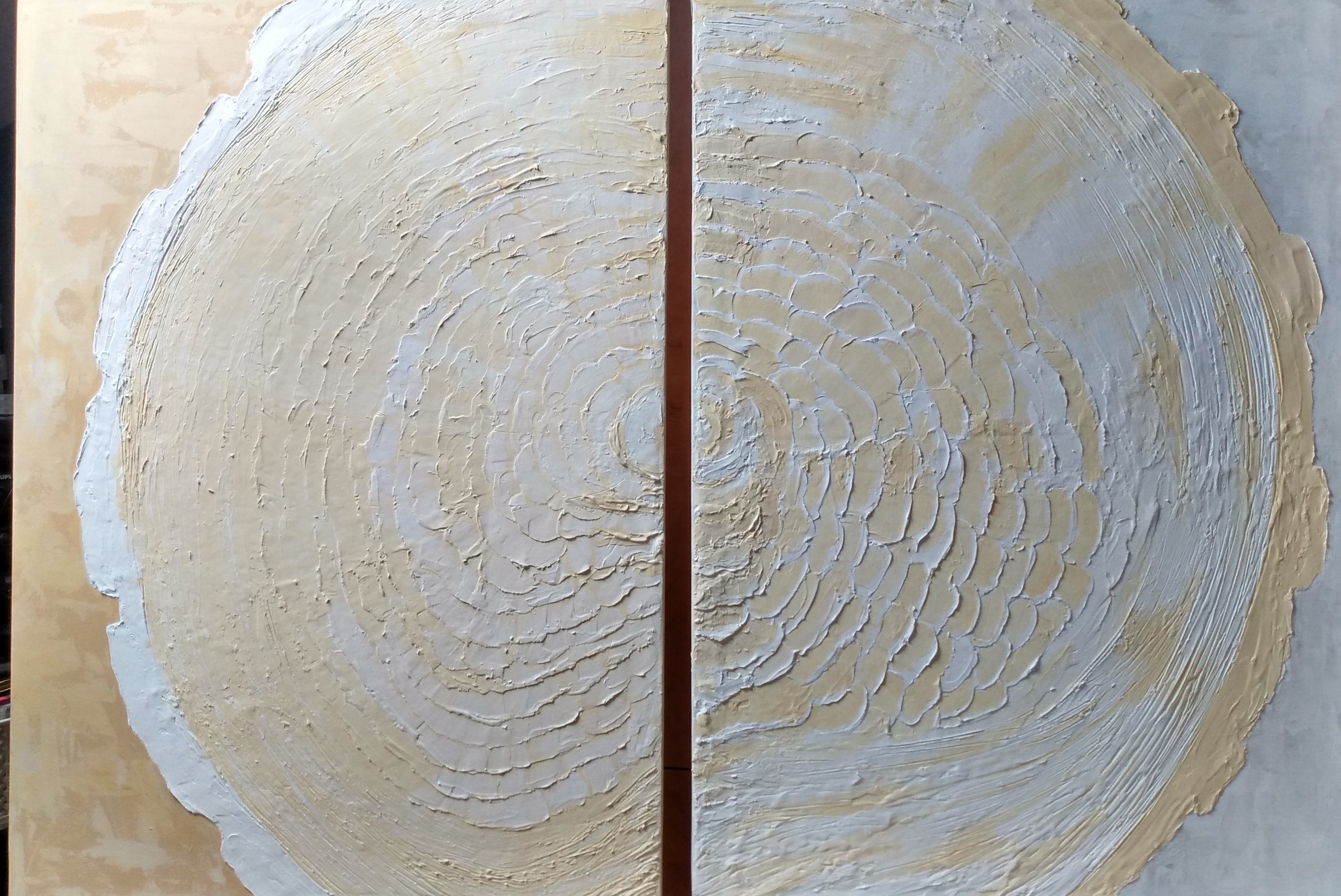 Obraz przyciąga wzrok swoją prostotą i jednocześnie głębią. Przedstawia okrągłe formy przypominające słoje drzewa, z dochodzącą do granic płótna teksturą, gdzie kremowe i białe odcienie subtelnie się przeplatają. Centralny podział obrazu jest kluczowy, dodaje tajemniczości, jakby dwa światy chciały się spotkać. Jest w tym coś takiego, co sprawia, że chcesz na chwilę się zatrzymać i zanurzyć w tej kompozycji. Dyptyk (rozmiar płócień - 70x100cmm ) Artysta korzysta z impastu, dzięki czemu powierzchnia staje się niemalże trójwymiarowa. Dzięki temu można poczuć, jak farba niemal wychodzi z płótna. To robi wielkie wrażenie, a faktura przypomina faktury natury. Czy to wygląda tak, jakby dziecko mogło to zrobić? Hm, trochę tak, ale w tym jest geniusz. Nastrój dzieła jest spokojny, niemalże medytacyjny. Możesz na chwilę zapomnieć o wszystkich troskach. Styl kojarzy się z abstrakcją, ale jest tu coś więcej - ten fine touch artysty. Obraz wywołuje w odbiorcy poczucie czasu, nieśmiertelności, może nostalgii? A może po prostu patrzysz na fragment świata, który trwa i trwa. Osobiście, czuję spokój, kiedy na niego patrzę. Czasem bywa tak, że takie detale przypominają mi, jak ważna jest cierpliwość i obserwacja świata dookoła. Takie właśnie są te małe momenty refleksji. A przecież, jak to mówią, "the devil is in the details".