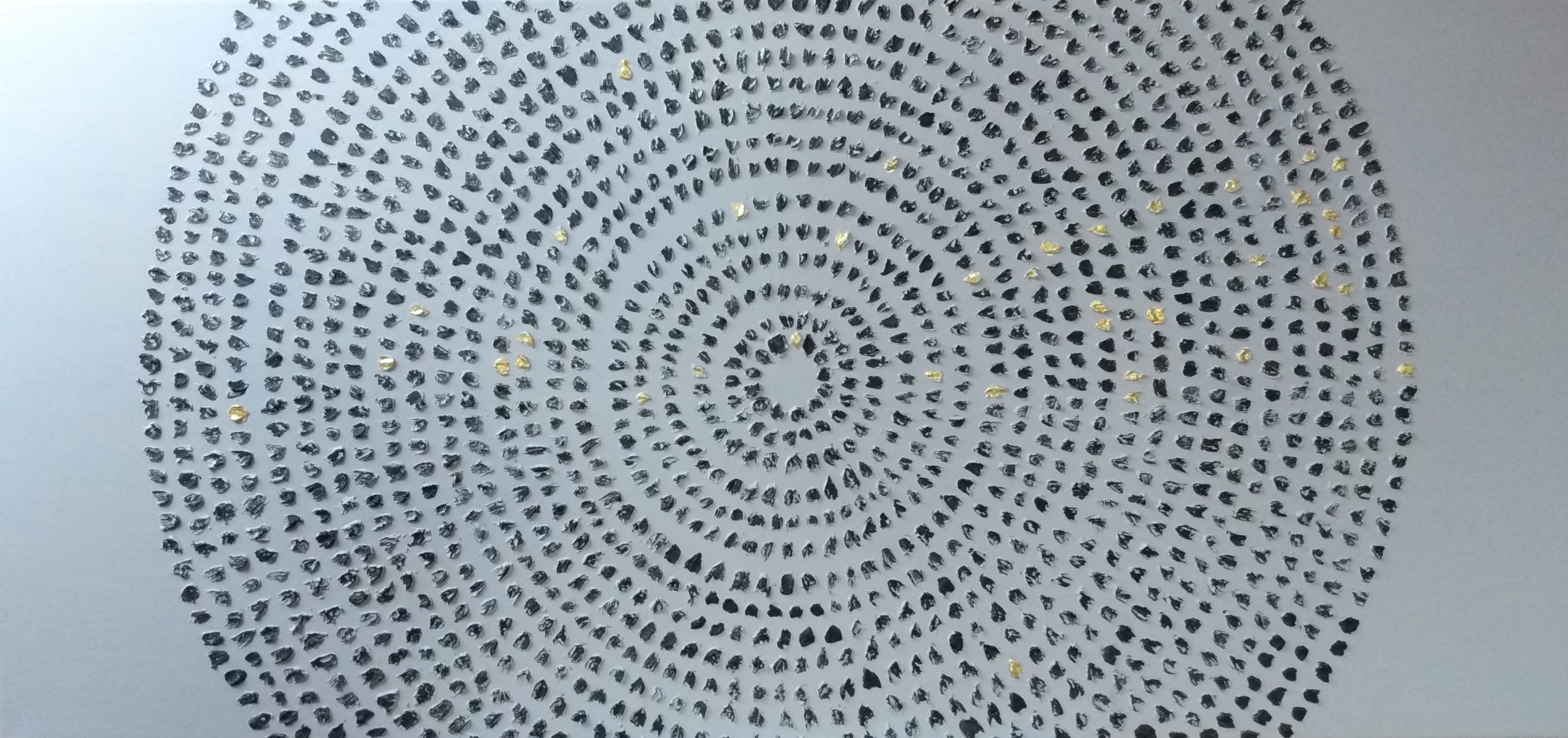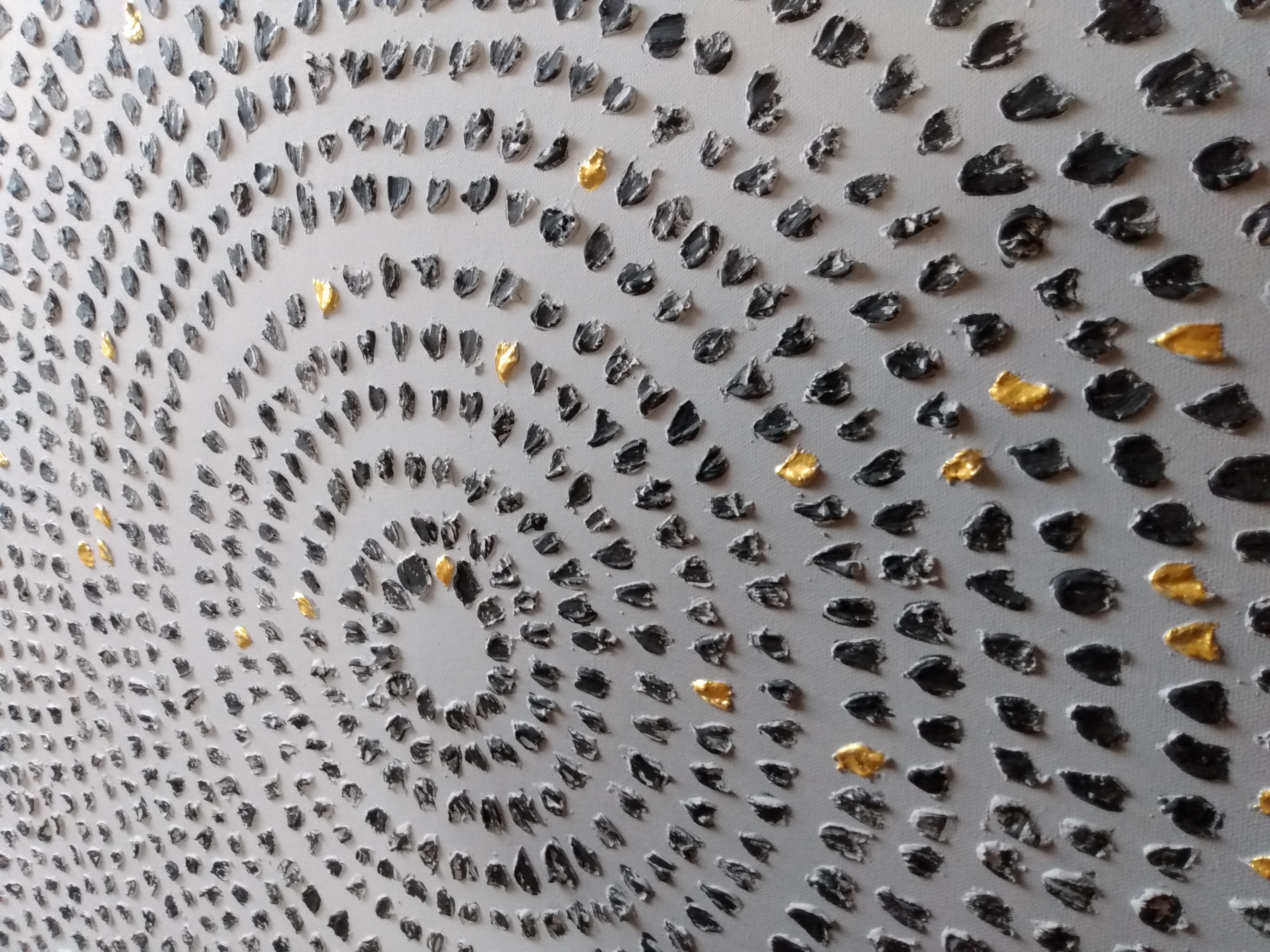 Obraz przedstawia fascynującą kompozycję wzorów rozchodzących się w koncentrycznych okręgach. Dominują kolory szarości z subtelnymi akcentami złota, które przyciągają spojrzenie jak błysk światła w mroku. Oczom ukazują się setki drobnych znaków, które tworzą wrażenie dynamicznego ruchu, jakbyśmy patrzyli na wir życia. W tym art piece, artysta z mistrzowską precyzją połączył minimalizm z bogactwem detalu. Stworzył tym samym wyważony kontrast między prostotą formy a złożonością jego struktury. Nastrój dzieła jest spokojny, ale jednocześnie pełen tajemnicy. Można się w nim zatopić, dając się ponieść medytacji nad nieskończonością. Styl pracy sugeruje inspirację sztuką współczesną, może nawet gdzieś zahaczając o styl organiczny. Malutkie plamy farby przypominają krople na tafli wody. Obraz wywołuje refleksje na temat naszej relacji z otaczającym światem i tego, jak małe elementy tworzą coś większego. To trochę jak gra w chowanego z rzeczywistością. Wow! Patrząc na to dzieło, czuję spokój, ale także pobudzenie wyobraźni. Jakby artysta powiedział "Explore me". Może to przypominać odcisk palca, nasuwając myśli o indywidualności i tożsamości. Dla mnie ten obraz to podróż bez konieczności ruszania się z miejsca.