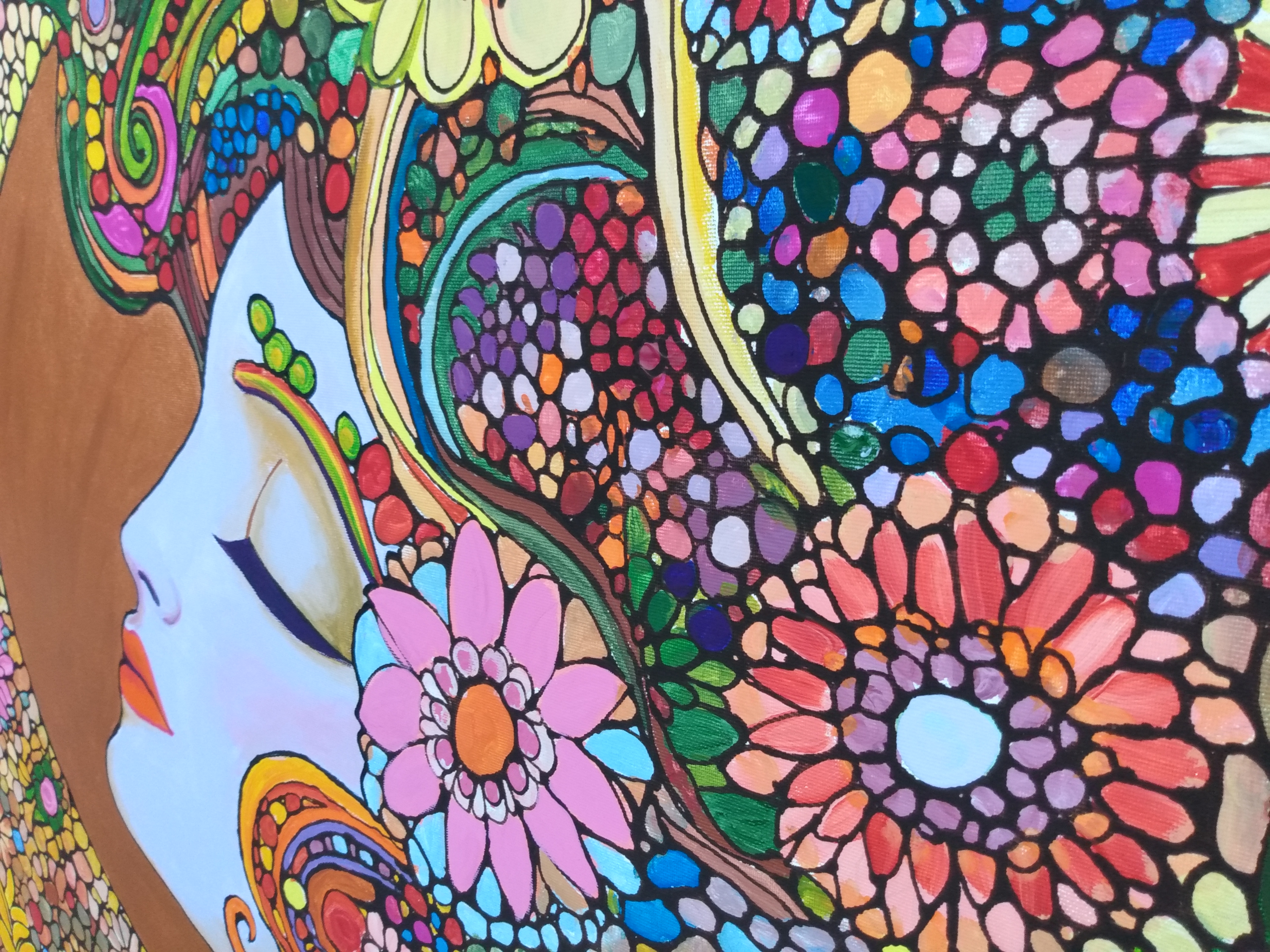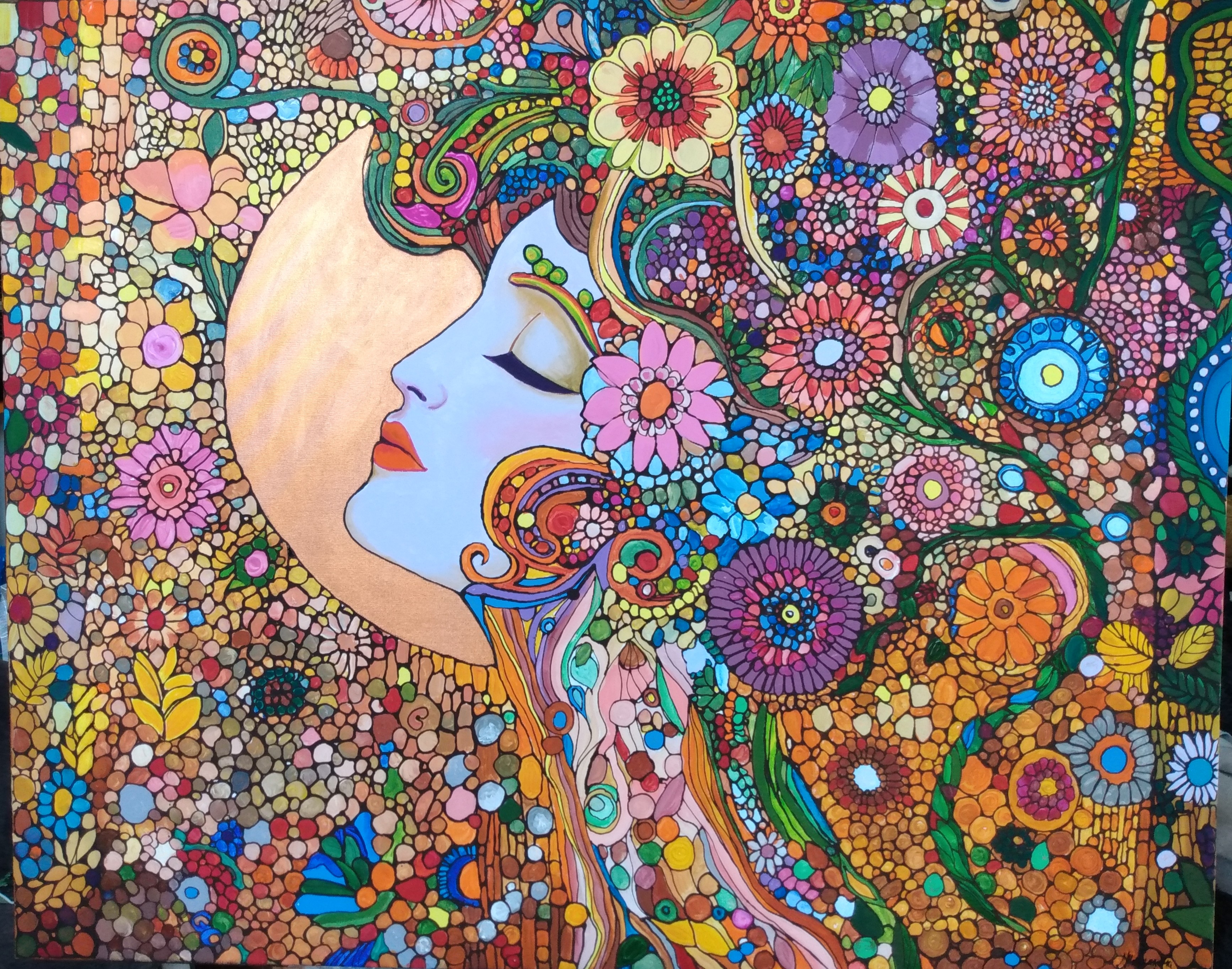 Obraz emanuje eksplozją kolorów i form, tworząc kompozycję pełną życia i energii. Dominują żywe barwy – soczyste pomarańcze, intensywne fiolety i głęboką zieleń – przeplatają się ze sobą, tworząc dynamiczny taniec kształtów. Kobieca twarz w centrum to prawdziwe "highlight" dzieła. Zanurzona w kwiatach, wydaje się być częścią natury, jakby zatopiona w spokojnym śnie. Styl przypomina secesję, z płynnymi liniami i organicznymi kształtami układającymi się w harmonijną całość. Kwiaty są jakby żyły własnym życiem, tworząc tajemniczą atmosferę. Niebo, co za kolorowy chaos, pomyślało dziecko. Technika artysty polega na mistrzowskim łączeniu drobnych elementów w jedną, spójną mozaikę. Obraz daje poczucie spokoju, ale i energii płynącej z natury. Patrząc na niego, można poczuć nostalgię za czasem spędzonym na ukwieconej łące. Jest w tym coś głęboko ujmującego. Myślę, że artysta próbował uchwycić związek człowieka z naturą w sposób magiczny. It speaks to the heart. Kolory tańczą przed oczami, wprowadzając w stan kontemplacji i zachwytu.