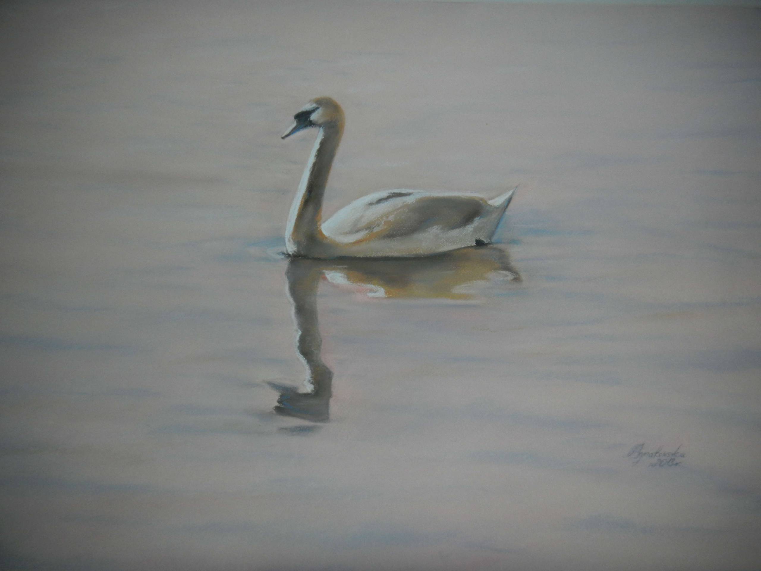 Na obrazie widzimy samotnego łabędzia, który płynie po spokojnej tafli wody. Kolory są dość stonowane, dominują odcienie szarości i błękitu, co nadaje scenie niezwykłego spokoju. Łabędź jest elegancki i dostojny, jego białe pióra delikatnie odbijają się na wodzie, tworząc subtelne refleksy. Kompozycja jest prosta, ale właśnie przez to zachwycająca – niemal minimalistyczna. Tło jest rozmyte, co podkreśla centralną postać ptaka. Atmosfera obrazu jest niezwykle kojąca. Patrząc na niego, można poczuć się niemal jak w świecie snów. Technika artystyczna, prawdopodobnie akwarela albo pastel, dodaje dziełu delikatności i ulotności. Farby są nakładane miękkimi, płynnymi pociągnięciami, co dodaje harmonii. Aż chce się westchnąć z zachwytu. Obraz może wywoływać różne emocje – dla mnie jest jak cisza o poranku. Każdy może tu znaleźć co innego. Może przypominać dzieciństwo spędzone nad jeziorem lub marzenia o nieskończonym spokoju. ‘How peaceful’ - myśli się automatycznie. Właśnie tak, jakbyśmy odkryli mały kawałek raju na ziemi. Dla dziecka byłby to po prostu "piękny ptak na wodzie". Każdy szczegół, od delikatnych fal na wodzie po majestatyczną postawę łabędzia, składa się na obraz, który na chwilę zatrzymuje czas.