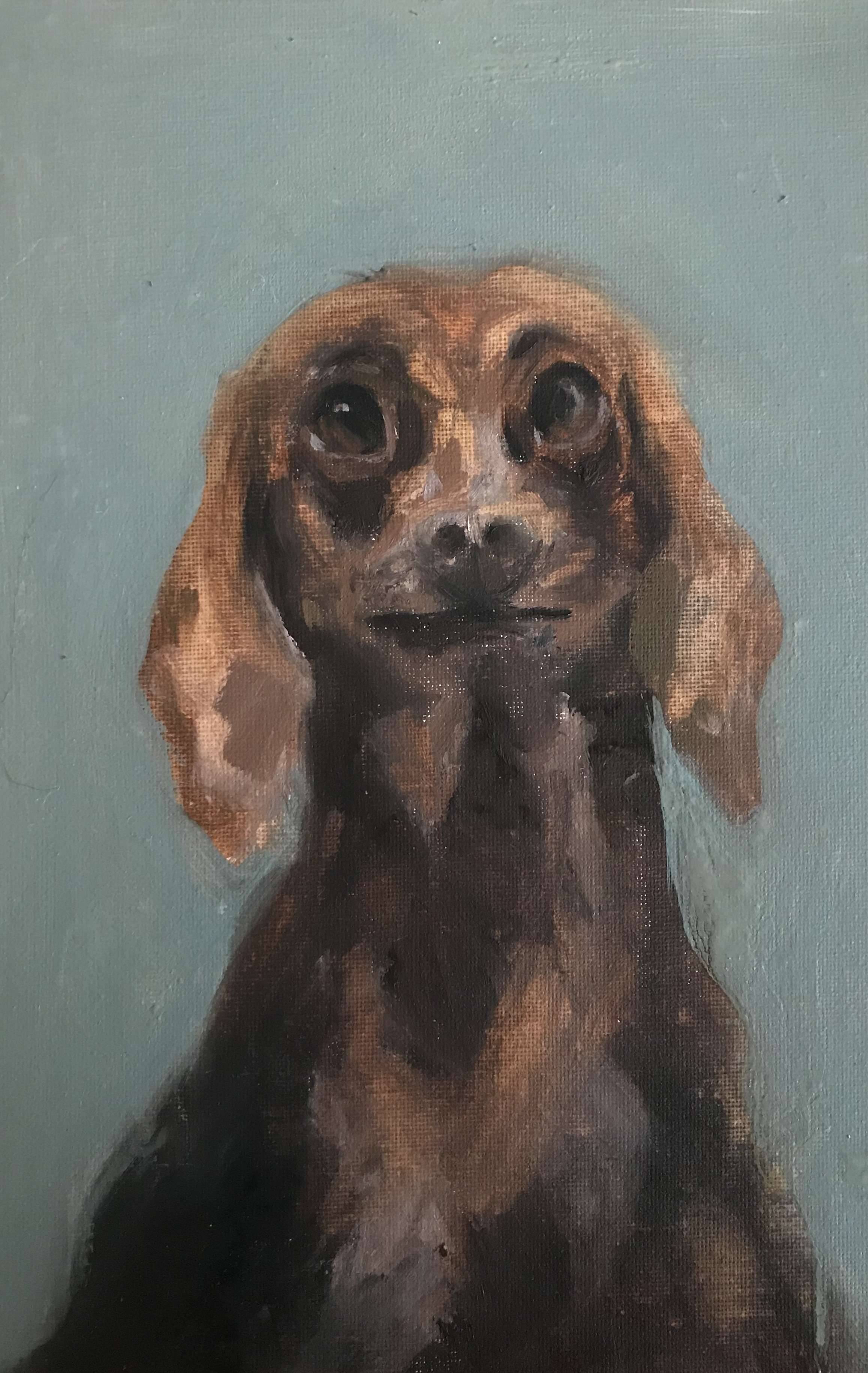 Portret małego, brązowego jamniczka. Jaki jest jamniczek, każdy widzi. Jak działa jamniczek? Na to pytanie swego czasu odpowiedział Antoniszczak, a ja sportretowałam tego wdzięcznego zwierzaka.
