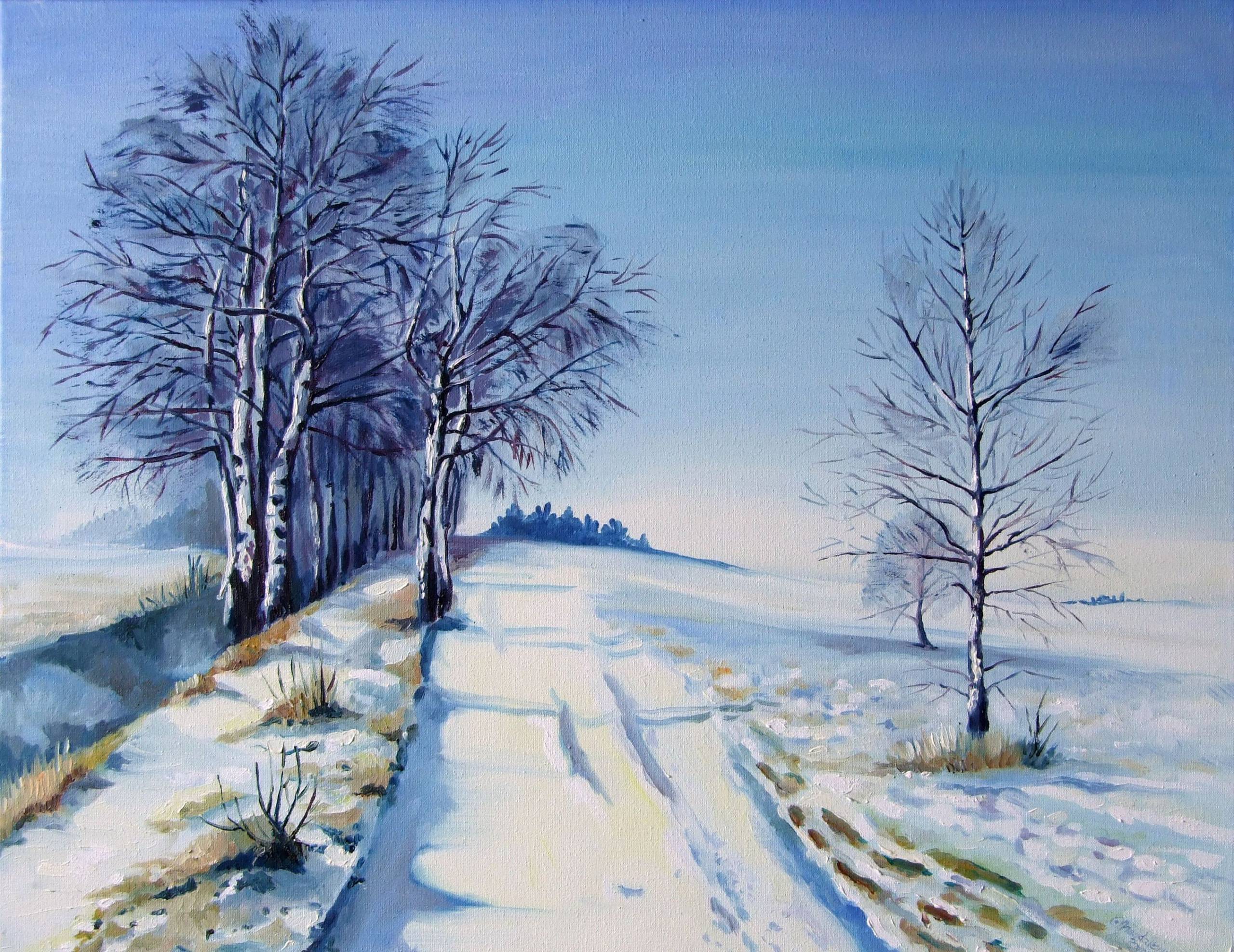 Na obrazie króluje zimowy pejzaż, gdzie biel śniegu doskonale kontrastuje z błękitem nieba. Smukłe drzewa, pokryte lekką warstwą szronu, rozstawione są po obu stronach zasypanej ścieżki, prowadząc wzrok ku dalekiemu horyzontowi. Krajobraz emanuje ciszą i spokojem, jakby zatrzymał czas. Artysta zastosował delikatne pociągnięcia pędzlem, nadając całości lekkość i subtelność. Cienie rzucane przez drzewa mają nieco fioletowy odcień, co dodaje tajemniczości. Wydaje się, że mróz aż skrzypi pod nogami. Obraz może wywoływać uczucie nostalgii, przypominając o zimowych spacerach z dzieciństwa. Jednocześnie jego atmosfera jest jak "peaceful", wywołując w sercu poczucie ukojenia. Patrząc na to dzieło, można poczuć chłód zimowego powietrza na twarzy. Dla mnie osobiście najlepszym momentem w tym obrazie jest pewien spokój. To właśnie tam, gdzie ścieżka znika w oddali, utknęły moje myśli. Patrząc na nie, czujemy, że chcemy wrócić do domu po szerokiej zaspie, z czerwonymi nosami i gorącym kakao w ręku. Obraz pobudza wyobraźnię, pozostawiając miejsce na indywidualne refleksje oraz emocjonalne reakcje. Idealny do zanurzenia się w chwilach zadumy.