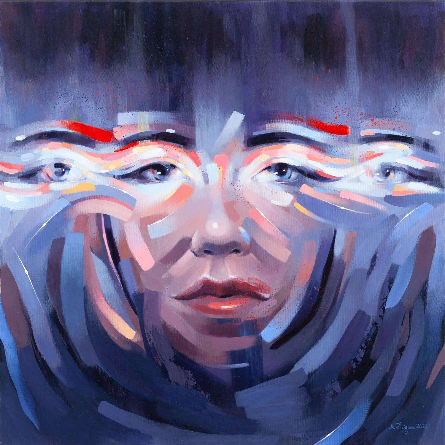 Na obrazie widzimy intrygującą twarz kobiety, która zdaje się wyłaniać z wiru kolorowych pociągnięć pędzla. Dominują niebieskie i purpurowe tony, z akcentami ciepłych czerwieni i pomarańczy. Te barwy tworzą dynamiczną mgiełkę, która przypomina sen albo odbicie w wodzie. Atmosfera jest niesamowicie tajemnicza, niemal eteryczna, jakby postać znajdowała się na granicy dwóch światów. Artysta zastosował tu technikę, która sprawia wrażenie ruchu, jakby kolory chciały nas otulić i wciągnąć do swojego świata. Styl tej pracy jest zdecydowanie nowoczesny, z nutką abstrakcji. Pociągnięcia pędzla są szybkie, energiczne, co dodaje całości dynamiki. Twarz ma w sobie coś hipnotyzującego, a spojrzenie przyciąga wzrok, jakby chciało powiedzieć coś ważnego. Może o wewnętrznych emocjach, może o poszukiwaniu siebie? A może po prostu jest wyrazem artystycznej ekspresji? Patrząc na ten obraz, czuję się, jakbym był częścią czegoś większego. Wzbudza on we mnie refleksję nad ulotnością chwil i tym, jak łatwo można zgubić siebie w chaosie codzienności. Trochę jest to jak zagubienie się w "dream", z którego nie chcesz się obudzić. I wyobraź sobie, co by powiedziało dziecko: patrzę na obrazek i widzę dużo farbek na policzkach pani. Obraz wywołuje we mnie uczucie spokoju, ale i niewielkiej tęsknoty za tym, co nieuchwytne.