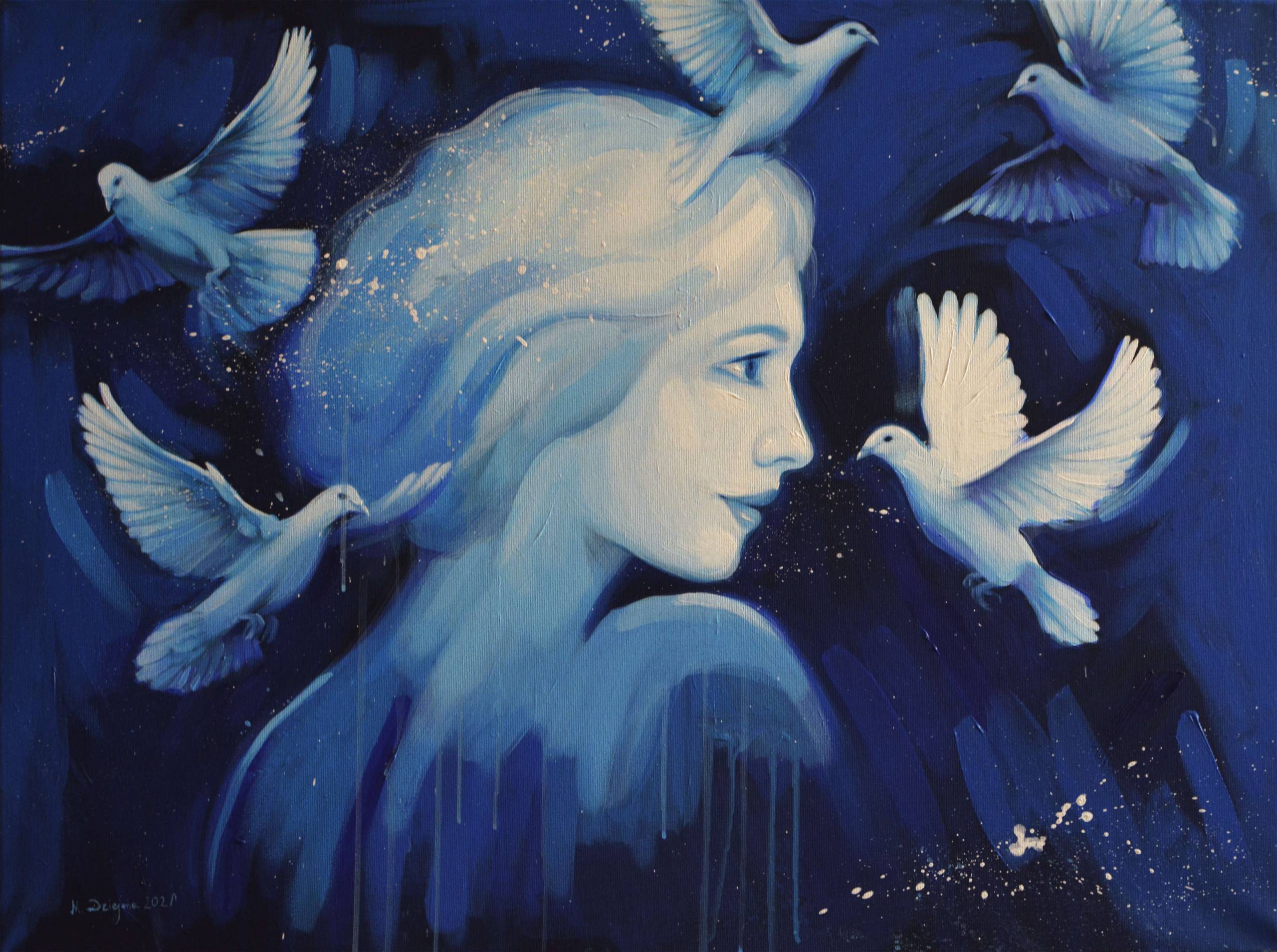 Na obrazie dominują odcienie błękitu i bieli, które nadają mu chłodny, ale jednocześnie kojący charakter. Główna postać, kobieta z profilu, wydaje się eteryczna. Jej twarz otaczają białe gołębie, a wszystko razem wprowadza w stan swoistego dreamland. Ich rozpostarte skrzydła dodają uczucia lekkości i swobodnej przestrzeni. Artysta wykorzystał miękkie pociągnięcia pędzla i delikatne przejścia kolorów, co tworzy efekt niemal mgielnego otoczenia. To dzieło jest jak szept, ciche, ale bardzo wymowne. Obraz emanuje spokojem, ciszą nocną i pewnym magicznym urokiem. Gołębie, będące symbolem pokoju i duchowości, zdają się unosic lekko w powietrzu, jakby były częścią snu. Czyż nie jest to cudowne? Styl artystyczny obrazu balansuje na granicy realizmu i impresjonizmu, mieszając detale z bardziej abstrakcyjnymi formami. Patrząc na to dzieło, można poczuć się jakby świat zewnętrzny zniknął, pozostawiając tylko spokój w sercu. Czuję, że obraz ten jest jak okno do świata, gdzie cisza i piękno są wszystkim, co istnieje. Ta cisza mówi, listen. Dla mnie to jak opowieść o marzeniach ulotnych, które chwilowo zamieszkały w pięknie pędzla. Może to być dzieło, które przywodzi na myśl myśli pełne refleksji, o sile wewnętrznego spokoju i harmonii.