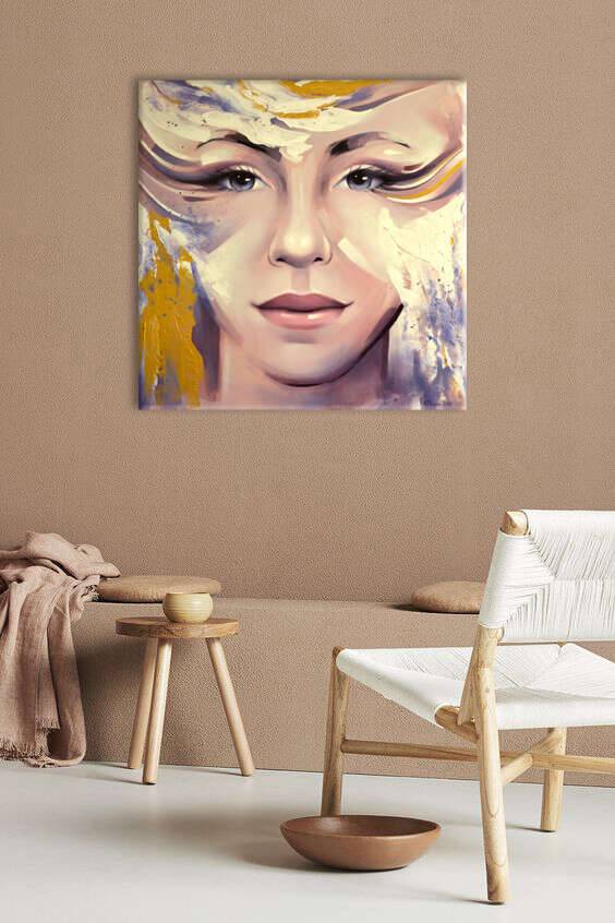 Kolorystyka obrazu jest stonowana, pastelowa, paleta barw ograniczona: dominują brązy i fiolety. Atutem pracy jest użycie złotej farby, która świeci pod różnym kątem co daje niepowtarzalne wrażenia wzrokowe. Kompozycja dzieła jest otwarta, centralna. Obraz jest bardzo lekko namalowany – czuć wprawną rękę artysty. Dzięki użyciu dodatkowego narzędzia jakim jest szpachelka gdzieniegdzie można zauważyć na płótnie fakturę (grubsza warstwa farby). Uwagę widza przyciąga wzrok kobiety. Jest on bardzo starannie namalowany i stanowi bardzo mocny akcent obrazu. Obraz jest pokryty błyszczącym werniksem. Sygnatura w dolnym prawym rogu oraz z tyłu dzieła. Boczne części podobrazia stanowią kontynuację obrazu. Dzieło jest częścią otwartego cyklu malarskiego „Czar widzenia”. Kolekcja przedstawia lekko abstrakcyjne kobiece portrety, gdzie najistotniejszym elementem są oczy. Nie od dziś wiadomo, że są one odzwierciedleniem duszy i właśnie to było dla artystki motorem do stworzenia tego cyklu. Obraz znajdował się na indywidualnej wystawie artystki. Odbyła się ona we wrześniu 2022 roku w Miejskim Centrum Kultury w Tomaszowie Maz.