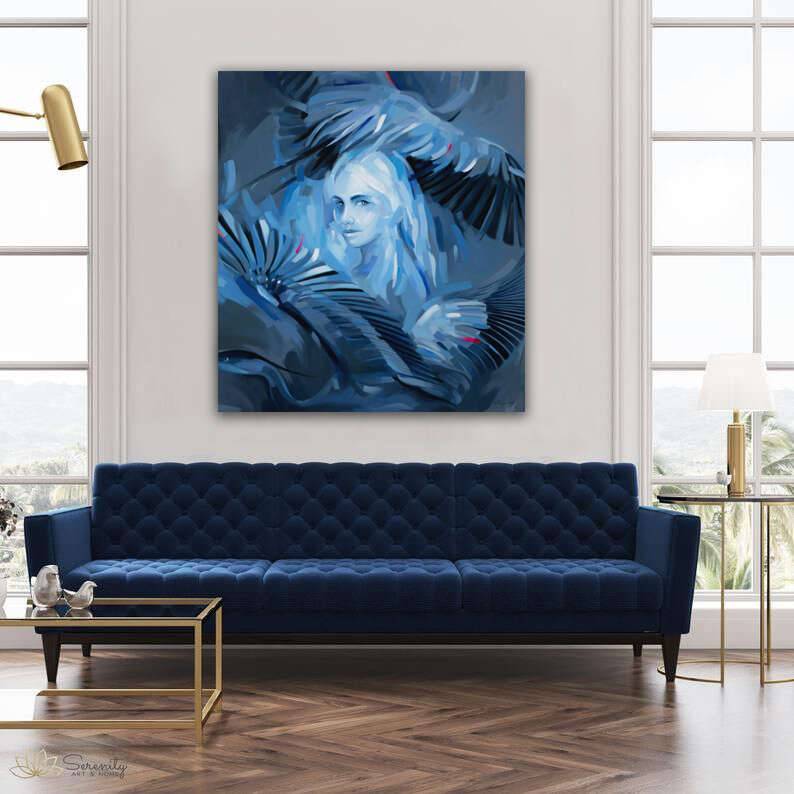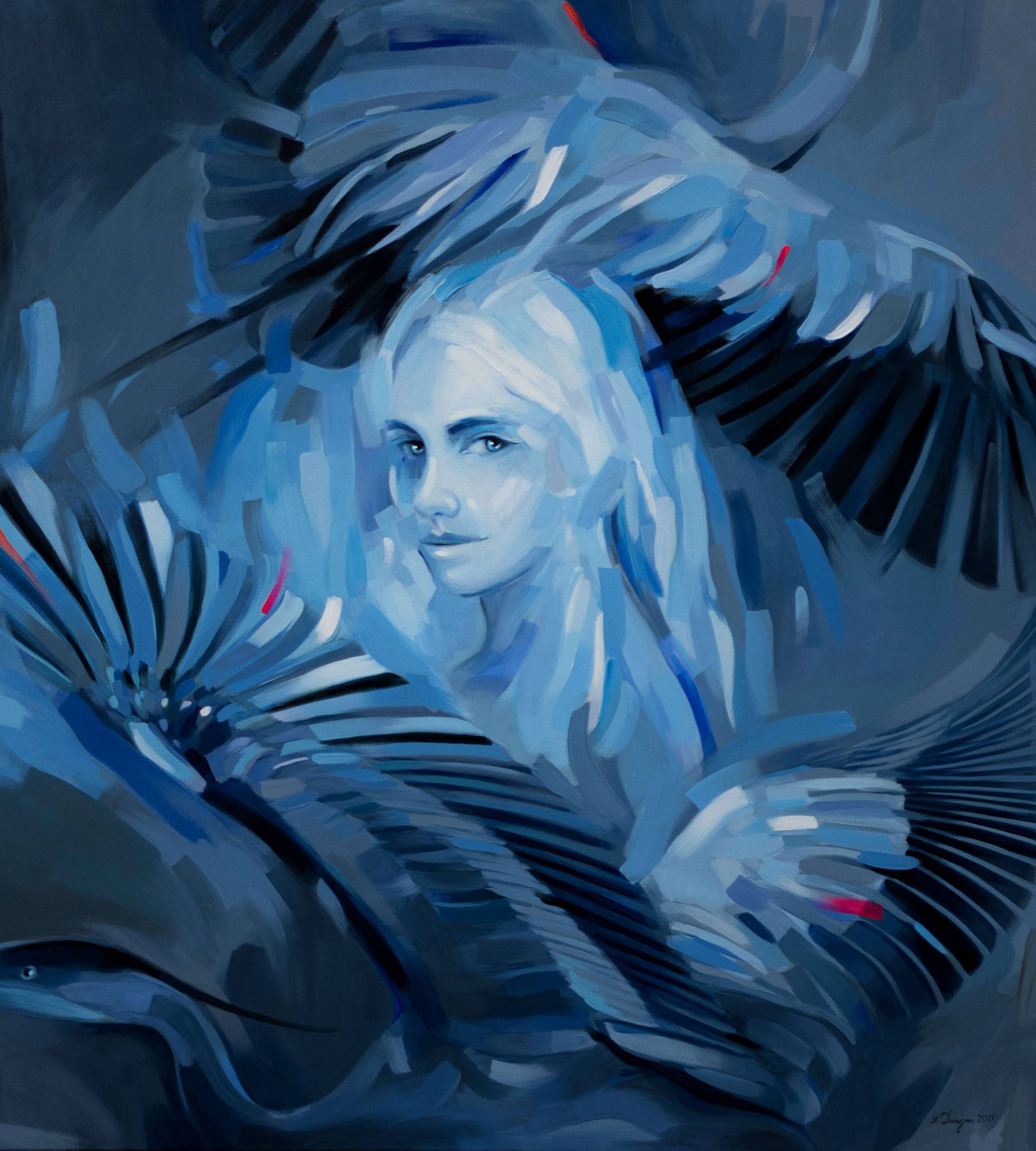 Kolorystyka obrazu jest ciemna, jednak barwy są czyste. Obraz byłby monochromatyczny gdyby nie użycie kilku akcentów kolorystycznych w formie szybkich pociągnięć pędzla żywych kolorów: intensywny róż i czerwień. Zabieg ten dopełnia dzieło i sprawia, że jest ono jeszcze bardziej interesujące. Kompozycja dzieła jest otwarta i dynamiczna. Obraz został starannie wykonany z dbałością o szczegóły. Każda plama precyzyjnie wykonana, tak aby wszystko do siebie pasowało i tworzyło spójną całość. Elementem, który najbardziej intryguje, jest postać kobiety, która wyłania się z wnętrza płótna. Wydaje się być ona osobą zagadkową, a także niewinną i delikatną. Na pewno nie jedna osoba chciałby odkryć tajemnicę jaką w sobie kryje. Z dzieła emanuje spokój i harmonia z nutką tajemnicy. Obraz jest pokryty błyszczącym werniksem. Sygnatura w dolnym prawym rogu oraz z tyłu obrazu. Boczne części podobrazia stanowią kontynuację obrazu. Dzieło jest częścią otwartego cyklu malarskiego „Trzepot myśli”. Kolekcja ta powstała po 7-letnim okresie wykonywania portretów rysowanych ołówkiem na zamówienie. Na płótnach znajdują się lekko abstrakcyjne kobiece portrety połączone z różnymi gatunkami ptaków: gołębie, żurawie, kolibry. W tej serii artystka wyruszyła w głąb siebie, poszukuje swojej twórczej drogi oraz rozwija umiejętności, które były uśpione od kilku lat. Obraz znajdował się na dwóch indywidualnych wystawach artystki. Pierwsza odbyła się we wrześniu 2022 roku w Miejskim Centrum Kultury w Tomaszowie Maz., a druga w styczniu 2023 roku w Dom Kultury „Śródmieście” w Białymstoku
