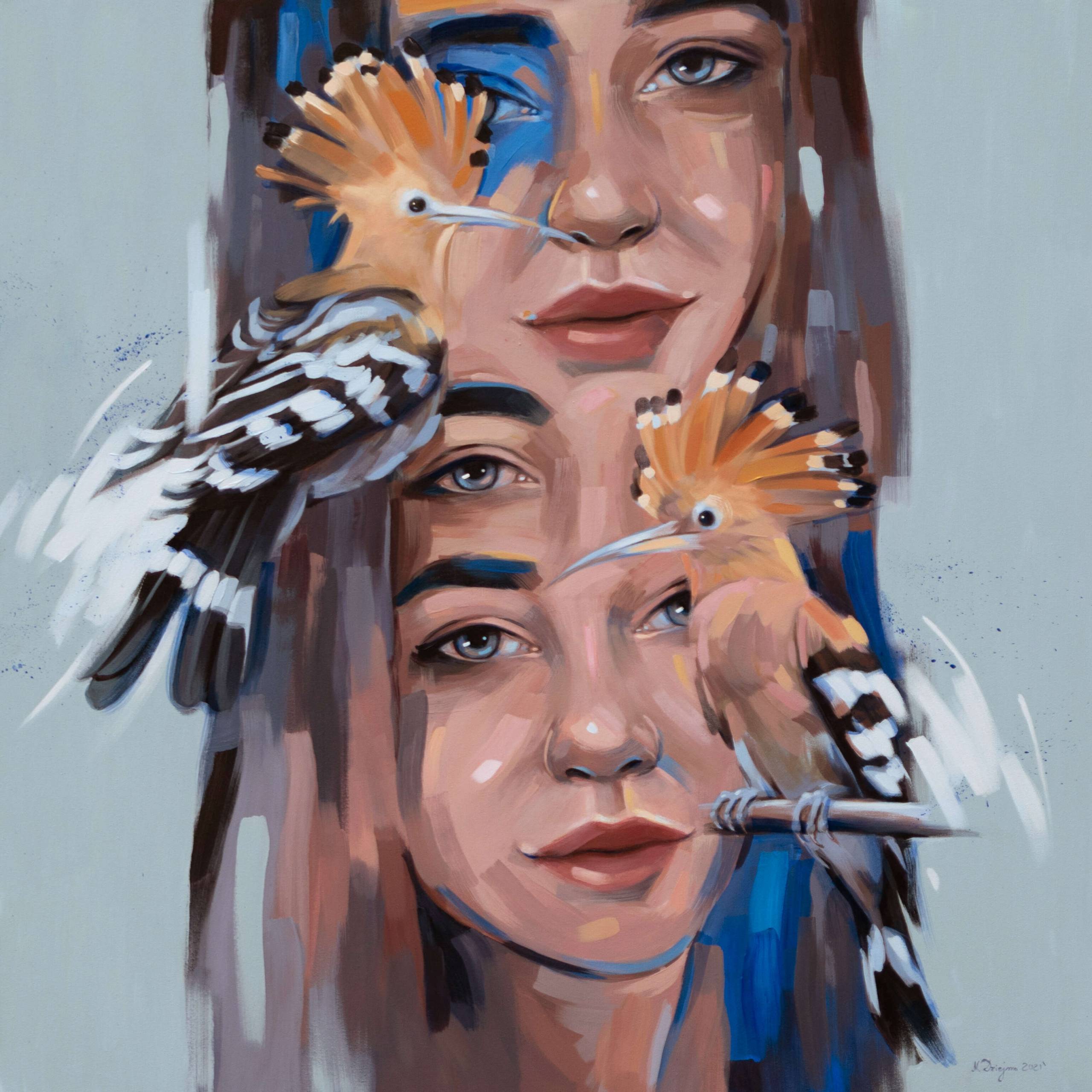 Kolorystyka jest stonowana, dominują delikatne brązy. Mocnym akcentem jest tutaj przelatująca kawka. Nie zabrakło też paru smaczków kolorystycznych, w formie szybkich pociągnięć pędzla: intensywne żółcie, pomarańcze i czerwienie. Kompozycja dzieła jest otwarta, a jego symetrię zaburza lecący ptak oraz skrzydło ukryte za głową dolnej twarzy. Mimo przelatującej kawki z obrazu emanuje spokój i harmonia. Jest też element tajemniczości (twarz na dole obrazu), dzięki czemu może być on trochę intrygujący. Obraz jest pokryty błyszczącym werniksem. Sygnatura w dolnym prawym rogu oraz z tyłu dzieła. Boczne części podobrazia stanowią kontynuację obrazu. Dzieło jest częścią otwartego cyklu malarskiego „Czar widzenia”. Kolekcja przedstawia lekko abstrakcyjne kobiece portrety, gdzie najistotniejszym elementem są oczy. Nie od dziś wiadomo, że są one odzwierciedleniem duszy i właśnie to było dla artystki motorem do stworzenia tego cyklu. Obraz znajdował się na indywidualnej wystawie artystki. Odbyła się ona we wrześniu 2022 roku w Miejskim Centrum Kultury w Tomaszowie Maz.