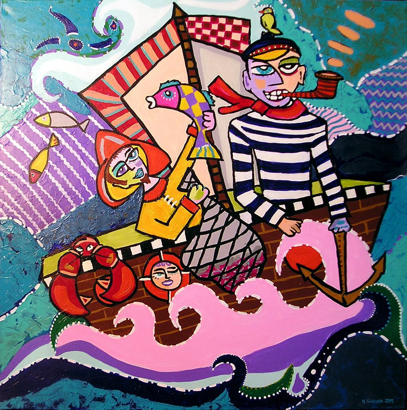 Obraz emanuje prawdziwą eksplozją kolorów i energii. Dominują tu intensywne odcienie niebieskiego, różowego i czerwonego, które tworzą razem niemal psychodeliczną kompozycję. W centrum widzimy grupę postaci na łodzi, wśród fal, z jednym marynarzem dzierżącym fajkę i rybą jak trofeum. Ach, jaki chaos, a zarazem jakaś magiczna symetria. Styl jest żywiołowy, trochę jak z bajki albo kreskówki. Mocne kontury i zgeometryzowane kształty dodają dynamiki. Patrząc na to dzieło, czuje się wiatr i przygodę. Malarski styl to mieszanka pop-artu z nutą kubizmu; można by rzec, że artysta bawi się formą. Emocje? To czysta przygoda, odważna i pełna niespodzianek. Dzieciak mógłby powiedzieć: „To tak, jakby piraci mieli imprezę na morzu!” Chociaż to tylko obraz, wywołuje chęć wkroczenia do jego świata. Oh, i ten anchor w ręku marynarza! Fascynujące, jak artysta bawi się równocześnie strukturą i kolorem. Patrząc na ten obraz, czujesz, jak morze faluje w rytmie twoich własnych myśli.