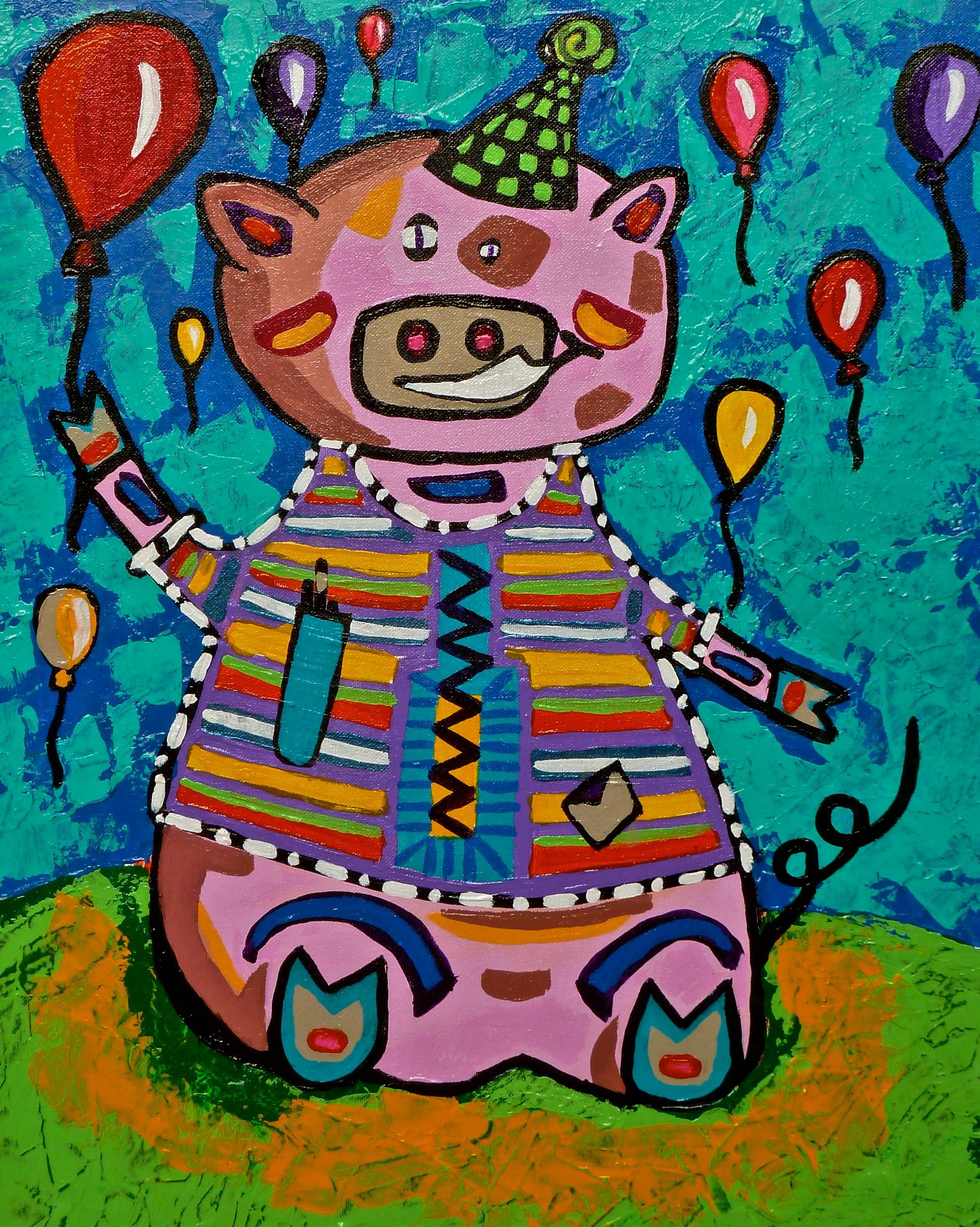 Żywe kolory tego obrazu aż biją w oczy, rozlewając się po płótnie jak farby na dziecięcej palecie. Widać tu różowego prosiaczka w fantazyjnym ubranku w paski, trzymającego balonik. Tło jest niebiesko-zielone, wirujące jak ocean pełen zabawy. Balony unoszą się do góry, jakby chciały dotknąć chmur. Atmosfera jest lekka, taka trochę jak happy-go-lucky. Styl artysty przypomina ilustracje z książek dla dzieci, zastosowano tu techniki, które nadają tekstury i dynamiki. Farba jest nakładana grubymi warstwami, co zdradza pewną spontaniczność. Może malarz chciał zatrzymać chwilę beztroski? Obraz może wywoływać śmiech u widza. Moja siostra zawsze mówi, że prosiaczki są najsłodsze. Oczywiście, te kolory mogą przywoływać wspomnienia z dzieciństwa. W tym chaosie kolorów każdy znajdzie coś dla siebie. A może artysta chce powiedzieć, że warto być dzieckiem w sercu? Niby świat szalony, lecz czy to nie jest w tym wszystkim the beauty? Patrząc na ten obraz, czuje się, że świat może być takim miejscem, gdzie radość ma zawsze pierwszeństwo. To naprawdę przyjemne i optymistyczne dzieło.