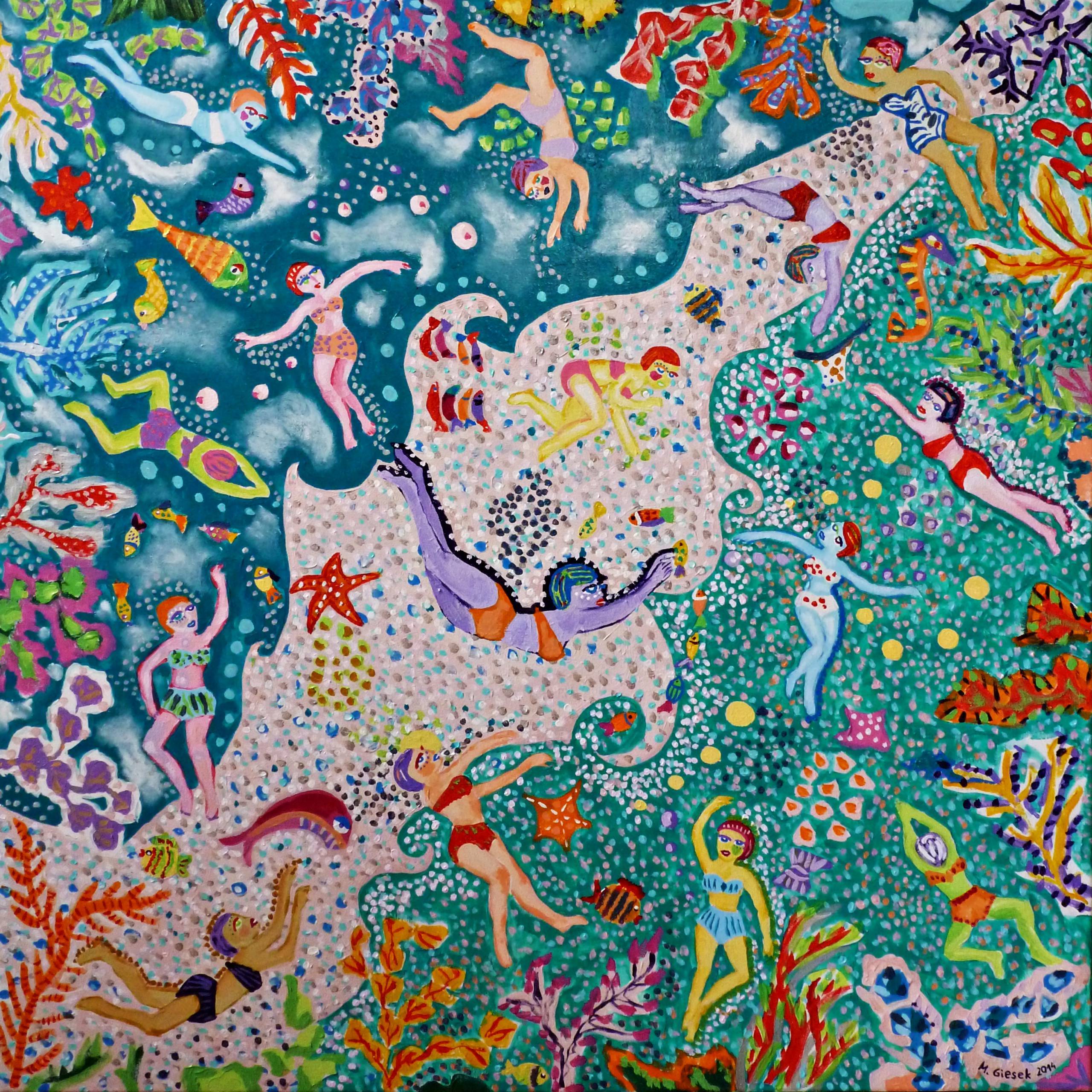 Obraz emanuje feerią barw. Wszechobecne zielenie i błękity mieszają się z ciepłymi pomarańczami i fioletami, tworząc dynamiczną kompozycję. Figura zanurzonych ludzi gładko przemieszcza się w wodzie, ich ciała otoczone są wirującymi bąbelkami i egzotycznymi rybami. Ten świat wygląda jak senne marzenie, gdzie wszystko płynie i tańczy w rytmie podwodnej muzyki. Nastrój obrazu jest niezwykle radosny. Czujemy się, jakbyśmy sami byli zaproszeni do tej magicznej kąpieli. Artysta używa bogatej palety kolorów i miękkich linii, które nadają kompozycji lekkości i ruchu. Styl przypomina dzieła z nurtu fowizmu - intensywne kolory i swobodne formy podkreślają emocje. Patrząc na ten obraz, można poczuć świeżość i beztroskę lata. Woda is blue and inviting. Człowiek niemal wyciąga rękę, aby dotknąć tych bajecznych, pływających postaci. "Oni pływają jak rybki" - to mógłby powiedzieć 7-letni odkrywca. Całość wywołuje uśmiech i pragnienie zanurzenia się w tym świecie bez zmartwień. Obcując z dziełem, mamy wrażenie, że czas się zatrzymał. Jest coś niesamowitego w tej harmonii barw i kształtów. Każda rybka i muszelka zdają się opowiadać swoją historię. Obraz przypomina, że czasami warto dać ponieść się fantazji i zanurzyć w nieznane wody.