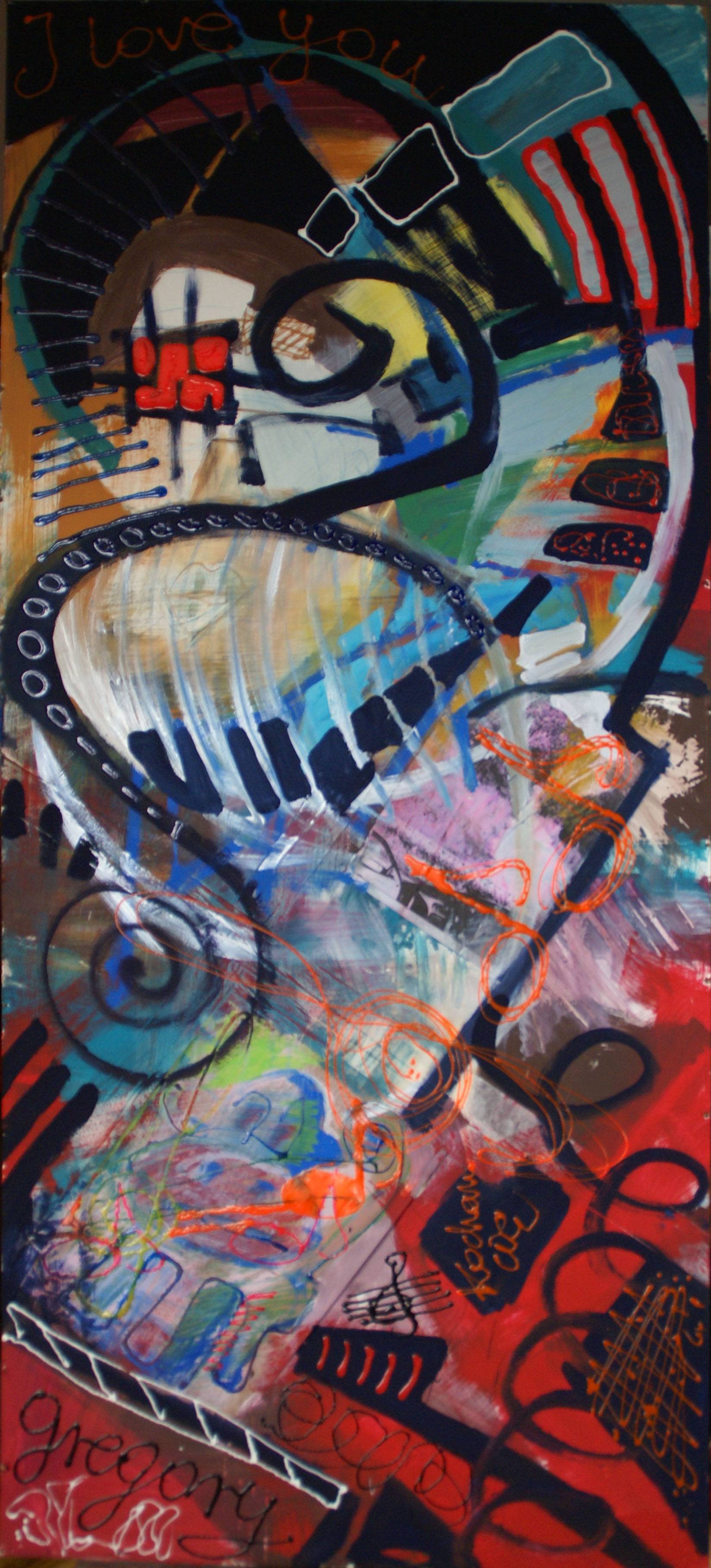 Obraz jest prawdziwą eksplozją kolorów i kształtów, które wirują i mieszają się, jakby były częścią jakiegoś galimatiasu. Dominują tutaj odcienie czerwieni, czerni, błękitu i zieleni, które tworzą dynamiczną kompozycję. Artysta postawił na technikę spontanicznego malowania – szerokie pociągnięcia pędzlem, chaotyczne krzywe i abstrakcyjne kształty. To wszystko razem wytwarza atmosferę twórczego chaosu, pełnego emocji i energii. Spoglądając na obraz, można poczuć nutę nostalgii i radości. Może to slogan "I love you" ukryty w rogu płótna dodaje tej nuty tęsknoty. Ktoś mógłby stwierdzić, że całe dzieło to jedno wielkie "wow". Można dostrzec energię, która tętni życiem, jakby obraz miał opowiedzieć nam historię. Fajnie jest myśleć, że artysta wręcz bawił się podczas tworzenia – wszystko zdaje się być odzwierciedleniem jego wewnętrznego świata. A moje dziecko by powiedziało: "Tu jest dużo kolorowych spirali i to jest super!". Każdy obserwator może poczuć coś innego, a może to po prostu magia artystyczna? Hope you see it too.
