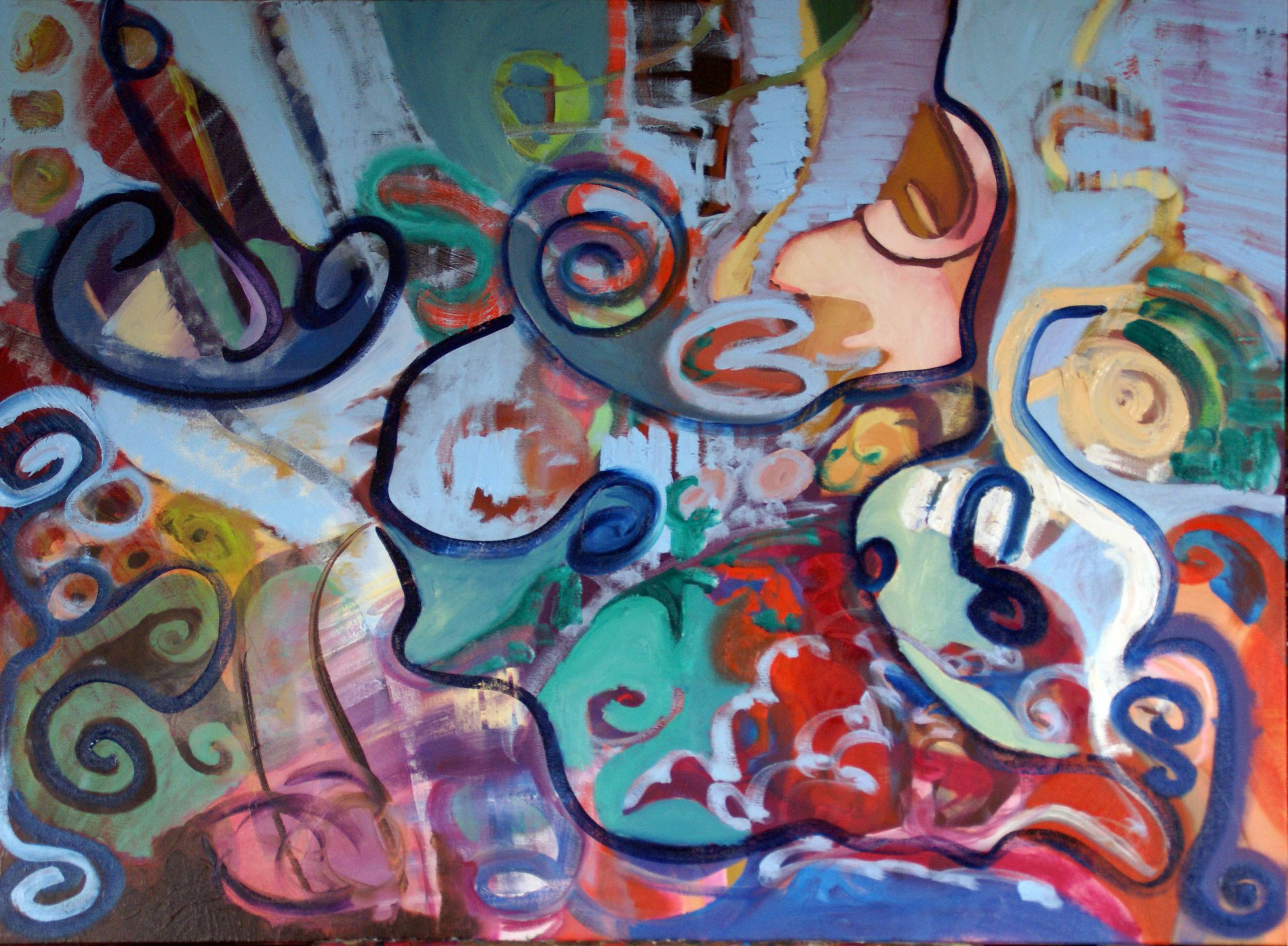 Obraz eksploduje feerią barw i kształtów, które chaotycznie wirują po całej płaszczyźnie. Dominują tu odcienie zieleni, niebieskiego i purpury, które zdają się tańczyć w nieskończonej harmonii. Kompozycja pełna jest spiralnych form i abstrakcyjnych kształtów, które przykuwają wzrok i prowokują do zastanowienia się, co właściwie przedstawia ten artwork. Atmosfera obrazu jest dynamiczna, niemal magnetyczna, wywołując uczucie zawirowania i tajemnicy. Artysta zastosował techniki akrylowe w sposób swobodny, co dodaje dziełu lekkości i spontaniczności. Pociągnięcia pędzla są widoczne, każda linia zdaje się być spontaniczna i pełna energii. To trochę jakby ktoś wziął żarty i kolory i pomieszał je razem w kalejdoskopie. Obraz wyzwala emocje zaskoczenia, niepokoju, ale też nieodpartej ciekawości. Dla mnie, to jak sen o lataniu nad kolorowym światem, który ciągle się zmienia. A seven-year-old might say, "To wygląda jak magiczny wir pełen kolorowych smoków!" Jest w tym jakaś magia i chaos jednocześnie. Całość jest piękna w swojej nieprzewidywalności i żywotności, a jednocześnie pobudza do refleksji nad tym, co niewidzialne i surrealistyczne.