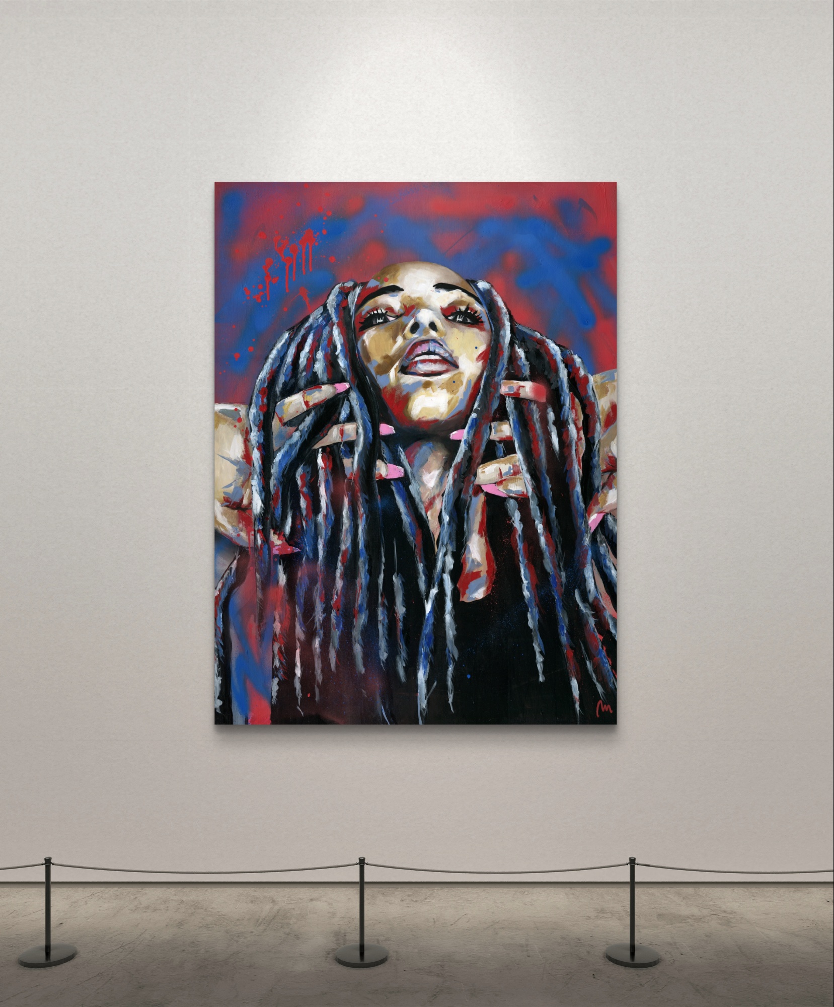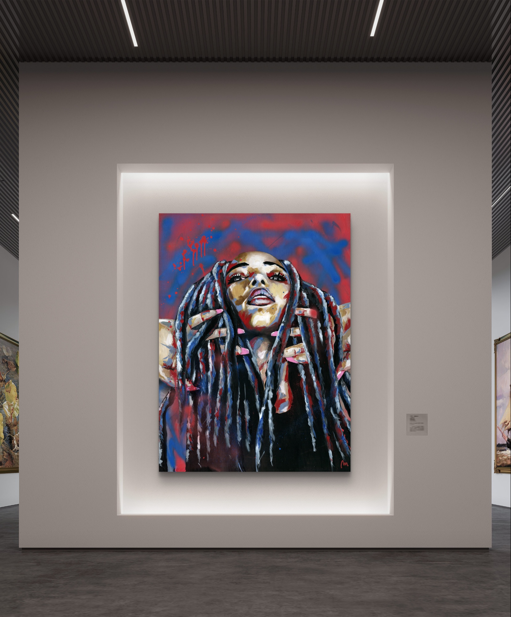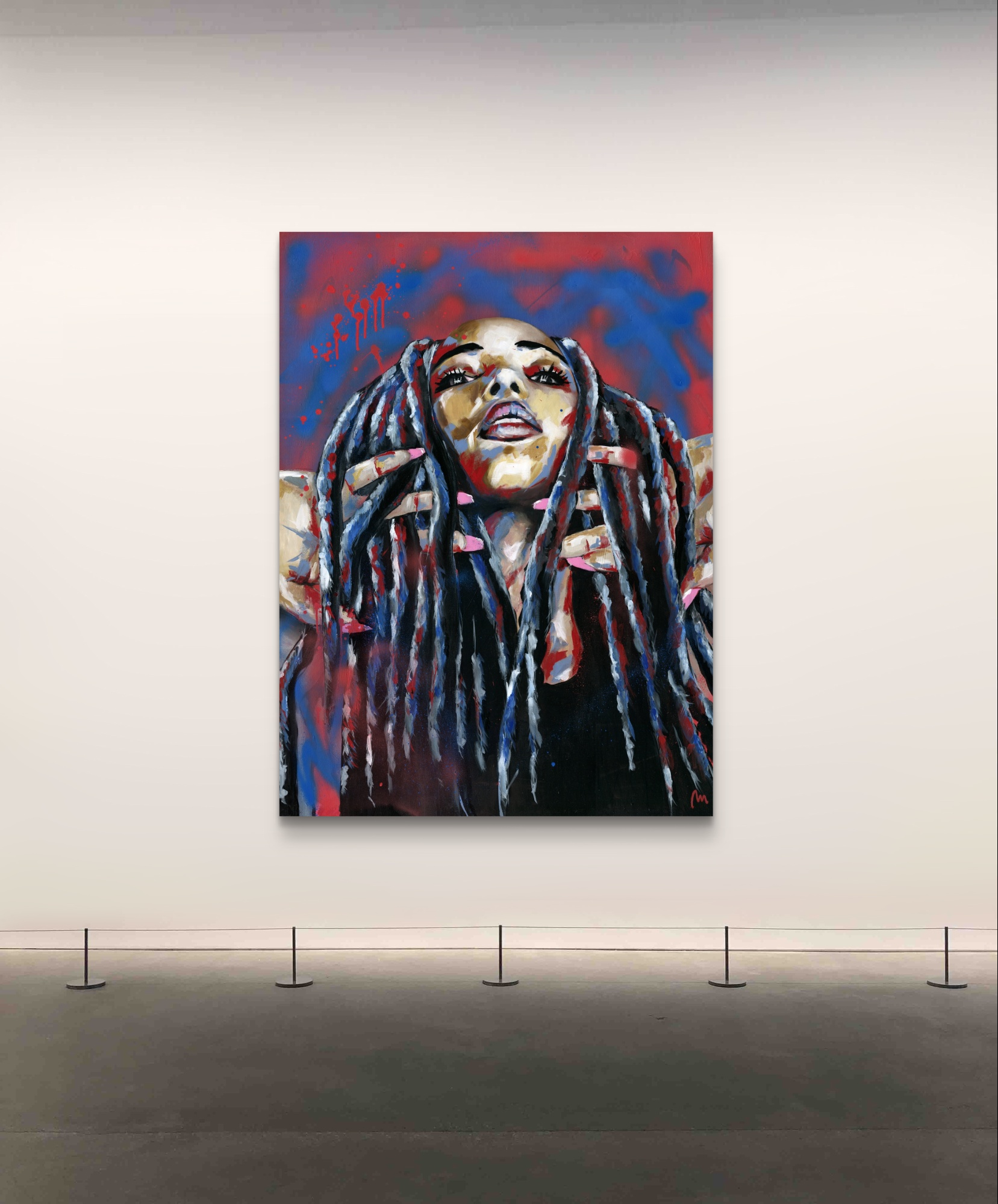 Obraz wciąga widza w wir intensywnych kolorów – króluje tu głęboka czerwień mieszająca się z chłodnym niebieskim, jakby artysta przelewał na płótno emocje z siłą wulkanu. Kompozycja przyciąga uwagę centralnym wizerunkiem kobiety z włosami jak spiralne wiry, które zdają się wychodzić poza granice dzieła. Dominujące są kontrasty: jasne cienie i ostre kontury twarzy tworzą efekt trójwymiarowości. Atmosfera obrazu jest niezwykle dynamiczna – emanuje z niego poczucie wolności i niezależności. Styl malarski to ekspresjonizm pełen energii i pasji, z widocznymi śladami pędzla i nieregularnymi krawędziami. Emocje wręcz eksplodują z każdej części kompozycji, aż trudno oderwać wzrok. Ten obraz sprawia, że myślę o sile i determinacji. Wow, aż chce się patrzeć i marzyć. Kolory są bardzo cool i robią duże wrażenie. Obraz można interpretować jako manifest wyzwolenia – każdy widz może odkryć w nim coś unikatowego, osobistego. To prawdziwa artystyczna "powerhouse". Oj, czyż nie jest inspirujący?