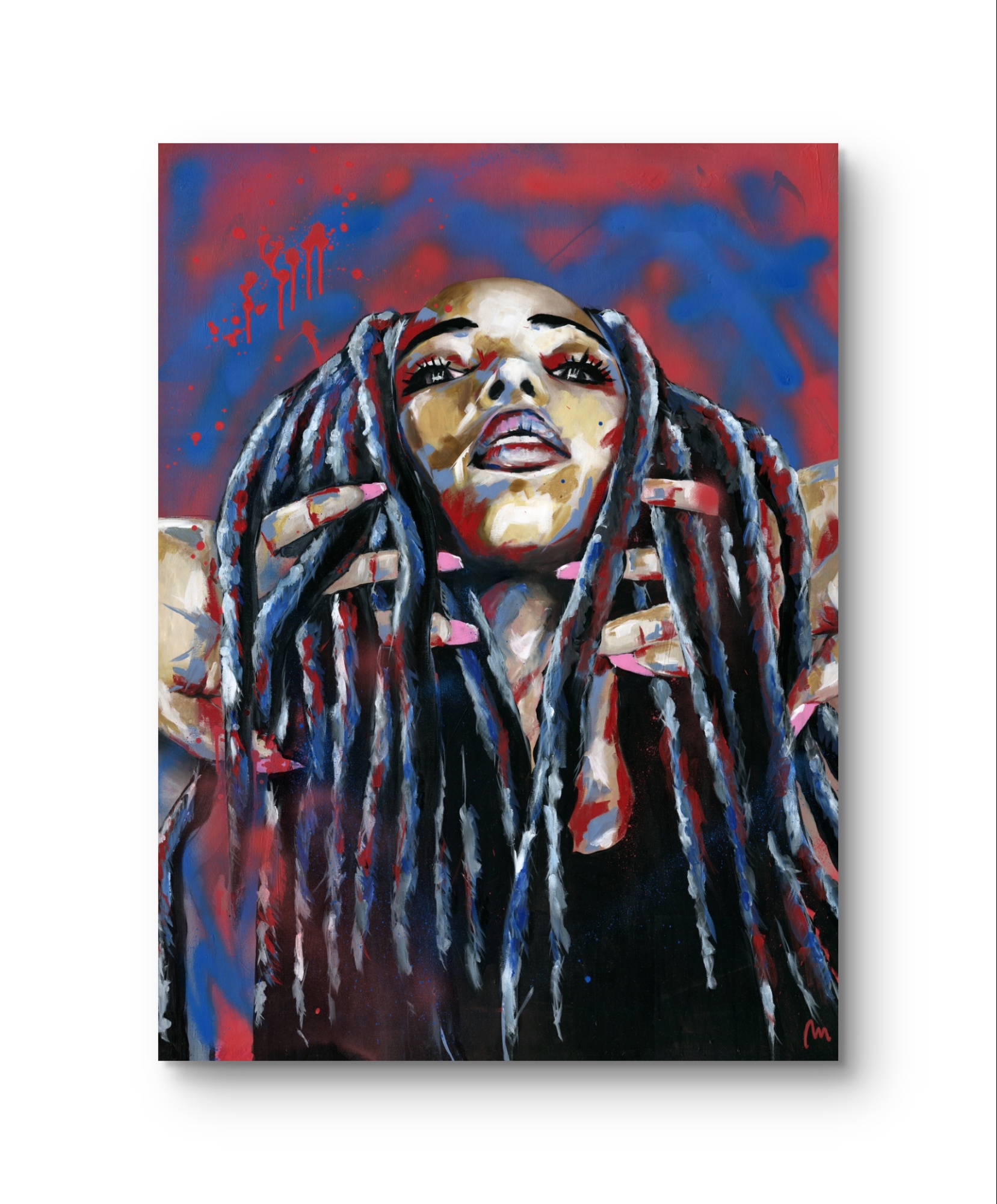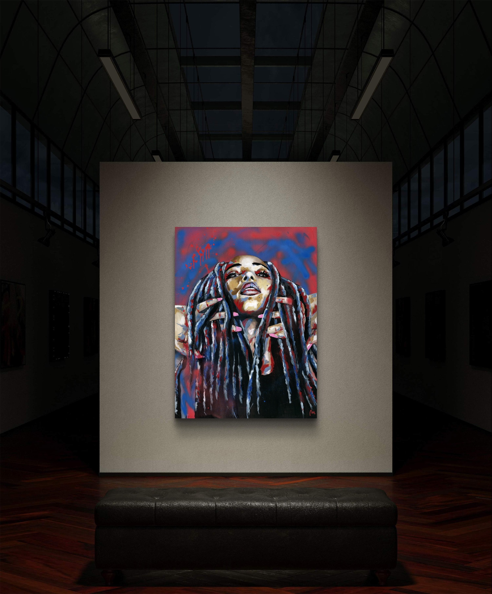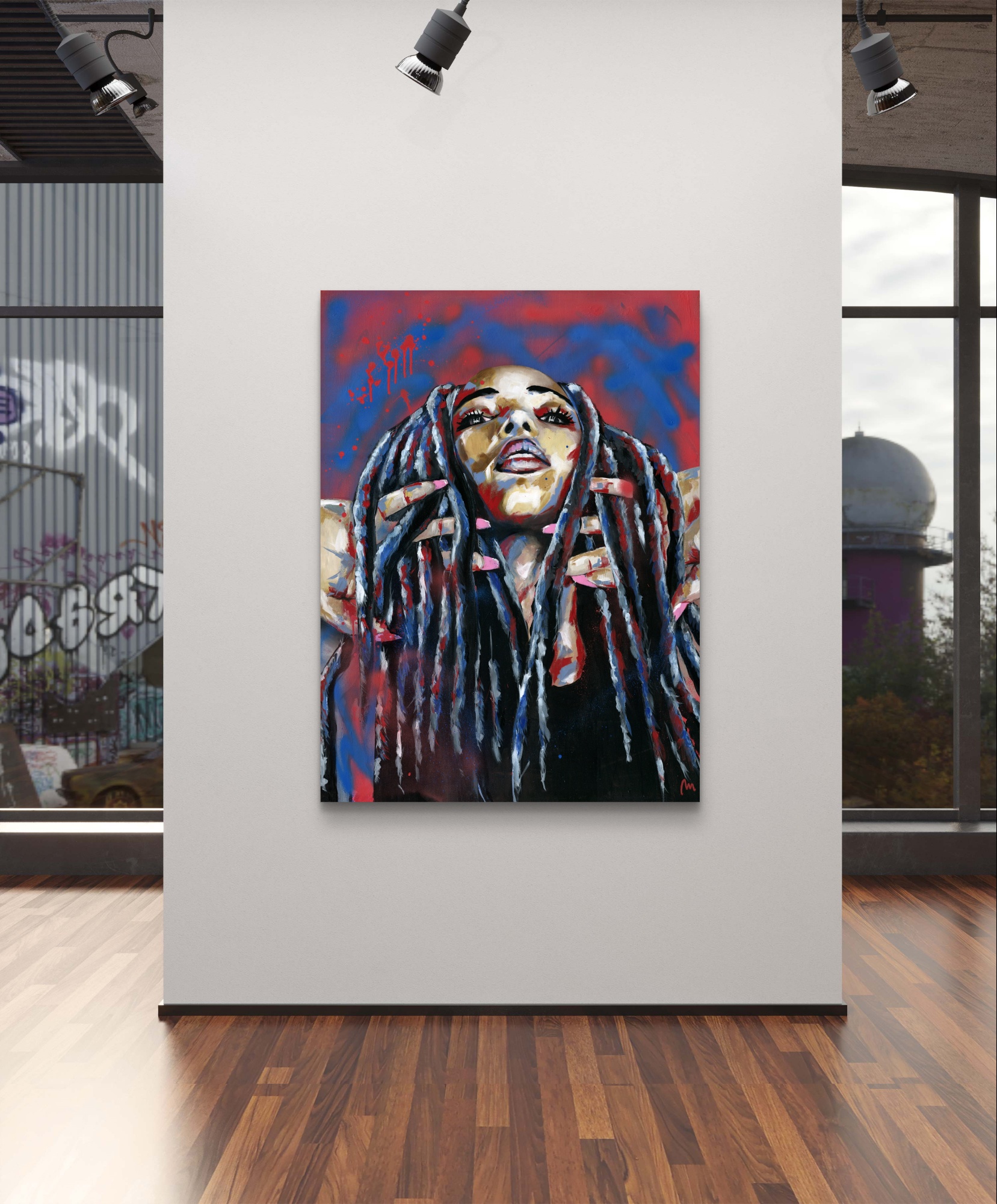Obraz wciąga widza w wir intensywnych kolorów – króluje tu głęboka czerwień mieszająca się z chłodnym niebieskim, jakby artysta przelewał na płótno emocje z siłą wulkanu. Kompozycja przyciąga uwagę centralnym wizerunkiem kobiety z włosami jak spiralne wiry, które zdają się wychodzić poza granice dzieła. Dominujące są kontrasty: jasne cienie i ostre kontury twarzy tworzą efekt trójwymiarowości. Atmosfera obrazu jest niezwykle dynamiczna – emanuje z niego poczucie wolności i niezależności. Styl malarski to ekspresjonizm pełen energii i pasji, z widocznymi śladami pędzla i nieregularnymi krawędziami. Emocje wręcz eksplodują z każdej części kompozycji, aż trudno oderwać wzrok. Ten obraz sprawia, że myślę o sile i determinacji. Wow, aż chce się patrzeć i marzyć. Kolory są bardzo cool i robią duże wrażenie. Obraz można interpretować jako manifest wyzwolenia – każdy widz może odkryć w nim coś unikatowego, osobistego. To prawdziwa artystyczna "powerhouse". Oj, czyż nie jest inspirujący?
