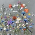 Obraz przedstawia delikatną kompozycję polnych kwiatów rozrzuconych na szarym tle. W centrum dominuje czerwony mak, otoczony przez błękitne chabry i białe stokrotki, które dodają życia i kolorów. Całość wygląda jak miniaturowa łąka, która zatrzymała się w ruchu. W tle, subtelne odcienie zielonego liści i łodyg kreują harmonię i balans. Atmosfera malowidła emanuje spokojem i lekkością. Przypomina ciepły letni dzień, kiedy słońce delikatnie ogrzewa skórę. Styl artystyczny jest nieco impresjonistyczny; widoczne są miękkie pociągnięcia pędzla, które tworzą efekt delikatnego rozmycia. Technika jest swobodna, co dodaje pracy dynamiczności, a jednocześnie jej ulotności. Obraz może budzić w widzu uczucie nostalgii za beztroskimi chwilami spędzonymi na łonie natury. "Wow, jakie śliczne kwiatki!" mogłoby powiedzieć dziecko patrzące na tę kompozycję. Kolory są tak żywe, że niemal można poczuć zapach tych kwiatów. It's almost magical. Osobiście czuję wewnętrzny spokój i przypływ radości, patrząc na tę sztukę, co potwierdza, że nawet najprostsze sceny natury mogą mieć ogromną moc wyrazu.
