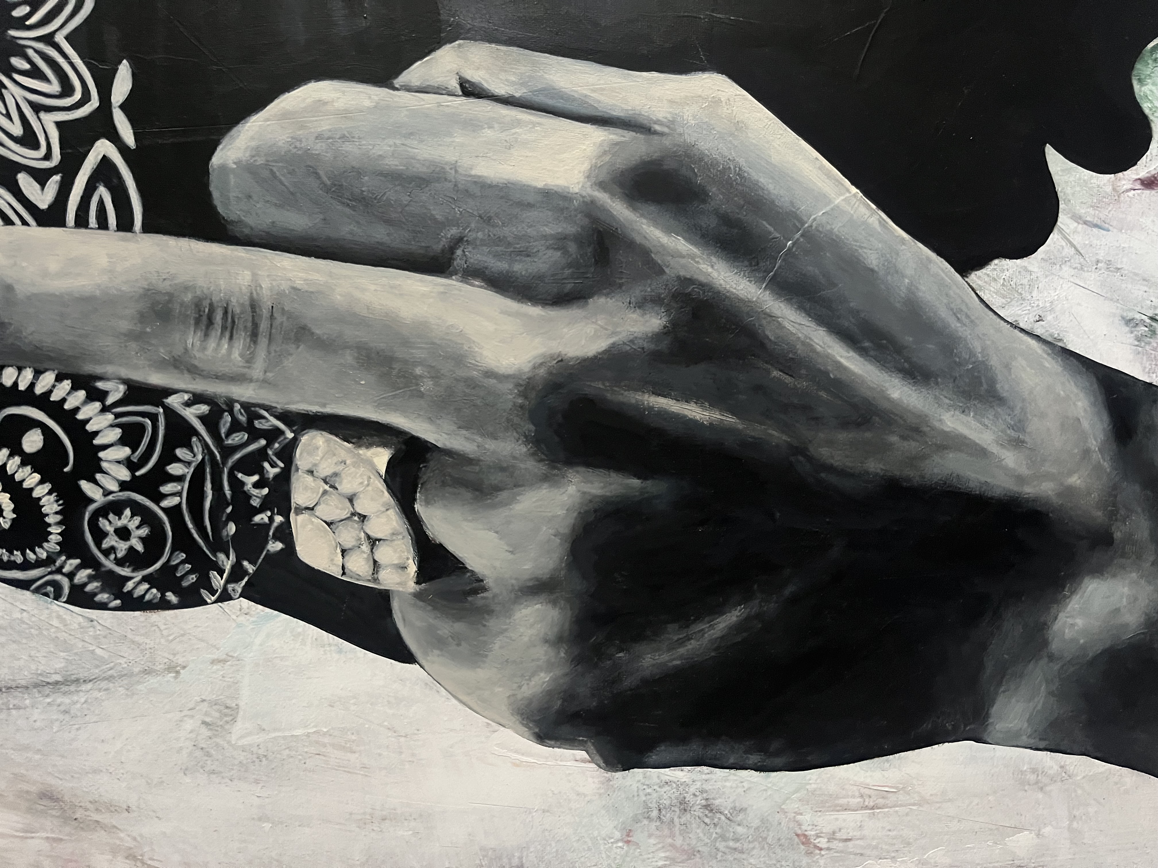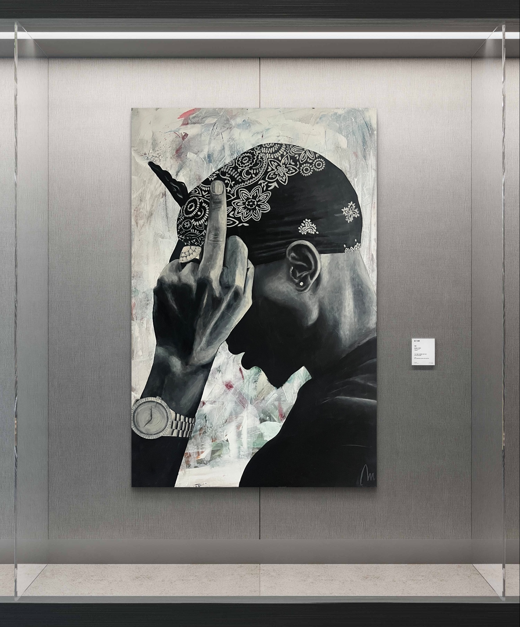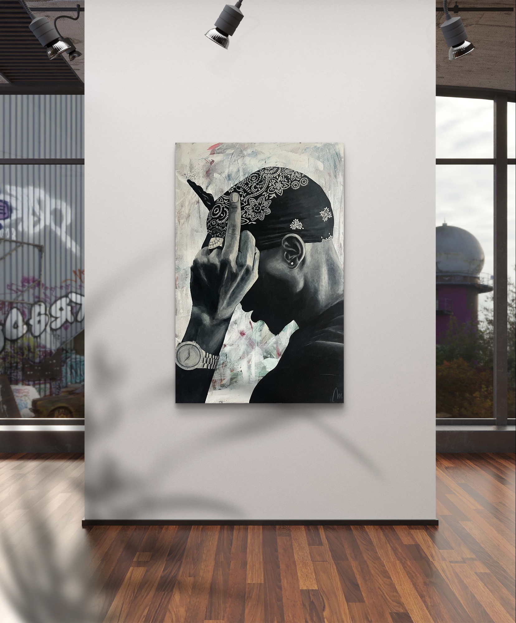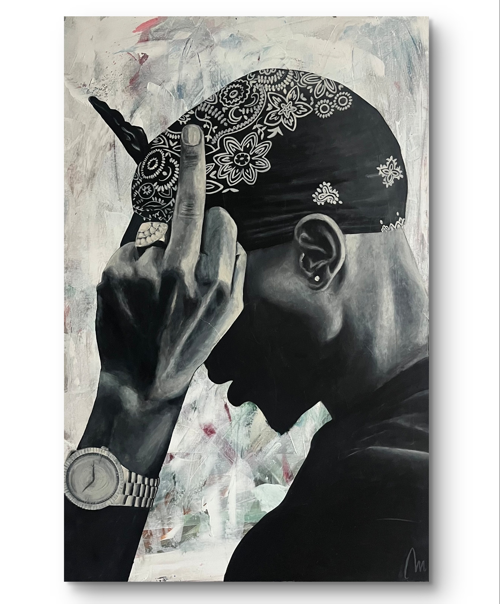Na obrazie widzimy mężczyznę w czarno-białej tonacji, co dodaje mu dramatyzmu i powagi. Dominującym elementem jest jego ręka z wyciągniętym środkowym palcem. Na głowie nosi bandanę z ornamentami, co wprowadza delikatny chaos wzorów. Tło jest zamglone, z subtelnymi smugami bieli, szarości i śladami czerwieni, co tworzy uczucie ruchu i dynamiki. Atmosfera obrazu jest nieco buntownicza i pełna wyzwania. Artysta zastosował technikę, która przypomina fotorealizm. Detale takie jak zegarek czy wzory na bandanie są wyjątkowo precyzyjne. Obraz wywołuje emocje sprzeciwu i niezależności. Widz może poczuć mieszankę buntu, ale także jakiegoś ukrytego smutku. Przesłanie? Może coś w stylu "leave me alone" - jedno mocne przesłanie. Patrząc na ten obraz, przypominają mi się młodzieńcze lata, kiedy to wszystko wydawało się walką. Może artysta chciał nam pokazać, że każdy ma swoje bitwy. A może po prostu to obraz o niezależności? Połączenie segmentów szczegółowych i miękkich kształtów daje wrażenie głębokiej refleksji nad jednostką i jej miejscem w świecie. Takie myśli nasuwają się przy dłuższym wpatrywaniu się w tę nieokiełznaną scenę.