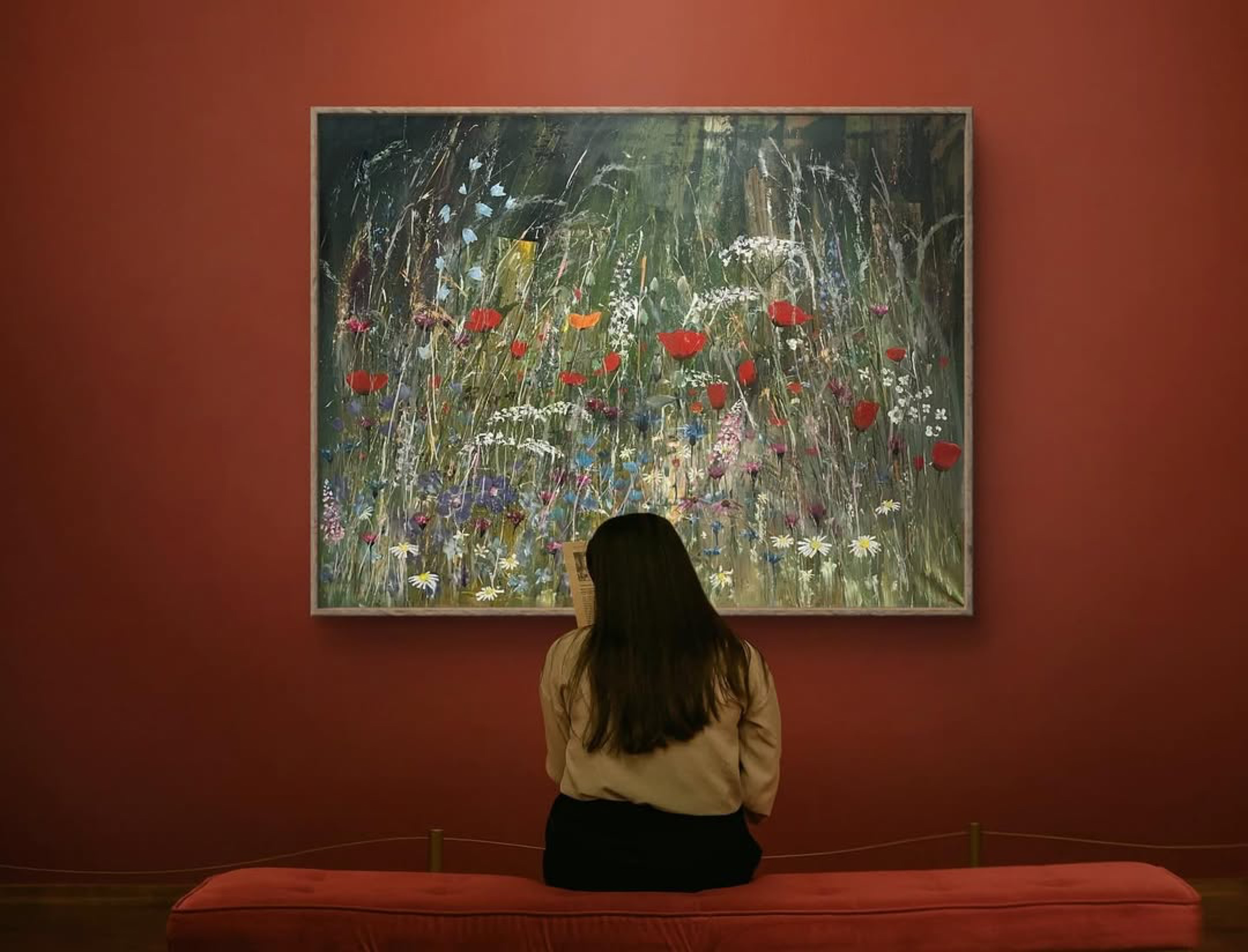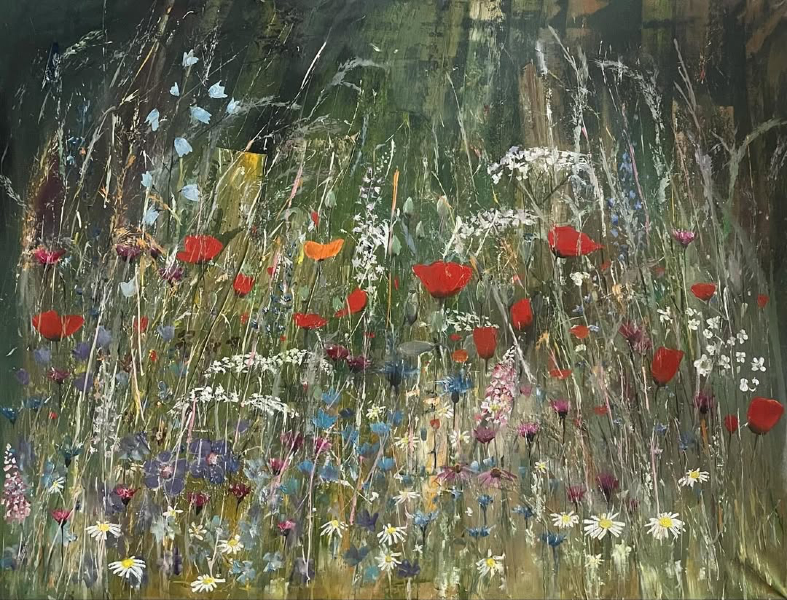 Obraz emanuje żywymi kolorami i dzikością przyrody, której nie da się okiełznać. W głębokiej zieleni lasu migoczą czerwone maki, białe stokrotki i niebieskie dzwonki. Kompozycja jest chaotyczna, pełna dynamiki. Jakby ktoś puścił łąkę wolno, pozwalając jej żyć własnym życiem. Technika malarska wykorzystuje migotanie światła, które prześwituje przez liście. Artysta pędzlem maluje chaos, ale jakże piękny chaos. Nastrój obrazu przypomina letni dzień, kiedy czas znika, a jedynym dźwiękiem jest szum trawy. Siedmioletnie dziecko powiedziałoby: "Kwiateczki są wszędzie!" Wyrazisty kontrast barw prowadzi do refleksji. Może to opowieść o ulotnoci natury, spontaniczności. Kolejne spojrzenie i pojawia się poczucie beztroski, jakbyśmy wracali do czasów dzieciństwa. Wow, to jest magia więzi człowieka z naturą. Ogarnia mnie swego rodzaju "wonder" - zdumienie pięknem, którego nie da się uchwycić słowami.