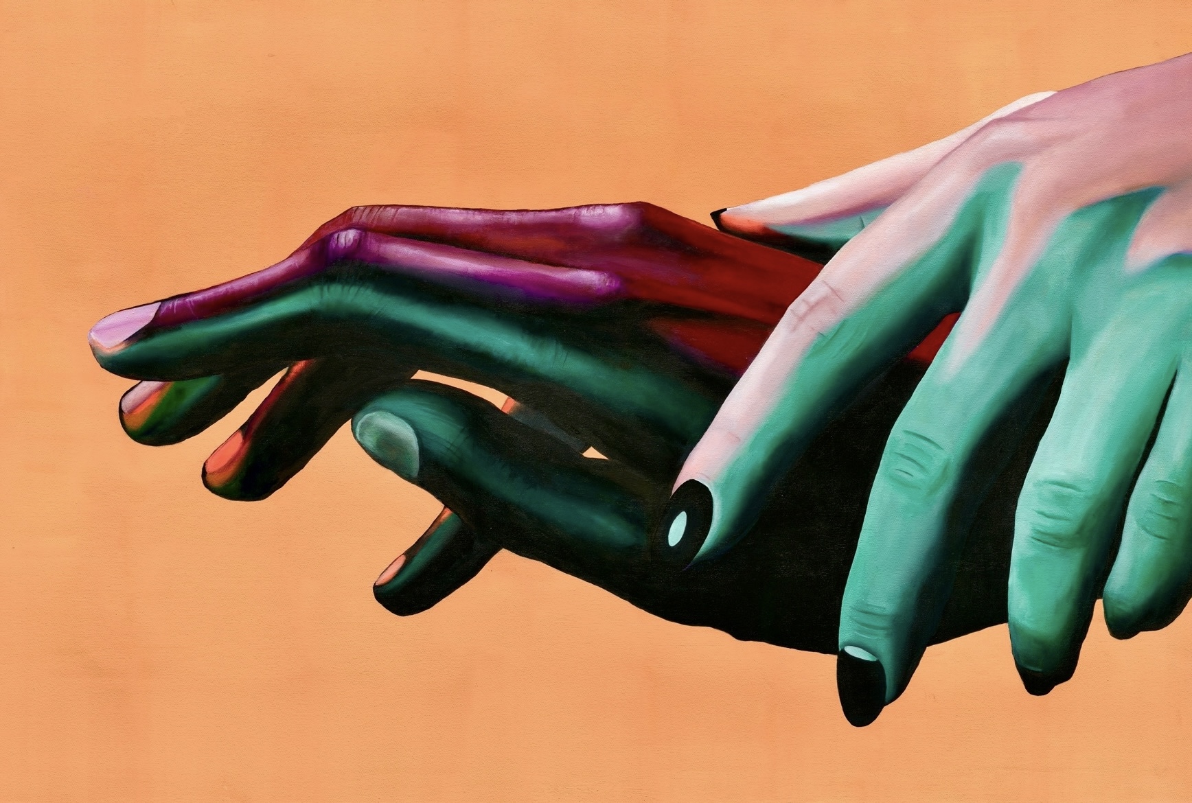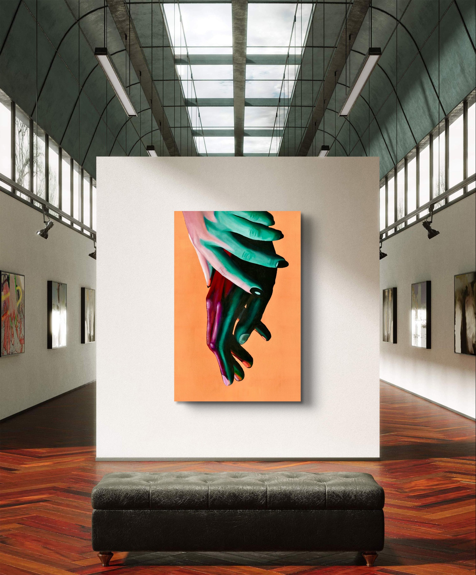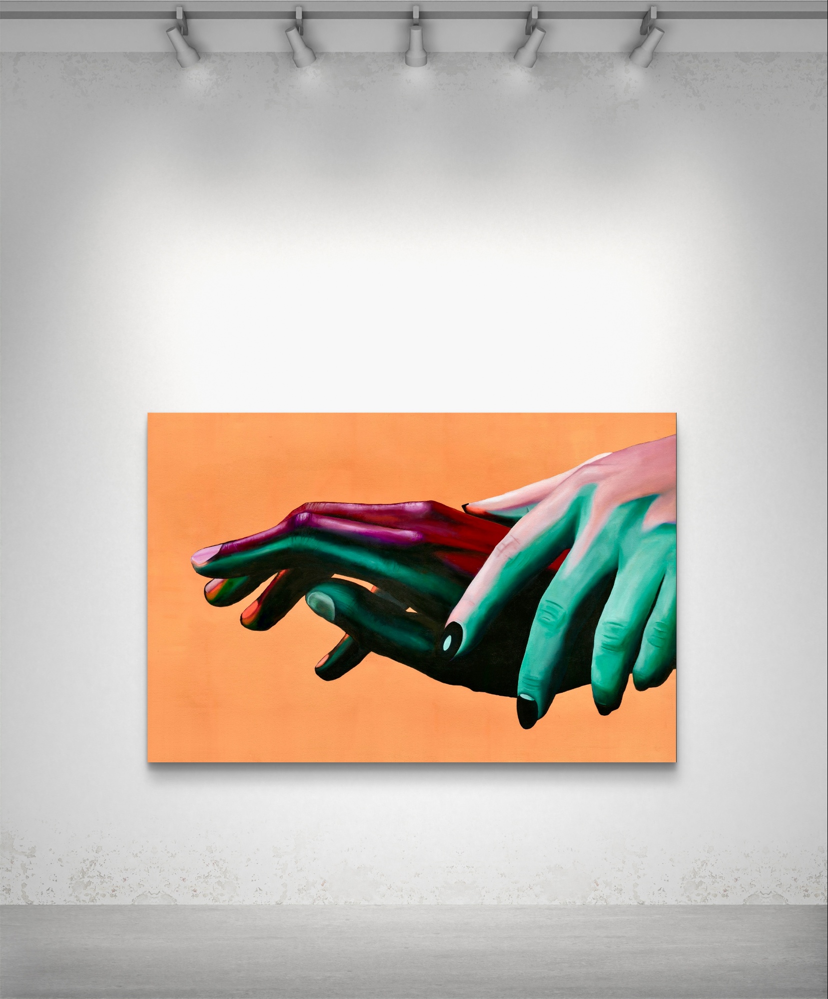 Na obrazie widać splecione dłonie, które podkreślają delikatność i subtelność ludzkiego kontaktu. Ręce są w zielonkawej tonacji, co nadaje im nieco surrealistycznego wyglądu. Tło jest pomarańczowe, kontrastując z chłodnymi odcieniami dłoni i nadając im wyrazistości. Kompozycja jest prosta, ale wciągająca, przyciągająca wzrok i skłaniająca do refleksji. Ciepły nastrój tła w połączeniu z chłodnymi rękoma tworzy swoisty balans, emanując emocją spokoju i harmonii. Artysta zastosował technikę malarską, która przypomina nieco fotorealizm, jednak z nutą abstrakcji przez użycie nietypowych kolorów. Znaczenie obrazu jest otwarte na interpretację – to może być symbol miłości, przyjaźni lub połączenia w trudnych chwilach. Dzieciak mógłby powiedzieć: to wygląda jak dłonie przyjaciół. Obraz jest magiczny – coś jakby z "Alice in Wonderland". Całość przywołuje uczucia nostalgii i poczucia jedności, a jednocześnie dziwną tęsknotę za czymś nieuchwytnym.