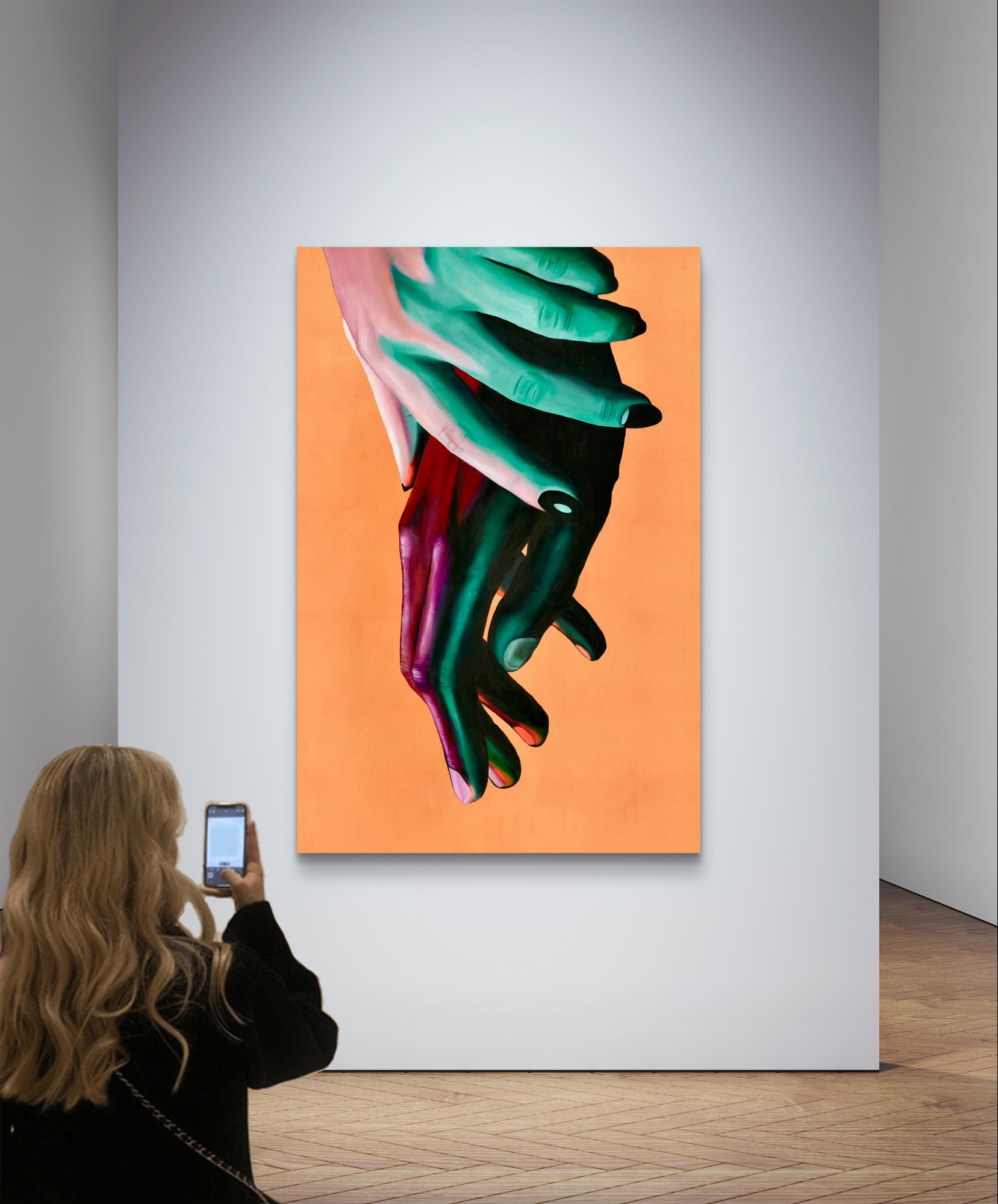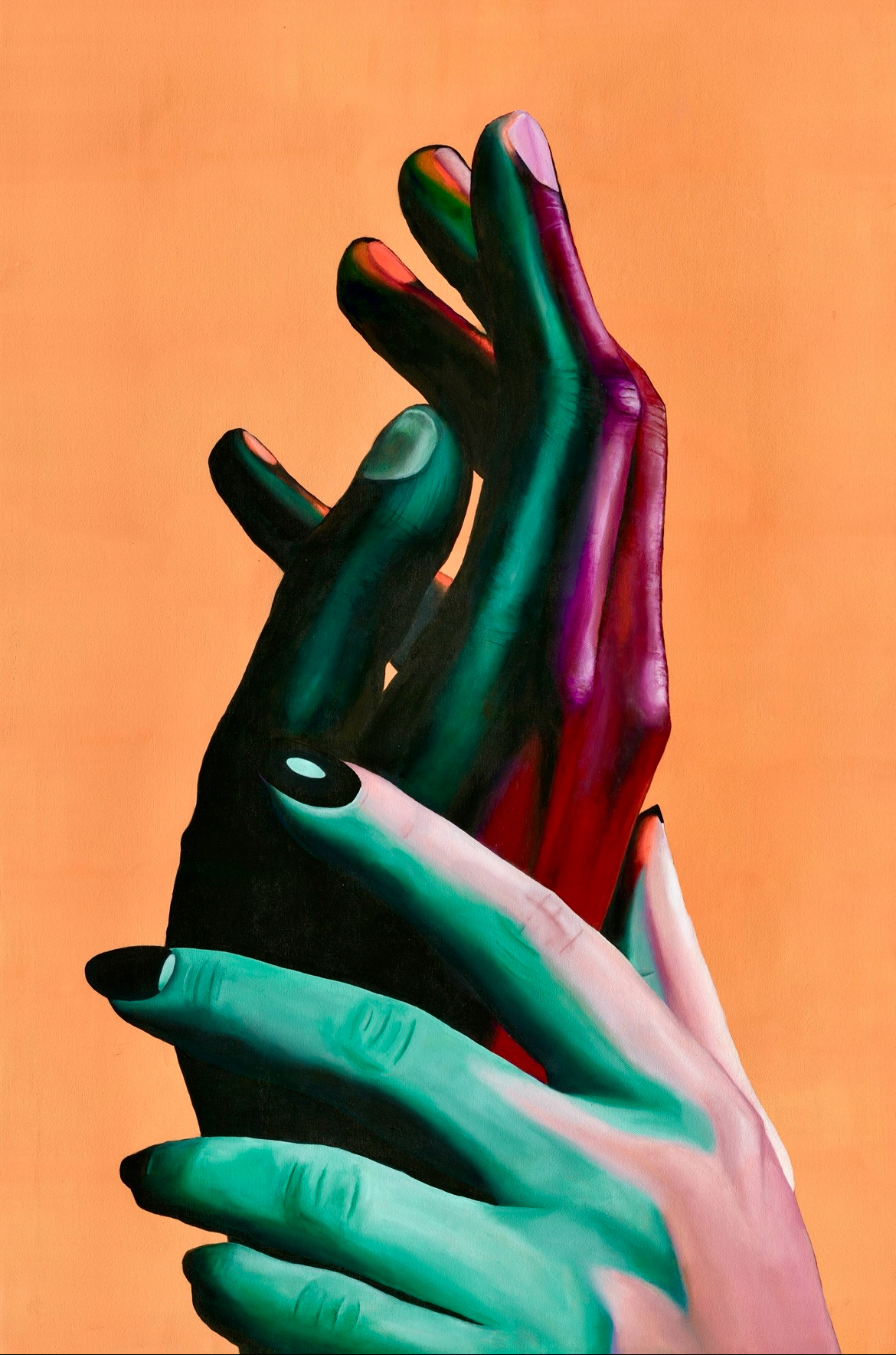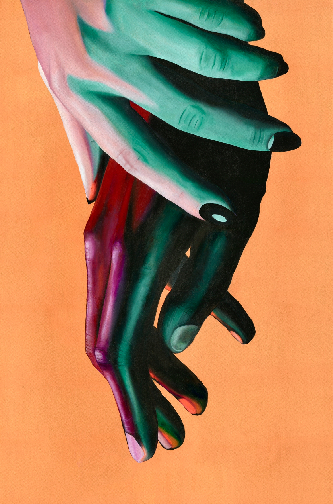 Na obrazie widać splecione dłonie, które podkreślają delikatność i subtelność ludzkiego kontaktu. Ręce są w zielonkawej tonacji, co nadaje im nieco surrealistycznego wyglądu. Tło jest pomarańczowe, kontrastując z chłodnymi odcieniami dłoni i nadając im wyrazistości. Kompozycja jest prosta, ale wciągająca, przyciągająca wzrok i skłaniająca do refleksji. Ciepły nastrój tła w połączeniu z chłodnymi rękoma tworzy swoisty balans, emanując emocją spokoju i harmonii. Artysta zastosował technikę malarską, która przypomina nieco fotorealizm, jednak z nutą abstrakcji przez użycie nietypowych kolorów. Znaczenie obrazu jest otwarte na interpretację – to może być symbol miłości, przyjaźni lub połączenia w trudnych chwilach. Dzieciak mógłby powiedzieć: to wygląda jak dłonie przyjaciół. Obraz jest magiczny – coś jakby z "Alice in Wonderland". Całość przywołuje uczucia nostalgii i poczucia jedności, a jednocześnie dziwną tęsknotę za czymś nieuchwytnym.