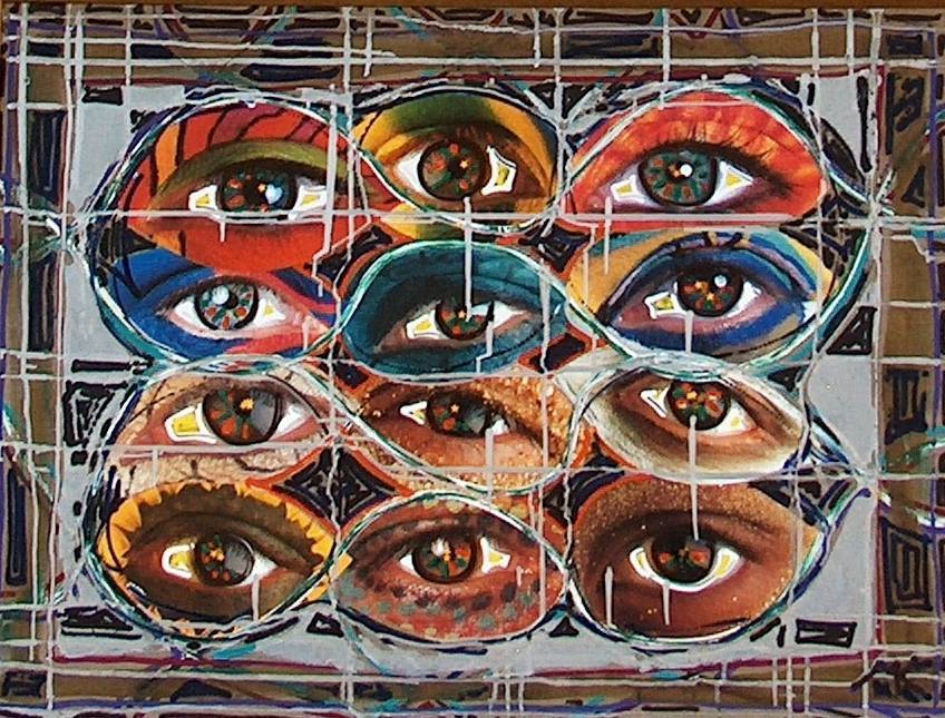 Obraz jest niezwykle fascynujący. Widzimy na nim dziewięć par oczu, każde z nich zamknięte w swoistej mozaice kolorów. Soczyste czerwienie, głębokie błękity i zielenie przeplatają się, tworząc dynamiczną i pełną życia kompozycję. Oczy patrzą w różnych kierunkach, jakby coś śledziły lub ukrywały tajemnice. Atmosferę dzieła można określić jako tajemniczą i hipnotyzującą. Artysta użył techniki kolażu z wyraźnymi elementami abstrakcji. Czuje się tu eksplozja creativity, co przyciąga uwagę na dłuższą chwilę. Każdy z widzów może znaleźć coś swojego – jedni zobaczą duszę, inni tylko zawirowanie barw. Obraz emanuje energią – trochę niepokojącą, trochę zachwycającą. Kolory są nasycone, niemal krzyczące. Jest to dzieło, które wciąga i nie pozwala milknąć emocjom. Czasami myślę, że te oczy są smutne, ale może tylko tak mi się wydaje. Albo są szczęśliwe, ale to też mi się wydaje. Jeden z widzów może mieć wrażenie, że patrzą na niego oczyma kogoś bliskiego, inny zaś poczuje dystans. Z daleka wygląda jak uporządkowany chaos, z bliska - jak nieodgadniona układanka. Patrzysz i nie możesz przestać. To sztuka, która wchodzi w interakcję z twoją wyobraźnią. Fascynujące, prawda?