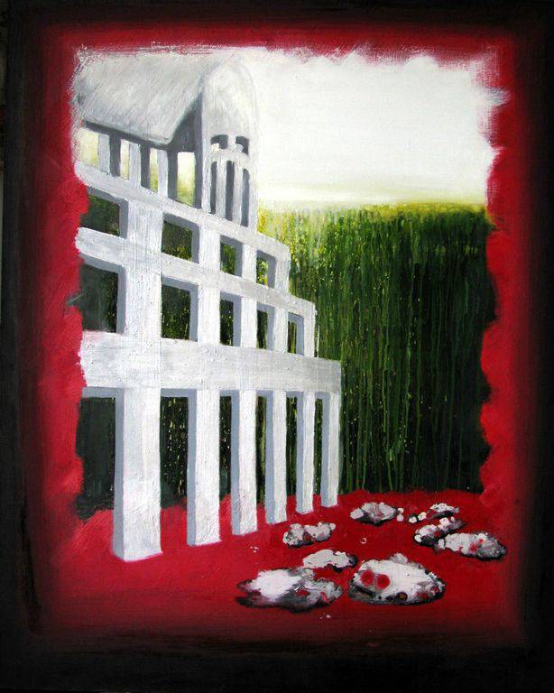 Obraz przesiąknięty jest kontrastem. Dominują odcienie czerwieni i zieleni, które tworzą intensywną i nieco niepokojącą atmosferę. Na pierwszy plan wysuwa się monumentalna, biała struktura o geometrycznych kształtach przypominająca architektoniczne arcydzieło. W tle rozciąga się mroczny, zielony horyzont, jakby tajemniczy las ukryty w gęstej mgle. Całość przywodzi na myśl surrealizm, który łączy realność z abstrakcją, zachęcając odbiorcę do poszukiwań ukrytych znaczeń. Artysta zastosował techniki mieszane, co nadaje obrazowi teksturalnej głębi. Można dostrzec grubą warstwę farby, która tworzy efekt trójwymiarowości. Naprawdę czuć tu pewną dynamikę — jakby budynek powoli wznosił się z ziemi lub topił w czerwonej tafli. Jest to miejsce pełne tajemnicy, co sprawia, że patrzący zastanawia się, co dalej. Dla dziecka: Budynek wygląda jak wielka wieża zabaw! Kałuże na ziemi przypominają chmury, które upadły z nieba. Atmosfera jest nieco niepokojąca, ale też intrygująca i przyciągająca wzrok. A red color jest tu niczym płonący płaszcz, który nadaje scenie dramatyczny wyraz. Obraz zachęca do refleksji o miejscu człowieka w tym niepewnym świecie i otaczających nas strukturach.