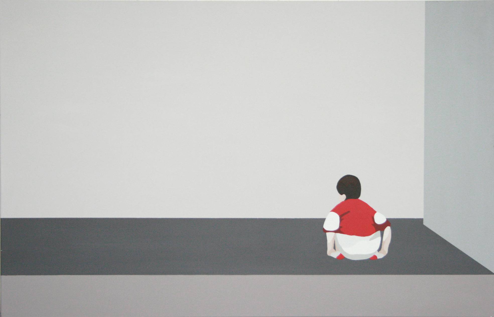 Obraz emanuje minimalistycznym urokiem. Na tle surowej, szarej ściany widzimy samotną postać dziecka w czerwono-białym ubraniu, która siedzi w kucki. Kolory są proste, ale kontrastowe, co przyciąga wzrok i nadaje scenie surowego charakteru. Dominują szarości, które przełamuje jaskrawa czerwień, nadając obrazowi dynamiczny akcent. Kompozycja jest bardzo wyważona, z dzieckiem umieszczonym po prawej stronie, co kieruje naszą uwagę na przestrzeń wokół. Nastrój dzieła jest nieco melancholijny, przypominający o samotności i refleksji. Minimalizm stylu, z uproszczonymi formami, podkreśla izolację i introwertyczny nastrój. Artysta używa techniki płaskiej plamy barwnej, co nadaje obrazowi bezpretensjonalności i bezpośredniości. Obraz może wywoływać wiele emocji. Moje serce mówi, że dzieciak jest smutny! Może to być nostalgia za dziecięcą niewinnością lub nawet refleksja nad odosobnieniem we współczesnym świecie. Widząc to, myślę sobie: ciekawe, o czym myśli. In one word, this painting is "thought-provoking". Kto wie, może to też komentarz na temat potrzeby refleksji w naszym zabieganym życiu. Po prostu obraz skłania do zastanowienia i wzbudza ciekawe przemyślenia. To jak mała historia w dużej przestrzeni.