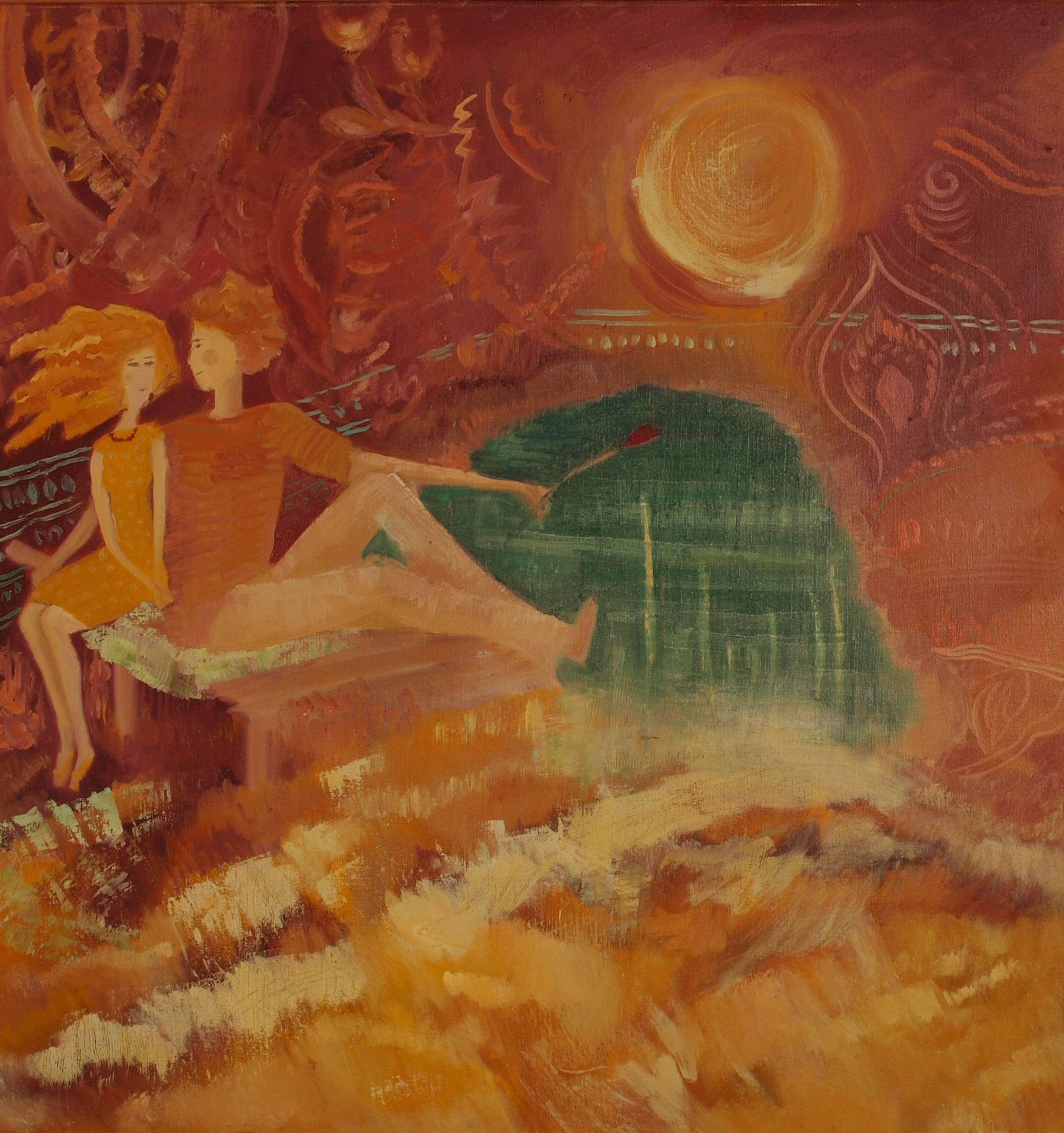 Obraz tętni kolorami, które wręcz ożywają. Przeważają ciepłe odcienie czerwieni, pomarańczu i żółci, przełamane delikatnym zielonym akcentem. Postacie, niczym wyjęte z bajki, siedzą na ławce nad jeziorem. Ich włosy rozwiewa wiatr, a promienie słońca tworzą wokół nich magiczną aurę. Całość sprawia wrażenie, jakby czas się zatrzymał, tworząc chwilę pełną spokoju i romantyzmu. Artysta zastosował technikę impasto, nakładając farbę grubymi warstwami, co nadaje powierzchni obrazu trójwymiarowy aspekt. Smugi pędzla są widoczne, ale też organicznie wtapiają się w tło. Obraz wywołuje nostalgiczne emocje, przypomina mi o letnich wieczorach nad jeziorem. Może to dlatego, że ma w sobie coś, co mówi o prostocie i bliskości. Wywołuje skojarzenia z chwilami, kiedy śmiech i szept są jedynym, co się liczy. „It's beautiful,” pomyślałem, patrząc na zachód słońca w tle. A teraz coś, co powiedziałby 7-latek: Słońce wygląda jak wielka, żółta pizza! Ta praca to połączenie żywiołowości i kontemplacji, ma w sobie coś, co przyciąga i nie pozwala oderwać oczu.