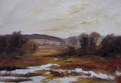 Obraz przedstawia spokojny, jesienny krajobraz, w którym dominują ciepłe odcienie brązu, złota i soczystej zieleni. Delikatne pasma bieli sugerują pierwsze ślady jesiennych przymrozków lub lekkiego, chmurzastego nieba. Horyzont lekko się kołysze, jakby utworzony przez łagodne wzniesienia czy wzgórza. To cisza przed burzą albo po niej, kto wie. Kolory są zmiękczone, jakby same chciały zasnąć na chwilę. Atmosfera dzieła jest nostalgiczna i pełna spokoju. Można prawie poczuć wilgoć powietrza i lekką bryzę, która muska twarz. Artysta posługując się techniką impastu, stworzył powierzchnię, która żyje i oddycha. Pociągnięcia pędzla są swobodne, z lekką nutą chaosu, jakby przemówić chciały do widza w języku nature's whisper. Patrząc na tę scenę, serce może poczuć ciepło, jakby wracało do wspomnień z dzieciństwa, kiedy biegało się po podobnych polach. „Wow, jakie to duże!” mogłoby wykrzyknąć 7-letnie dziecko, zachwycone ogromem przestrzeni. To obraz, który zachęca do refleksji, zanurzenia się w tym, co minione, a jednocześnie pełne jest życia. A może to po prostu „peace” w czystej formie. To połączenie natury i emocji, które sprawia, że chce się zatrzymać przed tym dziełem na dłużej.