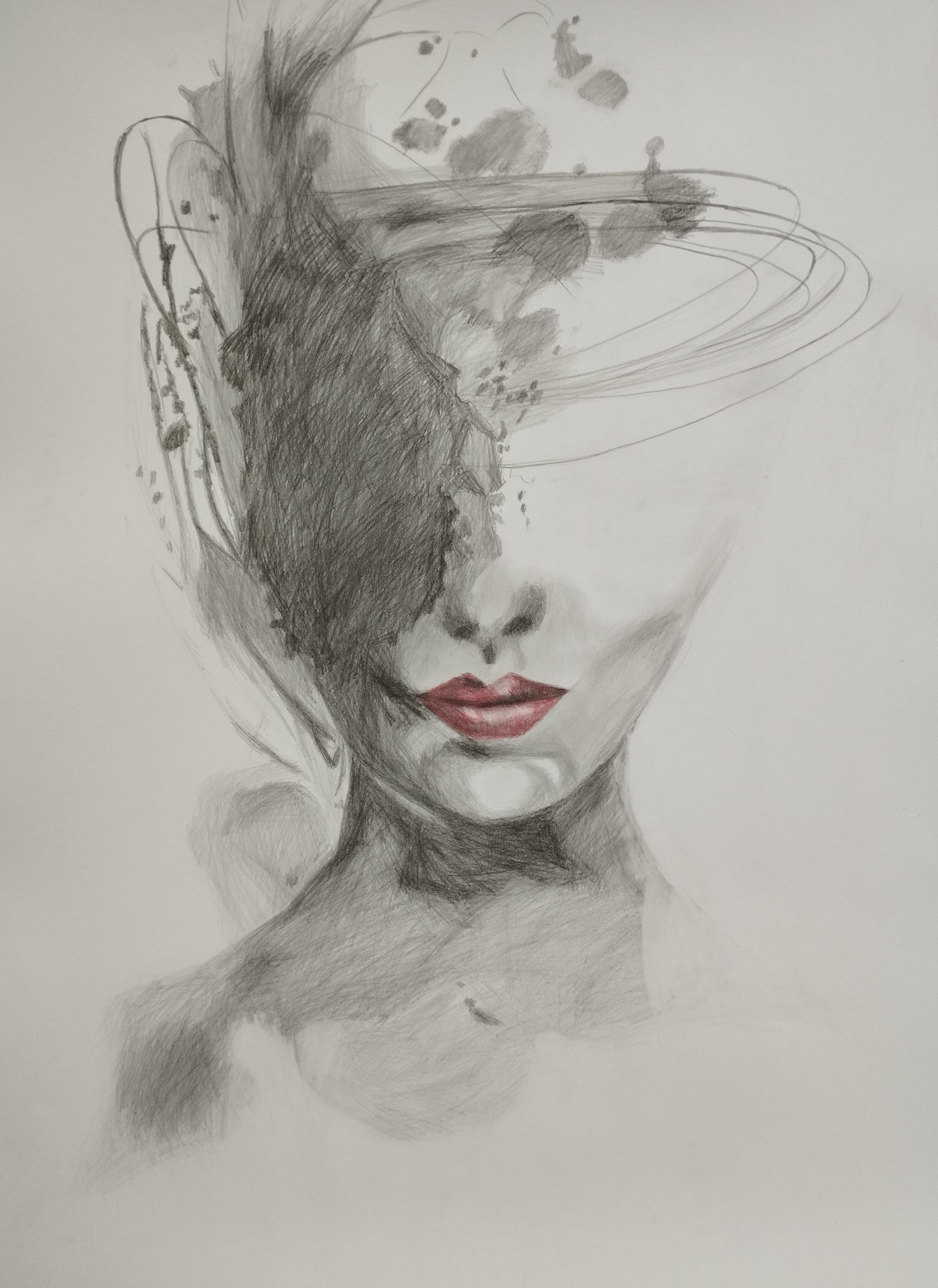 Obraz przedstawia twarz, której prawa strona rozmywa się w chaotyczne kreski i plamy. Dominują odcienie szarości i czerni, przełamane intensywną czerwienią ust. Ten kontrast kolorów przyciąga wzrok, podczas gdy całość utrzymana jest w minimalistycznym stylu. Kompozycja wygląda jakby była jednocześnie przemyślana i improwizowana - takie controlled chaos, można by rzec. Kształty płynnie przechodzą jedne w drugie, tworząc enigmatyczną całość, co nadaje pracy tajemniczy klimat. Atmosfera tego dzieła jest nieco niepokojąca, ale równocześnie wciągająca. Mimo że część twarzy jest ukryta, obraz emanuje emocjami. Technika rysunku z wykorzystaniem ołówka i delikatnych muśnięć nadaje mu lekkości. Patrząc na tę pracę, można poczuć pewną melancholię, jakby artysta starał się uchwycić ulotność tożsamości. Dla niektórych widzów może być to symboliczne przedstawienie zmagania się z emocjami czy poszukiwaniem samego siebie.