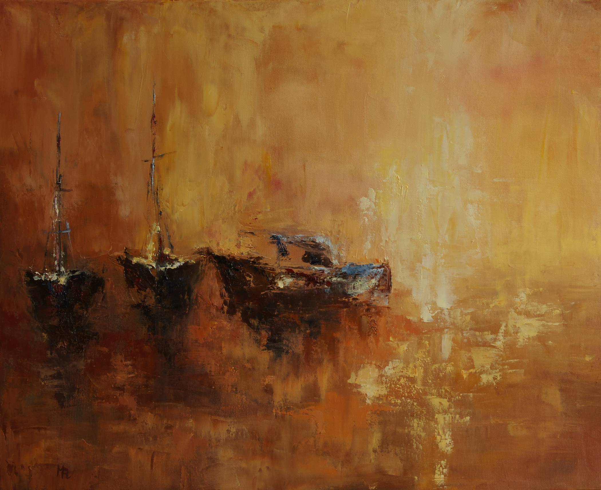 Obraz przedstawia trzy łodzie unoszące się na spokojnej tafli wody w odcieniach złota i brązu. Dominują ciepłe barwy, które przywołują myśl o zachodzącym słońcu, delikatnie rozlewając się po całym płótnie. To prawdziwe "zen" dla oczu. Rozmyte krawędzie i abstrakcyjna kompozycja nadają całości nieco tajemniczego charakteru, jakby czas stanął w miejscu. Widz może odnieść wrażenie, że zanurza się w nostalgii i wspomina letnie wieczory nad morzem. Technika użyta przez artystę to impasto, gdzie grubo nakładane warstwy farby tworzą teksturę. Miejscami pojawiają się niebieskie akcenty — przyciągają wzrok i dodają kontrastu. Trochę jakby ktoś rozlał paint na płótno w kontrolowany sposób. Dla dziecka — "Łódki pływają i jest ciepło jak latem!" Obraz może wywoływać wiele emocji, od spokoju po lekki smutek, ale przede wszystkim zachęca do refleksji nad przemijaniem czasu. Nie sposób nie zastanowić się, co skrywa horyzont. To dzieło to prawdziwe beauty.